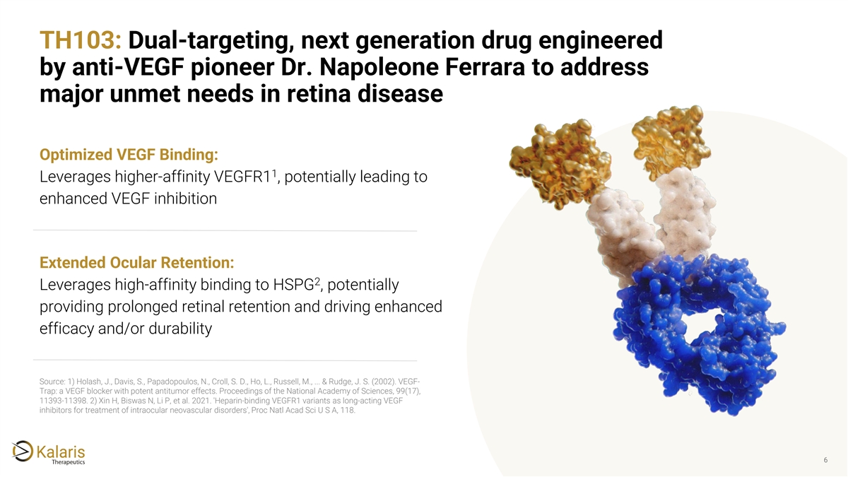 Your Vision Our Mission Kalaris is a clinical stage biopharmaceutical company dedicated to the development and commercialization of treatments for prevalent retinal diseases Our lead asset, TH103, was invented by Dr. Napoleone Ferrara, whose pioneering research established the anti-VEGF class of therapies for retinal and oncology diseases TH103 is an anti-VEGF therapeutic specifically engineered to achieve extended intraocular retention with enhanced VEGF inhibition, to address major unmet needs Napoleone Ferrara, MD Source Photography: Life Science Breakthrough Prize 3