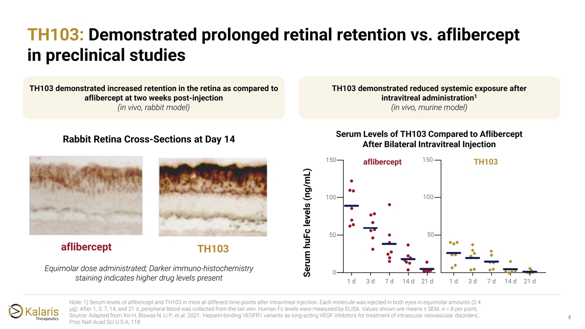 TH103: Demonstrated prolonged retinal retention vs. aflibercept in preclinical studies TH103 demonstrated increased retention in the retina as compared to TH103 demonstrated reduced systemic exposure after 1 aflibercept at two weeks post-injection intravitreal administration (in vivo, rabbit model) (in vivo, murine model) Serum Levels of TH103 Compared to Aflibercept Rabbit Retina Cross-Sections at Day 14 After Bilateral Intravitreal Injection 150 150 aflibercept TH103 100 100 50 50 aflibercept TH103 Equimolar dose administrated; Darker immuno-histochemistry 0 staining indicates higher drug levels present 1 d 3 d 7 d 14 d 21 d 1 d 3 d 7 d 14 d 21 d Note: 1) Serum levels of aflibercept and TH103 in mice at different time points after intravitreal injection. Each molecule was injected in both eyes in equimolar amounts (2.4 μg). After 1, 3, 7, 14, and 21 d, peripheral blood was collected from the tail vein. Human Fc levels were measured by ELISA. Values shown are means ± SEM. n = 8 per point; Source: Adapted from Xin H, Biswas N, Li P, et al. 2021. 'Heparin-binding VEGFR1 variants as long-acting VEGF inhibitors for treatment of intraocular neovascular disorders', 8 Proc Natl Acad Sci U S A, 118. Serum huFc levels (ng/mL)