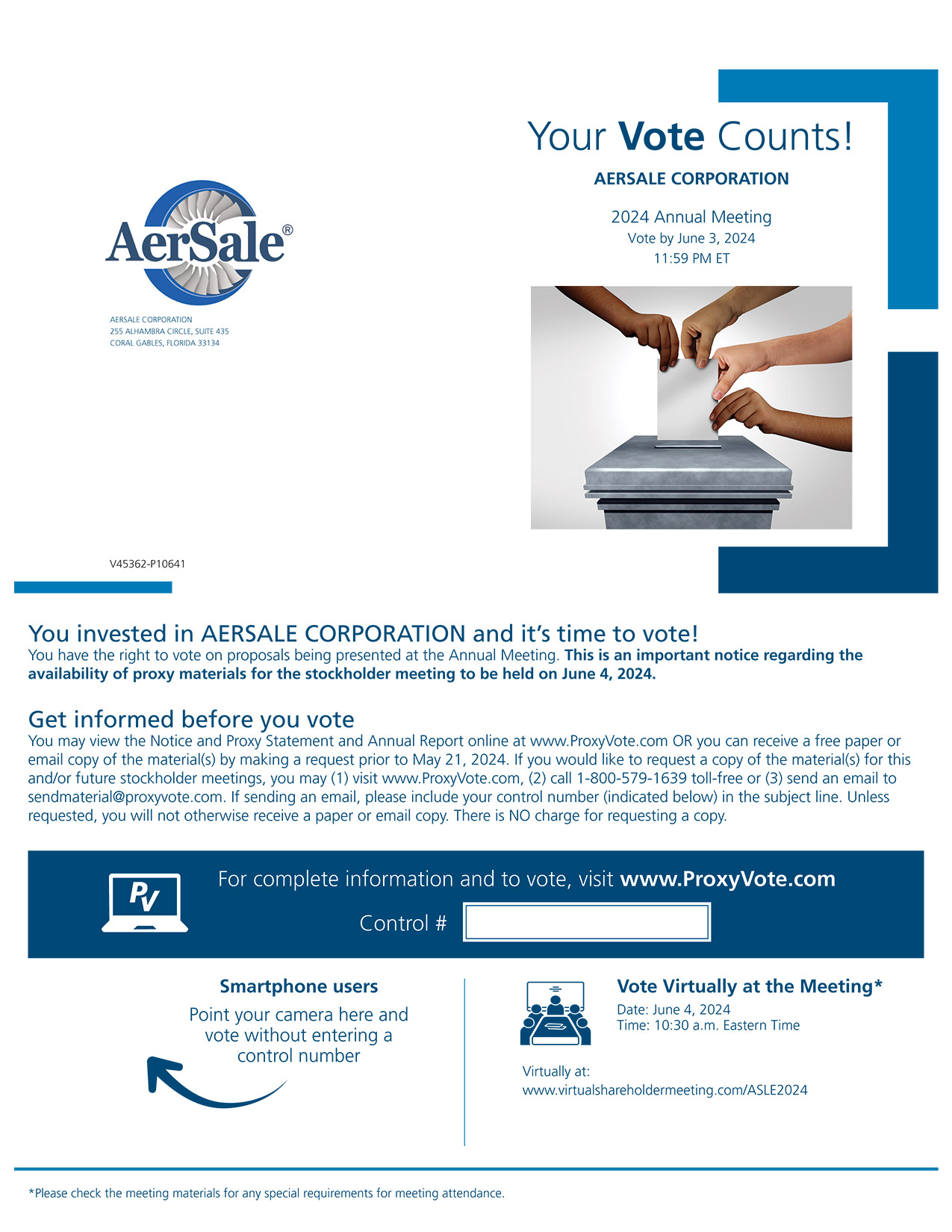Your Vote Counts! AERSALE CORPORATION 2024 Annual Meeting Vote by June 3, 2024 11:59 PM ET AERSALE CORPORATION 255 ALHAMBRA CIRCLE, SUITE 435 CORAL GABLES, FLORIDA 33134 V45362-P10641 You invested in AERSALE CORPORATION and it's time to vote! You have the right to vote on proposals being presented at the Annual Meeting. This is an important notice regarding the availability of proxy materials for the stockholder meeting to be held on June 4, 2024. Get informed before you vote You may view the Notice and Proxy Statement and Annual Report online at www.ProxyVote.com OR you can receive a free paper or email copy of the material(s) by making a request prior to May 21, 2024. If you would like to request a copy of the material(s) for this and/or future stockholder meetings, you may (1) visit www.ProxyVote.com, (2) call 1-800-579-1639 toll-free or (3) send an email to sendmaterial@proxyvote.com. If sending an email, please include your control number (indicated below) in the subject line. Unless requested, you will not otherwise receive a paper or email copy. There is NO charge for requesting a copy. For complete information and to vote, visit www.ProxyVote.com Control # Smartphone users Vote Virtually at the Meeting* Point your camera here and Date: June 4, 2024 vote without entering a Time: 10:30 a.m. Eastern Time control number Virtually at: www.virtualshareholdermeeting.com/ASLE2024 *Please check the meeting materials for any special requirements for meeting attendance.