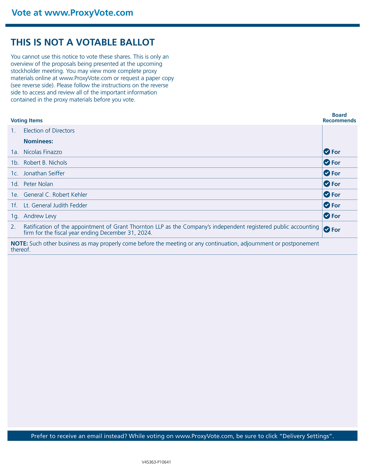 Vote at www.ProxyVote.com THIS IS NOT A VOTABLE BALLOT You cannot use this notice to vote these shares. This is only an overview of the proposals being presented at the upcoming stockholder meeting. You may view more complete proxy materials online at www.ProxyVote.com or request a paper copy (see reverse side). Please follow the instructions on the reverse side to access and review all of the important information contained in the proxy materials before you vote. Board Voting Items Recommends 1. Election of Directors Nominees: 1a. Nicolas Finazzo For 1b. Robert B. Nichols For 1c. Jonathan Seiffer For 1d. Peter Nolan For 1e. General C. Robert Kehler For 1f. Lt. General Judith Fedder For 1g. Andrew Levy For 2. Ratification of the appointment of Grant Thornton LLP as the Company’s independent registered public accounting For firm for the fiscal year ending December 31, 2024. NOTE: Such other business as may properly come before the meeting or any continuation, adjournment or postponement thereof. Prefer to receive an email instead? While voting on www.ProxyVote.com, be sure to click “Delivery Settings”. V45363-P10641