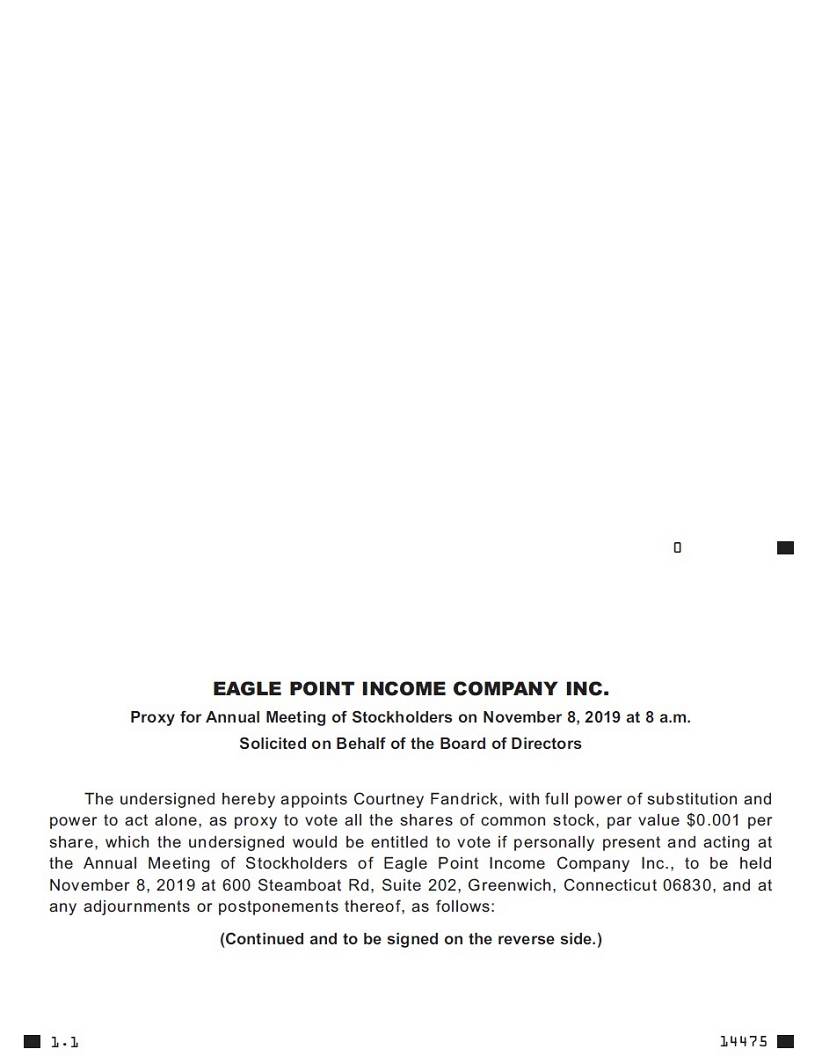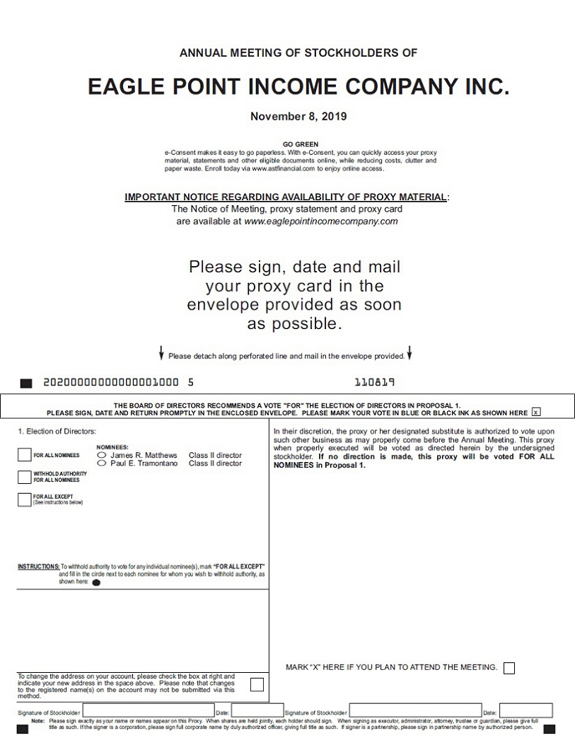 ANNUAL MEETING OF STOCKHOLDERS OF EAGLE POINT INCOME COMPANY November 8, 2019 INC. GO GREEN e-Consent makes it easy to go paperless. With e-Consent, you can quickly access your proxy material, statements and other eligible documents online, while reducing costs, clutter and paper waste. Enroll today via www.astfinancial.com to enjoy online access. IMPORTANT NOTICE REGARDING AVAILABILITY OF PROXY MATERIAL: The Notice of Meeting, proxy statement and proxy card are available at www.eaglepointincomecompany.com Please sign, date and mail your proxy card in the envelope provided as soon as possible. Please detach along perforated line and mail in the envelope provided. 20200000000000001000 5 110819 stockholder. If no direction is made, this proxy will be voted FOR ALL Note: Please sign exactly as your name or names appear on this Proxy. When shares are held jointly, each holder should sign. When signing as executor, administrator, attorney, trustee or guardian, please give full title as such. If the signer is a corporation, please sign full corporate name by duly authorized officer, giving full title as such. If signer is a partnership, please sign in partnership name by authorized person. THE BOARD OF DIRECTORS RECOMMENDS A VOTE "FOR" THE ELECTION OF DIRECTORS IN PROPOSAL 1. PLEASE SIGN, DATE AND RETURN PROMPTLY IN THE ENCLOSED ENVELOPE. PLEASE MARK YOUR VOTE IN BLUE OR BLACK INK AS SHOWN HERE x 1. Election of Directors: NOMINEES: FOR ALL NOMINEESO James R. MatthewsClass II director O Paul E. TramontanoClass II director WITHHOLD AUTHORITY FOR ALL NOMINEES FOR ALL EXCEPT (See instructions below) INSTRUCTIONS: To withhold authority to vote for any individual nominee(s), mark “FOR ALL EXCEPT” and fill in the circle next to each nominee for whom you wish to withhold authority, as shown here: In their discretion, the proxy or her designated substitute is authorized to vote upon such other business as may properly come before the Annual Meeting. This proxy when properly executed will be voted as directed herein by the undersigned NOMINEES in Proposal 1. MARK “X” HERE IF YOU PLAN TO ATTEND THE MEETING. To change the address on your account, please check the box at right and indicate your new address in the space above. Please note that changes to the registered name(s) on the account may not be submitted via this method. Signature of Stockholder Date: Signature of StockholderDate: