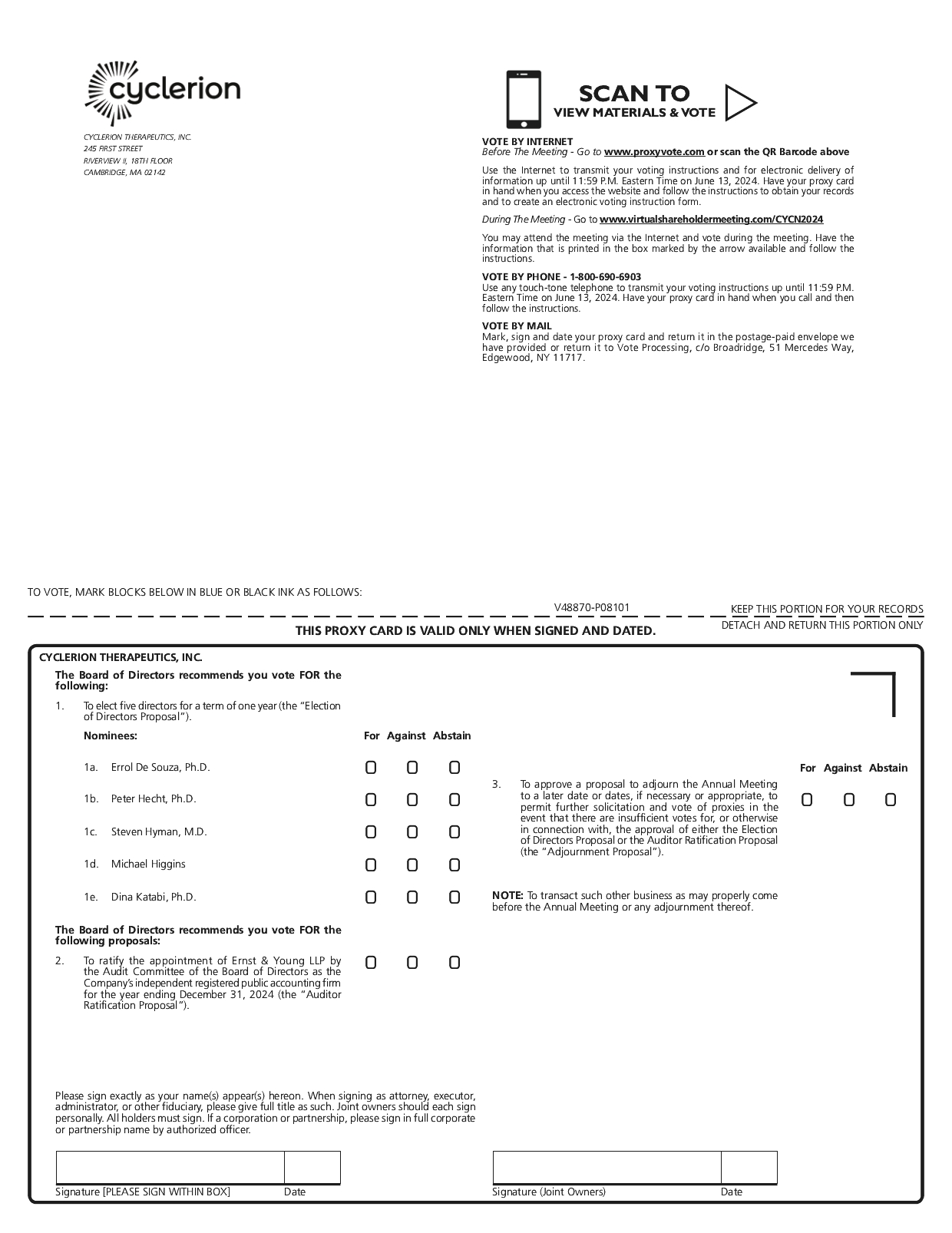 PLACE: | | | This year’s Annual Meeting of Shareholders (the “Annual Meeting”) of Cyclerion Therapeutics, Inc. (the “Company”) will be a virtual meeting, which will be conducted only via live webcast. Shareholders will only be able to participate in the Annual Meeting online, vote shares electronically and submit questions during the Annual Meeting by visiting www.virtualshareholdermeeting.com/CYCN2024. Instructions on how to attend the Annual Meeting online and vote shares are described in the accompanying materials. |