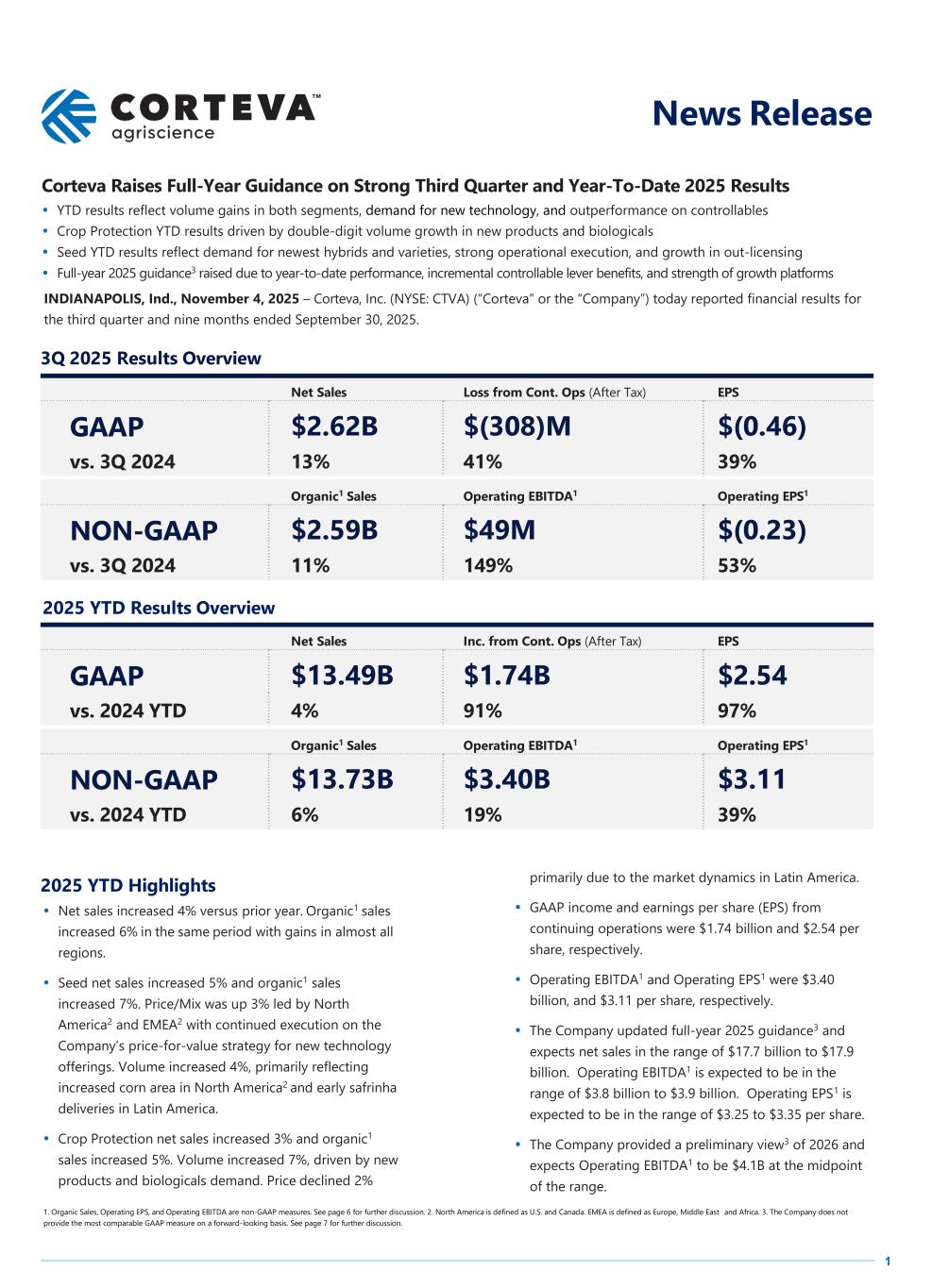 1 News Release Corteva Raises Full-Year Guidance on Strong Third Quarter and Year-To-Date 2025 Results • YTD results reflect volume gains in both segments, demand for new technology, and outperformance on controllables • Crop Protection YTD results driven by double-digit volume growth in new products and biologicals • Seed YTD results reflect demand for newest hybrids and varieties, strong operational execution, and growth in out-licensing • Full-year 2025 guidance3 raised due to year-to-date performance, incremental controllable lever benefits, and strength of growth platforms INDIANAPOLIS, Ind., November 4, 2025 – Corteva, Inc. (NYSE: CTVA) (“Corteva” or the “Company”) today reported financial results for the third quarter and nine months ended September 30, 2025. 3Q 2025 Results Overview Net Sales Loss from Cont. Ops (After Tax) EPS GAAP $2.62B $(308)M $(0.46) vs. 3Q 2024 13% 41% 39% Organic1 Sales Operating EBITDA1 Operating EPS1 NON-GAAP $2.59B $49M $(0.23) vs. 3Q 2024 11% 149% 53% 2025 YTD Results Overview Net Sales Inc. from Cont. Ops (After Tax) EPS GAAP $13.49B $1.74B $2.54 vs. 2024 YTD 4% 91% 97% Organic1 Sales Operating EBITDA1 Operating EPS1 NON-GAAP $13.73B $3.40B $3.11 vs. 2024 YTD 6% 19% 39% 2025 YTD Highlights • Net sales increased 4% versus prior year. Organic1 sales increased 6% in the same period with gains in almost all regions. • Seed net sales increased 5% and organic1 sales increased 7%. Price/Mix was up 3% led by North America2 and EMEA2 with continued execution on the Company’s price-for-value strategy for new technology offerings. Volume increased 4%, primarily reflecting increased corn area in North America2 and early safrinha deliveries in Latin America. • Crop Protection net sales increased 3% and organic1 sales increased 5%. Volume increased 7%, driven by new products and biologicals demand. Price declined 2% primarily due to the market dynamics in Latin America. • GAAP income and earnings per share (EPS) from continuing operations were $1.74 billion and $2.54 per share, respectively. • Operating EBITDA1 and Operating EPS1 were $3.40 billion, and $3.11 per share, respectively. • The Company updated full-year 2025 guidance3 and expects net sales in the range of $17.7 billion to $17.9 billion. Operating EBITDA1 is expected to be in the range of $3.8 billion to $3.9 billion. Operating EPS1 is expected to be in the range of $3.25 to $3.35 per share. • The Company provided a preliminary view3 of 2026 and expects Operating EBITDA1 to be $4.1B at the midpoint of the range. 1. Organic Sales, Operating EPS, and Operating EBITDA are non-GAAP measures. See page 6 for further discussion. 2. North America is defined as U.S. and Canada. EMEA is defined as Europe, Middle East and Africa. 3. The Company does not provide the most comparable GAAP measure on a forward-looking basis. See page 7 for further discussion.