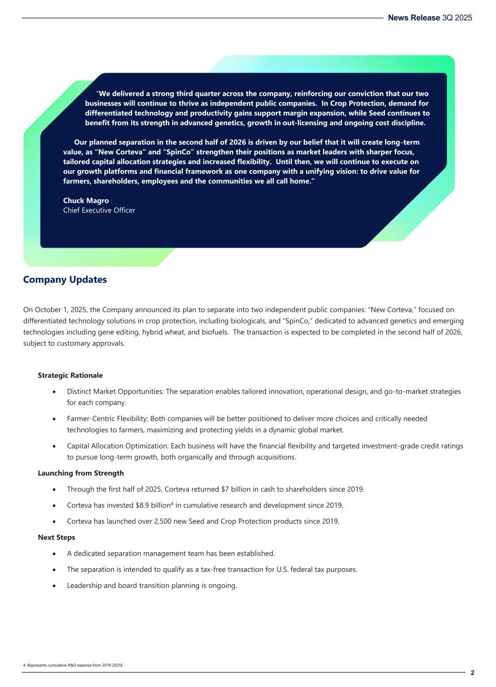 News Release 3Q 2025 2 “We delivered a strong third quarter across the company, reinforcing our conviction that our two businesses will continue to thrive as independent public companies. In Crop Protection, demand for differentiated technology and productivity gains support margin expansion, while Seed continues to benefit from its strength in advanced genetics, growth in out-licensing and ongoing cost discipline. Our planned separation in the second half of 2026 is driven by our belief that it will create long-term value, as “New Corteva” and “SpinCo” strengthen their positions as market leaders with sharper focus, tailored capital allocation strategies and increased flexibility. Until then, we will continue to execute on our growth platforms and financial framework as one company with a unifying vision: to drive value for farmers, shareholders, employees and the communities we all call home.” Chuck Magro Chief Executive Officer Company Updates On October 1, 2025, the Company announced its plan to separate into two independent public companies: “New Corteva,” focused on differentiated technology solutions in crop protection, including biologicals, and “SpinCo,” dedicated to advanced genetics and emerging technologies including gene editing, hybrid wheat, and biofuels. The transaction is expected to be completed in the second half of 2026, subject to customary approvals. Strategic Rationale • Distinct Market Opportunities: The separation enables tailored innovation, operational design, and go-to-market strategies for each company. • Farmer-Centric Flexibility: Both companies will be better positioned to deliver more choices and critically needed technologies to farmers, maximizing and protecting yields in a dynamic global market. • Capital Allocation Optimization: Each business will have the financial flexibility and targeted investment-grade credit ratings to pursue long-term growth, both organically and through acquisitions. Launching from Strength • Through the first half of 2025, Corteva returned $7 billion in cash to shareholders since 2019. • Corteva has invested $8.9 billion4 in cumulative research and development since 2019. • Corteva has launched over 2,500 new Seed and Crop Protection products since 2019. Next Steps • A dedicated separation management team has been established. • The separation is intended to qualify as a tax-free transaction for U.S. federal tax purposes. • Leadership and board transition planning is ongoing. 4. Represents cumulative R&D expense from 2019-2025E