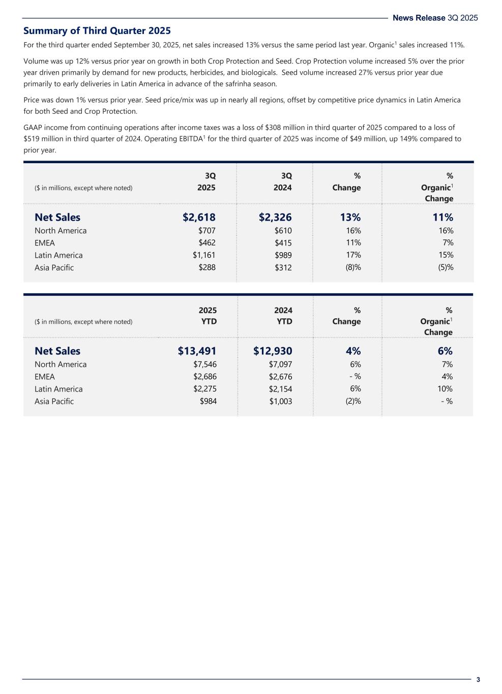 News Release 3Q 2025 3 Summary of Third Quarter 2025 For the third quarter ended September 30, 2025, net sales increased 13% versus the same period last year. Organic1 sales increased 11%. Volume was up 12% versus prior year on growth in both Crop Protection and Seed. Crop Protection volume increased 5% over the prior year driven primarily by demand for new products, herbicides, and biologicals. Seed volume increased 27% versus prior year due primarily to early deliveries in Latin America in advance of the safrinha season. Price was down 1% versus prior year. Seed price/mix was up in nearly all regions, offset by competitive price dynamics in Latin America for both Seed and Crop Protection. GAAP income from continuing operations after income taxes was a loss of $308 million in third quarter of 2025 compared to a loss of $519 million in third quarter of 2024. Operating EBITDA1 for the third quarter of 2025 was income of $49 million, up 149% compared to prior year. 3Q 3Q % % ($ in millions, except where noted) 2025 2024 Change Organic1 Change Net Sales $2,618 $2,326 13% 11% North America $707 $610 16% 16% EMEA $462 $415 11% 7% Latin America $1,161 $989 17% 15% Asia Pacific $288 $312 (8)% (5)% 2025 2024 % % ($ in millions, except where noted) YTD YTD Change Organic1 Change Net Sales $13,491 $12,930 4% 6% North America $7,546 $7,097 6% 7% EMEA $2,686 $2,676 - % 4% Latin America $2,275 $2,154 6% 10% Asia Pacific $984 $1,003 (2)% - %