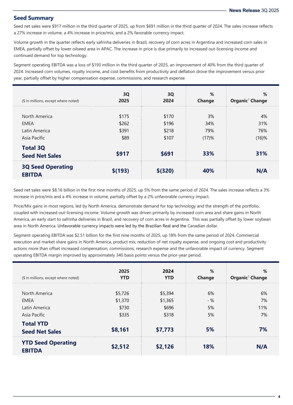 News Release 3Q 2025 4 Seed Summary Seed net sales were $917 million in the third quarter of 2025, up from $691 million in the third quarter of 2024. The sales increase reflects a 27% increase in volume, a 4% increase in price/mix, and a 2% favorable currency impact. Volume growth in the quarter reflects early safrinha deliveries in Brazil, recovery of corn acres in Argentina and increased corn sales in EMEA, partially offset by lower oilseed area in APAC. The increase in price is due primarily to increased out-licensing income and continued demand for top technology. Segment operating EBITDA was a loss of $193 million in the third quarter of 2025, an improvement of 40% from the third quarter of 2024. Increased corn volumes, royalty income, and cost benefits from productivity and deflation drove the improvement versus prior year, partially offset by higher compensation expense, commissions, and research expense. 3Q 3Q % % ($ in millions, except where noted) 2025 2024 Change Organic1 Change North America $175 $170 3% 4% EMEA $262 $196 34% 31% Latin America $391 $218 79% 76% Asia Pacific $89 $107 (17)% (16)% Total 3Q Seed Net Sales $917 $691 33% 31% 3Q Seed Operating EBITDA $(193) $(320) 40% N/A Seed net sales were $8.16 billion in the first nine months of 2025, up 5% from the same period of 2024. The sales increase reflects a 3% increase in price/mix and a 4% increase in volume, partially offset by a 2% unfavorable currency impact. Price/Mix gains in most regions, led by North America, demonstrate demand for top technology and the strength of the portfolio, coupled with increased out-licensing income. Volume growth was driven primarily by increased corn area and share gains in North America, an early start to safrinha deliveries in Brazil, and recovery of corn acres in Argentina. This was partially offset by lower soybean area in North America. Unfavorable currency impacts were led by the Brazilian Real and the Canadian dollar. Segment operating EBITDA was $2.51 billion for the first nine months of 2025, up 18% from the same period of 2024. Commercial execution and market share gains in North America, product mix, reduction of net royalty expense, and ongoing cost and productivity actions more than offset increased compensation, commissions, research expense and the unfavorable impact of currency. Segment operating EBITDA margin improved by approximately 340 basis points versus the prior-year period. 2025 2024 % % ($ in millions, except where noted) YTD YTD Change Organic1 Change North America $5,726 $5,394 6% 6% EMEA $1,370 $1,365 - % 7% Latin America $730 $696 5% 11% Asia Pacific $335 $318 5% 7% Total YTD Seed Net Sales $8,161 $7,773 5% 7% YTD Seed Operating EBITDA $2,512 $2,126 18% N/A