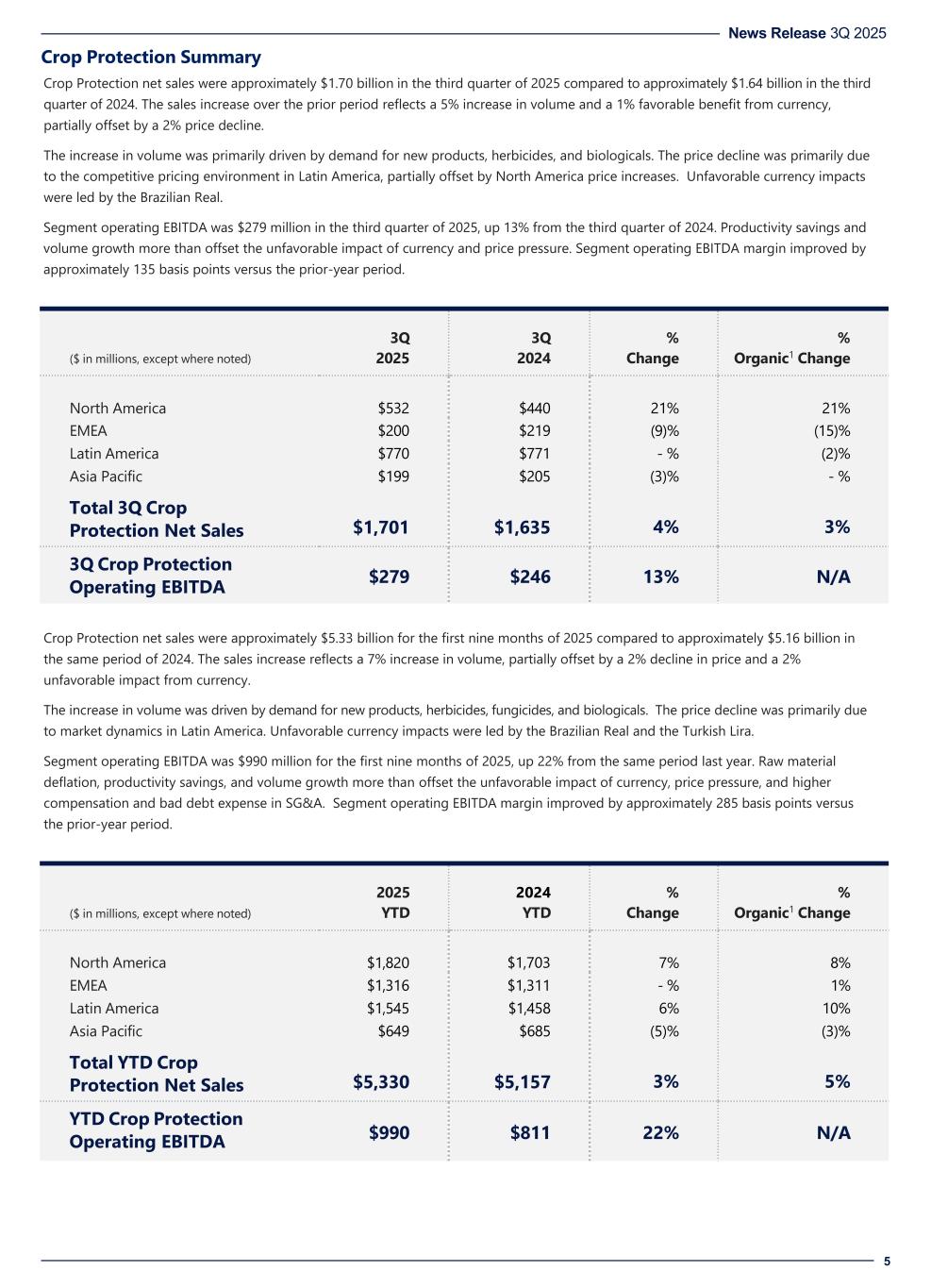 News Release 3Q 2025 5 Crop Protection Summary Crop Protection net sales were approximately $1.70 billion in the third quarter of 2025 compared to approximately $1.64 billion in the third quarter of 2024. The sales increase over the prior period reflects a 5% increase in volume and a 1% favorable benefit from currency, partially offset by a 2% price decline. The increase in volume was primarily driven by demand for new products, herbicides, and biologicals. The price decline was primarily due to the competitive pricing environment in Latin America, partially offset by North America price increases. Unfavorable currency impacts were led by the Brazilian Real. Segment operating EBITDA was $279 million in the third quarter of 2025, up 13% from the third quarter of 2024. Productivity savings and volume growth more than offset the unfavorable impact of currency and price pressure. Segment operating EBITDA margin improved by approximately 135 basis points versus the prior-year period. 3Q 3Q % % ($ in millions, except where noted) 2025 2024 Change Organic1 Change North America $532 $440 21% 21% EMEA $200 $219 (9)% (15)% Latin America $770 $771 - % (2)% Asia Pacific $199 $205 (3)% - % Total 3Q Crop Protection Net Sales $1,701 $1,635 4% 3% 3Q Crop Protection Operating EBITDA $279 $246 13% N/A Crop Protection net sales were approximately $5.33 billion for the first nine months of 2025 compared to approximately $5.16 billion in the same period of 2024. The sales increase reflects a 7% increase in volume, partially offset by a 2% decline in price and a 2% unfavorable impact from currency. The increase in volume was driven by demand for new products, herbicides, fungicides, and biologicals. The price decline was primarily due to market dynamics in Latin America. Unfavorable currency impacts were led by the Brazilian Real and the Turkish Lira. Segment operating EBITDA was $990 million for the first nine months of 2025, up 22% from the same period last year. Raw material deflation, productivity savings, and volume growth more than offset the unfavorable impact of currency, price pressure, and higher compensation and bad debt expense in SG&A. Segment operating EBITDA margin improved by approximately 285 basis points versus the prior-year period. 2025 2024 % % ($ in millions, except where noted) YTD YTD Change Organic1 Change North America $1,820 $1,703 7% 8% EMEA $1,316 $1,311 - % 1% Latin America $1,545 $1,458 6% 10% Asia Pacific $649 $685 (5)% (3)% Total YTD Crop Protection Net Sales $5,330 $5,157 3% 5% YTD Crop Protection Operating EBITDA $990 $811 22% N/A