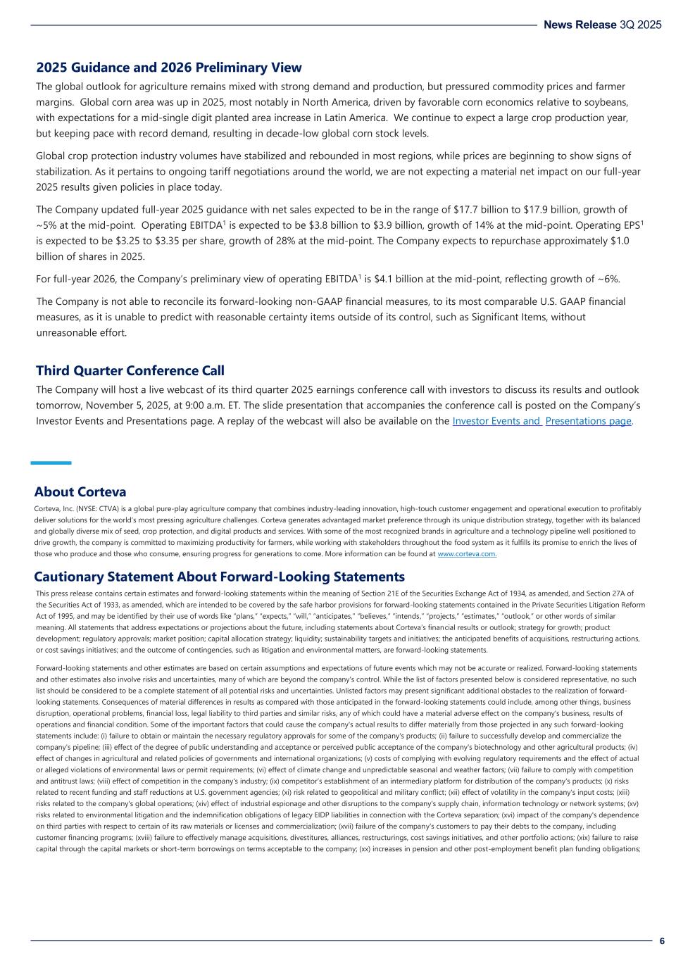 News Release 3Q 2025 6 2025 Guidance and 2026 Preliminary View The global outlook for agriculture remains mixed with strong demand and production, but pressured commodity prices and farmer margins. Global corn area was up in 2025, most notably in North America, driven by favorable corn economics relative to soybeans, with expectations for a mid-single digit planted area increase in Latin America. We continue to expect a large crop production year, but keeping pace with record demand, resulting in decade-low global corn stock levels. Global crop protection industry volumes have stabilized and rebounded in most regions, while prices are beginning to show signs of stabilization. As it pertains to ongoing tariff negotiations around the world, we are not expecting a material net impact on our full-year 2025 results given policies in place today. The Company updated full-year 2025 guidance with net sales expected to be in the range of $17.7 billion to $17.9 billion, growth of ~5% at the mid-point. Operating EBITDA1 is expected to be $3.8 billion to $3.9 billion, growth of 14% at the mid-point. Operating EPS1 is expected to be $3.25 to $3.35 per share, growth of 28% at the mid-point. The Company expects to repurchase approximately $1.0 billion of shares in 2025. For full-year 2026, the Company’s preliminary view of operating EBITDA1 is $4.1 billion at the mid-point, reflecting growth of ~6%. The Company is not able to reconcile its forward-looking non-GAAP financial measures, to its most comparable U.S. GAAP financial measures, as it is unable to predict with reasonable certainty items outside of its control, such as Significant Items, without unreasonable effort. Third Quarter Conference Call The Company will host a live webcast of its third quarter 2025 earnings conference call with investors to discuss its results and outlook tomorrow, November 5, 2025, at 9:00 a.m. ET. The slide presentation that accompanies the conference call is posted on the Company’s Investor Events and Presentations page. A replay of the webcast will also be available on the Investor Events and Presentations page. About Corteva Corteva, Inc. (NYSE: CTVA) is a global pure-play agriculture company that combines industry-leading innovation, high-touch customer engagement and operational execution to profitably deliver solutions for the world’s most pressing agriculture challenges. Corteva generates advantaged market preference through its unique distribution strategy, together with its balanced and globally diverse mix of seed, crop protection, and digital products and services. With some of the most recognized brands in agriculture and a technology pipeline well positioned to drive growth, the company is committed to maximizing productivity for farmers, while working with stakeholders throughout the food system as it fulfills its promise to enrich the lives of those who produce and those who consume, ensuring progress for generations to come. More information can be found at www.corteva.com. Cautionary Statement About Forward-Looking Statements This press release contains certain estimates and forward-looking statements within the meaning of Section 21E of the Securities Exchange Act of 1934, as amended, and Section 27A of the Securities Act of 1933, as amended, which are intended to be covered by the safe harbor provisions for forward-looking statements contained in the Private Securities Litigation Reform Act of 1995, and may be identified by their use of words like “plans,” “expects,” “will,” “anticipates,” “believes,” “intends,” “projects,” “estimates,” “outlook,” or other words of similar meaning. All statements that address expectations or projections about the future, including statements about Corteva’s financial results or outlook; strategy for growth; product development; regulatory approvals; market position; capital allocation strategy; liquidity; sustainability targets and initiatives; the anticipated benefits of acquisitions, restructuring actions, or cost savings initiatives; and the outcome of contingencies, such as litigation and environmental matters, are forward-looking statements. Forward-looking statements and other estimates are based on certain assumptions and expectations of future events which may not be accurate or realized. Forward-looking statements and other estimates also involve risks and uncertainties, many of which are beyond the company's control. While the list of factors presented below is considered representative, no such list should be considered to be a complete statement of all potential risks and uncertainties. Unlisted factors may present significant additional obstacles to the realization of forward- looking statements. Consequences of material differences in results as compared with those anticipated in the forward-looking statements could include, among other things, business disruption, operational problems, financial loss, legal liability to third parties and similar risks, any of which could have a material adverse effect on the company's business, results of operations and financial condition. Some of the important factors that could cause the company's actual results to differ materially from those projected in any such forward-looking statements include: (i) failure to obtain or maintain the necessary regulatory approvals for some of the company's products; (ii) failure to successfully develop and commercialize the company's pipeline; (iii) effect of the degree of public understanding and acceptance or perceived public acceptance of the company's biotechnology and other agricultural products; (iv) effect of changes in agricultural and related policies of governments and international organizations; (v) costs of complying with evolving regulatory requirements and the effect of actual or alleged violations of environmental laws or permit requirements; (vi) effect of climate change and unpredictable seasonal and weather factors; 