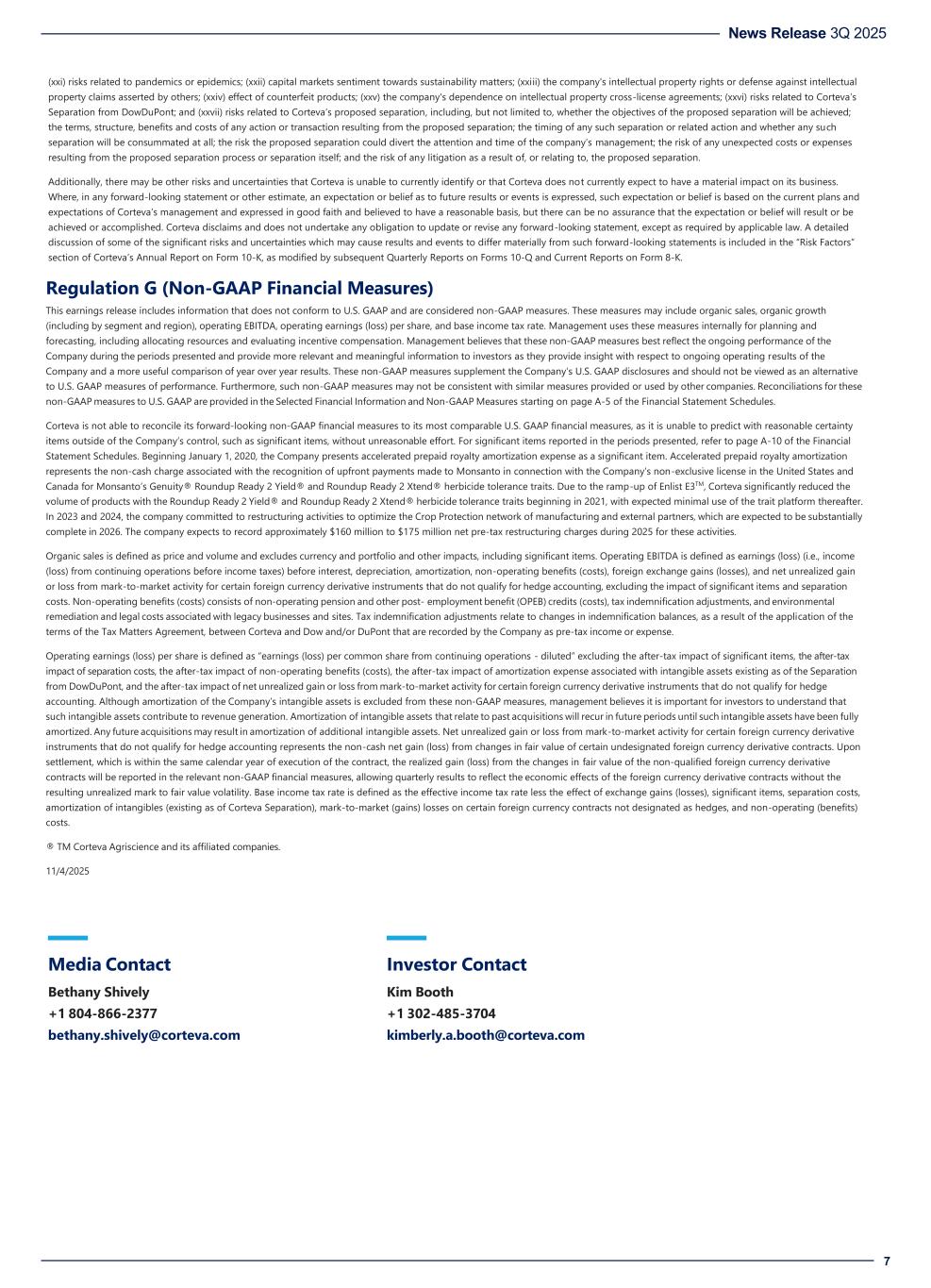 News Release 3Q 2025 7 (xxi) risks related to pandemics or epidemics; (xxii) capital markets sentiment towards sustainability matters; (xxiii) the company's intellectual property rights or defense against intellectual property claims asserted by others; (xxiv) effect of counterfeit products; (xxv) the company's dependence on intellectual property cross-license agreements; (xxvi) risks related to Corteva’s Separation from DowDuPont; and (xxvii) risks related to Corteva’s proposed separation, including, but not limited to, whether the objectives of the proposed separation will be achieved; the terms, structure, benefits and costs of any action or transaction resulting from the proposed separation; the timing of any such separation or related action and whether any such separation will be consummated at all; the risk the proposed separation could divert the attention and time of the company’s management; the risk of any unexpected costs or expenses resulting from the proposed separation process or separation itself; and the risk of any litigation as a result of, or relating to, the proposed separation. Additionally, there may be other risks and uncertainties that Corteva is unable to currently identify or that Corteva does not currently expect to have a material impact on its business. Where, in any forward-looking statement or other estimate, an expectation or belief as to future results or events is expressed, such expectation or belief is based on the current plans and expectations of Corteva’s management and expressed in good faith and believed to have a reasonable basis, but there can be no assurance that the expectation or belief will result or be achieved or accomplished. Corteva disclaims and does not undertake any obligation to update or revise any forward-looking statement, except as required by applicable law. A detailed discussion of some of the significant risks and uncertainties which may cause results and events to differ materially from such forward-looking statements is included in the “Risk Factors” section of Corteva’s Annual Report on Form 10-K, as modified by subsequent Quarterly Reports on Forms 10-Q and Current Reports on Form 8-K. Regulation G (Non-GAAP Financial Measures) This earnings release includes information that does not conform to U.S. GAAP and are considered non-GAAP measures. These measures may include organic sales, organic growth (including by segment and region), operating EBITDA, operating earnings (loss) per share, and base income tax rate. Management uses these measures internally for planning and forecasting, including allocating resources and evaluating incentive compensation. Management believes that these non-GAAP measures best reflect the ongoing performance of the Company during the periods presented and provide more relevant and meaningful information to investors as they provide insight with respect to ongoing operating results of the Company and a more useful comparison of year over year results. These non-GAAP measures supplement the Company’s U.S. GAAP disclosures and should not be viewed as an alternative to U.S. GAAP measures of performance. Furthermore, such non-GAAP measures may not be consistent with similar measures provided or used by other companies. Reconciliations for these non-GAAP measures to U.S. GAAP are provided in the Selected Financial Information and Non-GAAP Measures starting on page A-5 of the Financial Statement Schedules. Corteva is not able to reconcile its forward-looking non-GAAP financial measures to its most comparable U.S. GAAP financial measures, as it is unable to predict with reasonable certainty items outside of the Company’s control, such as significant items, without unreasonable effort. For significant items reported in the periods presented, refer to page A-10 of the Financial Statement Schedules. Beginning January 1, 2020, the Company presents accelerated prepaid royalty amortization expense as a significant item. Accelerated prepaid royalty amortization represents the non-cash charge associated with the recognition of upfront payments made to Monsanto in connection with the Company’s non-exclusive license in the United States and Canada for Monsanto’s Genuity® Roundup Ready 2 Yield® and Roundup Ready 2 Xtend® herbicide tolerance traits. Due to the ramp-up of Enlist E3TM, Corteva significantly reduced the volume of products with the Roundup Ready 2 Yield® and Roundup Ready 2 Xtend® herbicide tolerance traits beginning in 2021, with expected minimal use of the trait platform thereafter. In 2023 and 2024, the company committed to restructuring activities to optimize the Crop Protection network of manufacturing and external partners, which are expected to be substantially complete in 2026. The company expects to record approximately $160 million to $175 million net pre-tax restructuring charges during 2025 for these activities. Organic sales is defined as price and volume and excludes currency and portfolio and other impacts, including significant items. Operating EBITDA is defined as earnings (loss) (i.e., income (loss) from continuing operations before income taxes) before interest, depreciation, amortization, non-operating benefits (costs), foreign exchange gains (losses), and net unrealized gain or loss from mark-to-market activity for certain foreign currency derivative instruments that do not qualify for hedge accounting, excluding the impact of significant items and separation costs. Non-operating benefits (costs) consists of non-operating pension and other post- employment benefit (OPEB) credits (costs), tax indemnification adjustments, and environmental remediation and legal costs associated with legacy businesses and sites. Tax indemnification adjustments relate to changes in indemnification balances, as a result of the application of the terms of the Tax Matters Agreement, between Corteva and Dow and/or DuPont that are recorded by the Company as pre-tax income or expen