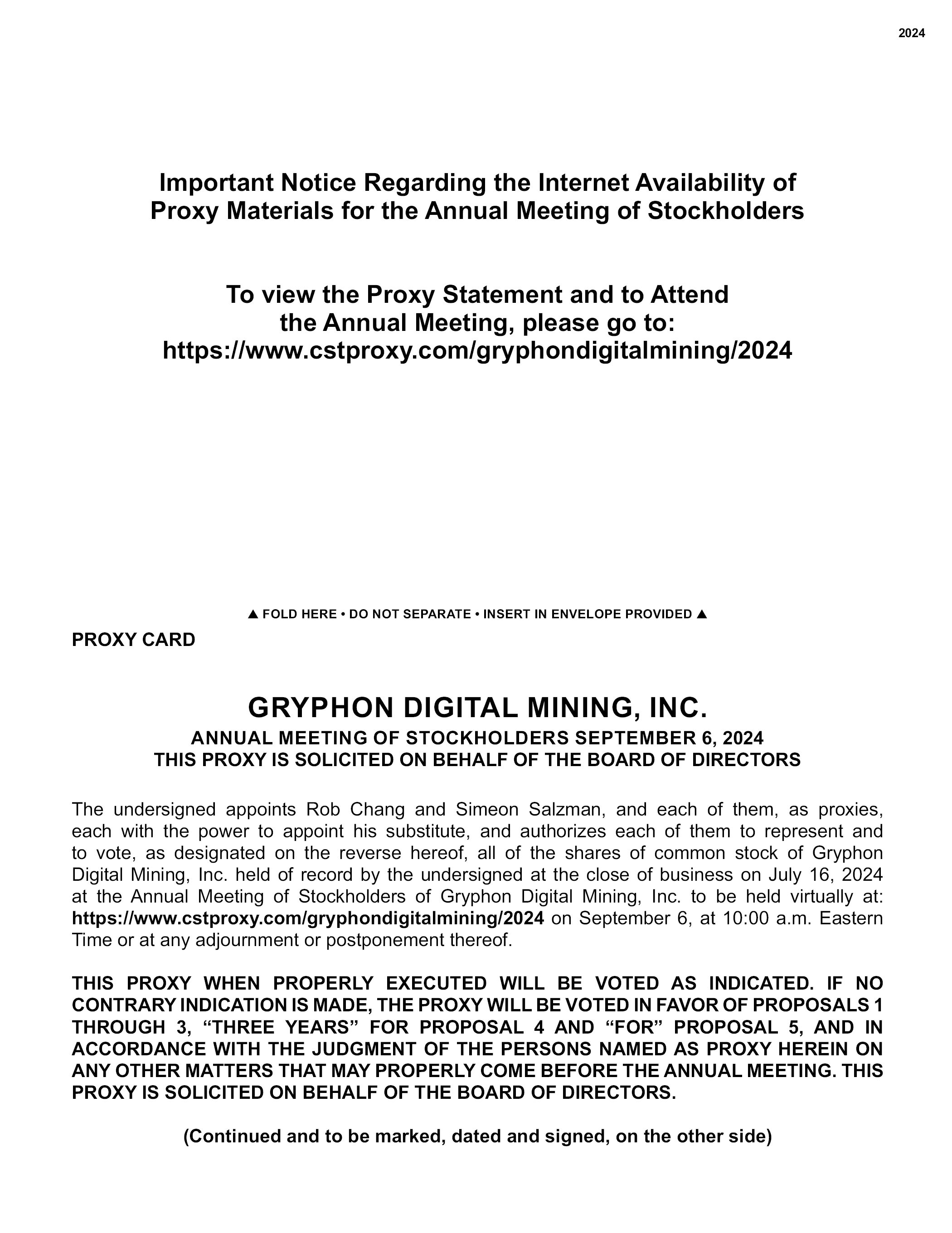 2024 Important Notice Regarding the Internet Availability of Proxy Materials for the Annual Meeting of Stockholders To view the Proxy Statement and to Attend the Annual Meeting, please go to: https://www.cstproxy.com/gryphondigitalmining/2024 FOLD HERE DO NOT SEPARATE INSERT IN ENVELOPE PROVIDED PROXY CARD GRYPHON DIGITAL MINING, INC. ANNUAL MEETING OF STOCKHOLDERS SEPTEMBER 6, 2024 THIS PROXY IS SOLICITED ON BEHALF OF THE BOARD OF DIRECTORS The undersigned appoints Rob Chang and Simeon Salzman, and each of them, as proxies, each with the power to appoint his substitute, and authorizes each of them to represent and to vote, as designated on the reverse hereof, all of the shares of common stock of Gryphon Digital Mining, Inc. held of record by the undersigned at the close of business on July 16, 2024 at the Annual Meeting of Stockholders of Gryphon Digital Mining, Inc. to be held virtually at: https://www.cstproxy.com/gryphondigitalmining/2024 on September 6, at 10:00 a.m. Eastern Time or at any adjournment or postponement thereof. THIS PROXY WHEN PROPERLY EXECUTED WILL BE VOTED AS INDICATED. IF NO CONTRARY INDICATION IS MADE, THE PROXY WILL BE VOTED IN FAVOR OF PROPOSALS 1 THROUGH 3, “THREE YEARS” FOR PROPOSAL 4 AND “FOR” PROPOSAL 5, AND IN ACCORDANCE WITH THE JUDGMENT OF THE PERSONS NAMED AS PROXY HEREIN ON ANY OTHER MATTERS THAT MAY PROPERLY COME BEFORE THE ANNUAL MEETING. THIS PROXY IS SOLICITED ON BEHALF OF THE BOARD OF DIRECTORS. (Continued and to be marked, dated and signed, on the other side)