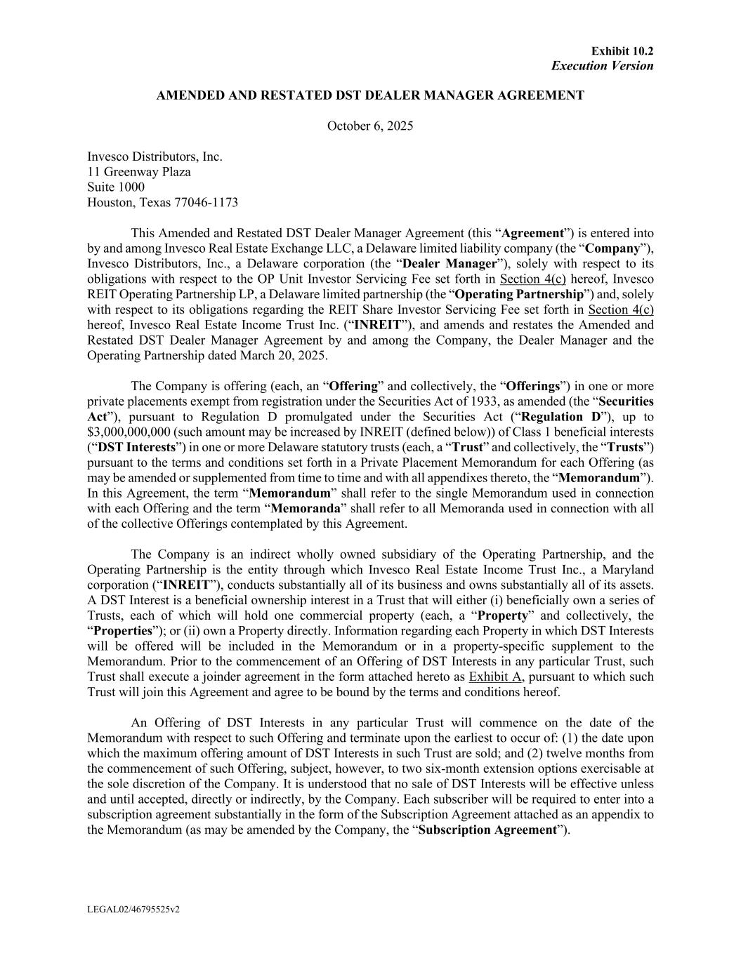 Exhibit 10.2 Execution Version LEGAL02/46795525v2 AMENDED AND RESTATED DST DEALER MANAGER AGREEMENT October 6, 2025 Invesco Distributors, Inc. 11 Greenway Plaza Suite 1000 Houston, Texas 77046-1173 This Amended and Restated DST Dealer Manager Agreement (this “Agreement”) is entered into by and among Invesco Real Estate Exchange LLC, a Delaware limited liability company (the “Company”), Invesco Distributors, Inc., a Delaware corporation (the “Dealer Manager”), solely with respect to its obligations with respect to the OP Unit Investor Servicing Fee set forth in Section 4(c) hereof, Invesco REIT Operating Partnership LP, a Delaware limited partnership (the “Operating Partnership”) and, solely with respect to its obligations regarding the REIT Share Investor Servicing Fee set forth in Section 4(c) hereof, Invesco Real Estate Income Trust Inc. (“INREIT”), and amends and restates the Amended and Restated DST Dealer Manager Agreement by and among the Company, the Dealer Manager and the Operating Partnership dated March 20, 2025. The Company is offering (each, an “Offering” and collectively, the “Offerings”) in one or more private placements exempt from registration under the Securities Act of 1933, as amended (the “Securities Act”), pursuant to Regulation D promulgated under the Securities Act (“Regulation D”), up to $3,000,000,000 (such amount may be increased by INREIT (defined below)) of Class 1 beneficial interests (“DST Interests”) in one or more Delaware statutory trusts (each, a “Trust” and collectively, the “Trusts”) pursuant to the terms and conditions set forth in a Private Placement Memorandum for each Offering (as may be amended or supplemented from time to time and with all appendixes thereto, the “Memorandum”). In this Agreement, the term “Memorandum” shall refer to the single Memorandum used in connection with each Offering and the term “Memoranda” shall refer to all Memoranda used in connection with all of the collective Offerings contemplated by this Agreement. The Company is an indirect wholly owned subsidiary of the Operating Partnership, and the Operating Partnership is the entity through which Invesco Real Estate Income Trust Inc., a Maryland corporation (“INREIT”), conducts substantially all of its business and owns substantially all of its assets. A DST Interest is a beneficial ownership interest in a Trust that will either (i) beneficially own a series of Trusts, each of which will hold one commercial property (each, a “Property” and collectively, the “Properties”); or (ii) own a Property directly. Information regarding each Property in which DST Interests will be offered will be included in the Memorandum or in a property-specific supplement to the Memorandum. Prior to the commencement of an Offering of DST Interests in any particular Trust, such Trust shall execute a joinder agreement in the form attached hereto as Exhibit A, pursuant to which such Trust will join this Agreement and agree to be bound by the terms and conditions hereof. An Offering of DST Interests in any particular Trust will commence on the date of the Memorandum with respect to such Offering and terminate upon the earliest to occur of: (1) the date upon which the maximum offering amount of DST Interests in such Trust are sold; and (2) twelve months from the commencement of such Offering, subject, however, to two six-month extension options exercisable at the sole discretion of the Company. It is understood that no sale of DST Interests will be effective unless and until accepted, directly or indirectly, by the Company. Each subscriber will be required to enter into a subscription agreement substantially in the form of the Subscription Agreement attached as an appendix to the Memorandum (as may be amended by the Company, the “Subscription Agreement”).