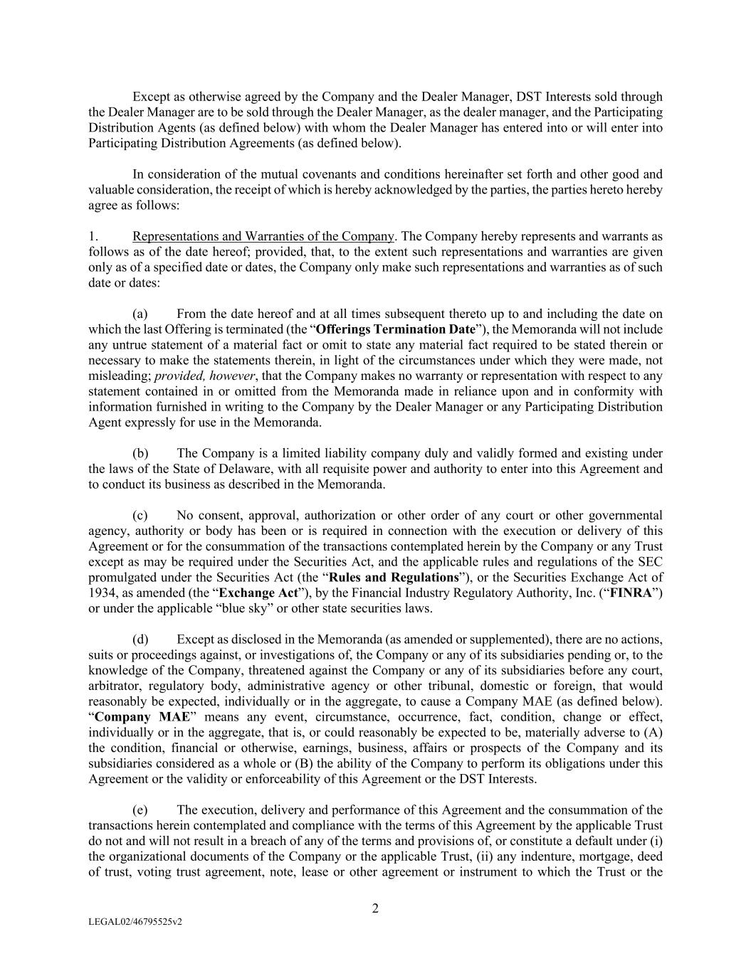 2 LEGAL02/46795525v2 Except as otherwise agreed by the Company and the Dealer Manager, DST Interests sold through the Dealer Manager are to be sold through the Dealer Manager, as the dealer manager, and the Participating Distribution Agents (as defined below) with whom the Dealer Manager has entered into or will enter into Participating Distribution Agreements (as defined below). In consideration of the mutual covenants and conditions hereinafter set forth and other good and valuable consideration, the receipt of which is hereby acknowledged by the parties, the parties hereto hereby agree as follows: 1. Representations and Warranties of the Company. The Company hereby represents and warrants as follows as of the date hereof; provided, that, to the extent such representations and warranties are given only as of a specified date or dates, the Company only make such representations and warranties as of such date or dates: (a) From the date hereof and at all times subsequent thereto up to and including the date on which the last Offering is terminated (the “Offerings Termination Date”), the Memoranda will not include any untrue statement of a material fact or omit to state any material fact required to be stated therein or necessary to make the statements therein, in light of the circumstances under which they were made, not misleading; provided, however, that the Company makes no warranty or representation with respect to any statement contained in or omitted from the Memoranda made in reliance upon and in conformity with information furnished in writing to the Company by the Dealer Manager or any Participating Distribution Agent expressly for use in the Memoranda. (b) The Company is a limited liability company duly and validly formed and existing under the laws of the State of Delaware, with all requisite power and authority to enter into this Agreement and to conduct its business as described in the Memoranda. (c) No consent, approval, authorization or other order of any court or other governmental agency, authority or body has been or is required in connection with the execution or delivery of this Agreement or for the consummation of the transactions contemplated herein by the Company or any Trust except as may be required under the Securities Act, and the applicable rules and regulations of the SEC promulgated under the Securities Act (the “Rules and Regulations”), or the Securities Exchange Act of 1934, as amended (the “Exchange Act”), by the Financial Industry Regulatory Authority, Inc. (“FINRA”) or under the applicable “blue sky” or other state securities laws. (d) Except as disclosed in the Memoranda (as amended or supplemented), there are no actions, suits or proceedings against, or investigations of, the Company or any of its subsidiaries pending or, to the knowledge of the Company, threatened against the Company or any of its subsidiaries before any court, arbitrator, regulatory body, administrative agency or other tribunal, domestic or foreign, that would reasonably be expected, individually or in the aggregate, to cause a Company MAE (as defined below). “Company MAE” means any event, circumstance, occurrence, fact, condition, change or effect, individually or in the aggregate, that is, or could reasonably be expected to be, materially adverse to (A) the condition, financial or otherwise, earnings, business, affairs or prospects of the Company and its subsidiaries considered as a whole or (B) the ability of the Company to perform its obligations under this Agreement or the validity or enforceability of this Agreement or the DST Interests. (e) The execution, delivery and performance of this Agreement and the consummation of the transactions herein contemplated and compliance with the terms of this Agreement by the applicable Trust do not and will not result in a breach of any of the terms and provisions of, or constitute a default under (i) the organizational documents of the Company or the applicable Trust, (ii) any indenture, mortgage, deed of trust, voting trust agreement, note, lease or other agreement or instrument to which the Trust or the