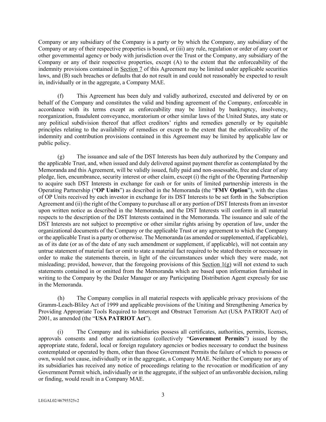 3 LEGAL02/46795525v2 Company or any subsidiary of the Company is a party or by which the Company, any subsidiary of the Company or any of their respective properties is bound, or (iii) any rule, regulation or order of any court or other governmental agency or body with jurisdiction over the Trust or the Company, any subsidiary of the Company or any of their respective properties, except (A) to the extent that the enforceability of the indemnity provisions contained in Section 7 of this Agreement may be limited under applicable securities laws, and (B) such breaches or defaults that do not result in and could not reasonably be expected to result in, individually or in the aggregate, a Company MAE. (f) This Agreement has been duly and validly authorized, executed and delivered by or on behalf of the Company and constitutes the valid and binding agreement of the Company, enforceable in accordance with its terms except as enforceability may be limited by bankruptcy, insolvency, reorganization, fraudulent conveyance, moratorium or other similar laws of the United States, any state or any political subdivision thereof that affect creditors’ rights and remedies generally or by equitable principles relating to the availability of remedies or except to the extent that the enforceability of the indemnity and contribution provisions contained in this Agreement may be limited by applicable law or public policy. (g) The issuance and sale of the DST Interests has been duly authorized by the Company and the applicable Trust, and, when issued and duly delivered against payment therefor as contemplated by the Memoranda and this Agreement, will be validly issued, fully paid and non-assessable, free and clear of any pledge, lien, encumbrance, security interest or other claim, except (i) the right of the Operating Partnership to acquire such DST Interests in exchange for cash or for units of limited partnership interests in the Operating Partnership (“OP Units”) as described in the Memoranda (the “FMV Option”), with the class of OP Units received by each investor in exchange for its DST Interests to be set forth in the Subscription Agreement and (ii) the right of the Company to purchase all or any portion of DST Interests from an investor upon written notice as described in the Memoranda, and the DST Interests will conform in all material respects to the description of the DST Interests contained in the Memoranda. The issuance and sale of the DST Interests are not subject to preemptive or other similar rights arising by operation of law, under the organizational documents of the Company or the applicable Trust or any agreement to which the Company or the applicable Trust is a party or otherwise. The Memoranda (as amended or supplemented, if applicable), as of its date (or as of the date of any such amendment or supplement, if applicable), will not contain any untrue statement of material fact or omit to state a material fact required to be stated therein or necessary in order to make the statements therein, in light of the circumstances under which they were made, not misleading; provided, however, that the foregoing provisions of this Section 1(g) will not extend to such statements contained in or omitted from the Memoranda which are based upon information furnished in writing to the Company by the Dealer Manager or any Participating Distribution Agent expressly for use in the Memoranda. (h) The Company complies in all material respects with applicable privacy provisions of the Gramm-Leach-Bliley Act of 1999 and applicable provisions of the Uniting and Strengthening America by Providing Appropriate Tools Required to Intercept and Obstruct Terrorism Act (USA PATRIOT Act) of 2001, as amended (the “USA PATRIOT Act”). (i) The Company and its subsidiaries possess all certificates, authorities, permits, licenses, approvals consents and other authorizations (collectively “Government Permits”) issued by the appropriate state, federal, local or foreign regulatory agencies or bodies necessary to conduct the business contemplated or operated by them, other than those Government Permits the failure of which to possess or own, would not cause, individually or in the aggregate, a Company MAE. Neither the Company nor any of its subsidiaries has received any notice of proceedings relating to the revocation or modification of any Government Permit which, individually or in the aggregate, if the subject of an unfavorable decision, ruling or finding, would result in a Company MAE.