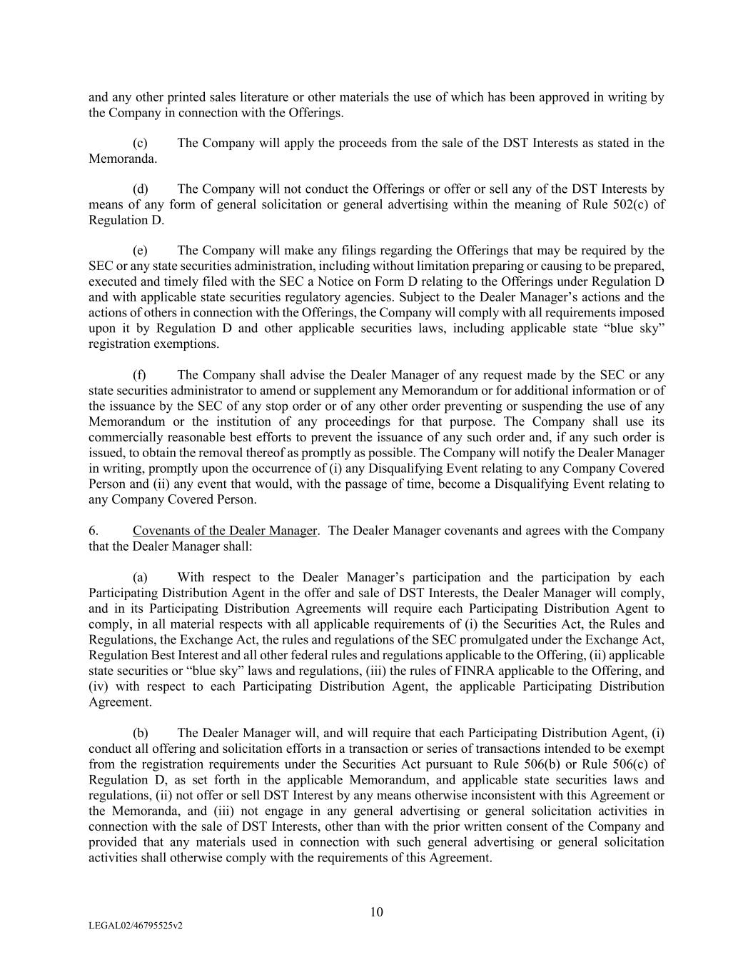 10 LEGAL02/46795525v2 and any other printed sales literature or other materials the use of which has been approved in writing by the Company in connection with the Offerings. (c) The Company will apply the proceeds from the sale of the DST Interests as stated in the Memoranda. (d) The Company will not conduct the Offerings or offer or sell any of the DST Interests by means of any form of general solicitation or general advertising within the meaning of Rule 502(c) of Regulation D. (e) The Company will make any filings regarding the Offerings that may be required by the SEC or any state securities administration, including without limitation preparing or causing to be prepared, executed and timely filed with the SEC a Notice on Form D relating to the Offerings under Regulation D and with applicable state securities regulatory agencies. Subject to the Dealer Manager’s actions and the actions of others in connection with the Offerings, the Company will comply with all requirements imposed upon it by Regulation D and other applicable securities laws, including applicable state “blue sky” registration exemptions. (f) The Company shall advise the Dealer Manager of any request made by the SEC or any state securities administrator to amend or supplement any Memorandum or for additional information or of the issuance by the SEC of any stop order or of any other order preventing or suspending the use of any Memorandum or the institution of any proceedings for that purpose. The Company shall use its commercially reasonable best efforts to prevent the issuance of any such order and, if any such order is issued, to obtain the removal thereof as promptly as possible. The Company will notify the Dealer Manager in writing, promptly upon the occurrence of (i) any Disqualifying Event relating to any Company Covered Person and (ii) any event that would, with the passage of time, become a Disqualifying Event relating to any Company Covered Person. 6. Covenants of the Dealer Manager. The Dealer Manager covenants and agrees with the Company that the Dealer Manager shall: (a) With respect to the Dealer Manager’s participation and the participation by each Participating Distribution Agent in the offer and sale of DST Interests, the Dealer Manager will comply, and in its Participating Distribution Agreements will require each Participating Distribution Agent to comply, in all material respects with all applicable requirements of (i) the Securities Act, the Rules and Regulations, the Exchange Act, the rules and regulations of the SEC promulgated under the Exchange Act, Regulation Best Interest and all other federal rules and regulations applicable to the Offering, (ii) applicable state securities or “blue sky” laws and regulations, (iii) the rules of FINRA applicable to the Offering, and (iv) with respect to each Participating Distribution Agent, the applicable Participating Distribution Agreement. (b) The Dealer Manager will, and will require that each Participating Distribution Agent, (i) conduct all offering and solicitation efforts in a transaction or series of transactions intended to be exempt from the registration requirements under the Securities Act pursuant to Rule 506(b) or Rule 506(c) of Regulation D, as set forth in the applicable Memorandum, and applicable state securities laws and regulations, (ii) not offer or sell DST Interest by any means otherwise inconsistent with this Agreement or the Memoranda, and (iii) not engage in any general advertising or general solicitation activities in connection with the sale of DST Interests, other than with the prior written consent of the Company and provided that any materials used in connection with such general advertising or general solicitation activities shall otherwise comply with the requirements of this Agreement.