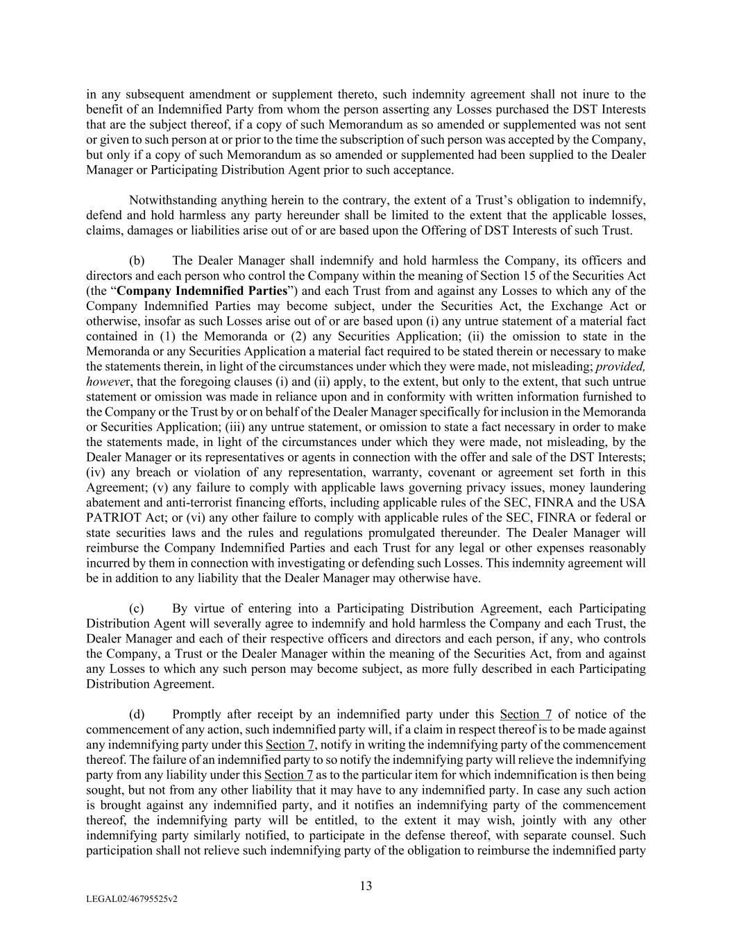 13 LEGAL02/46795525v2 in any subsequent amendment or supplement thereto, such indemnity agreement shall not inure to the benefit of an Indemnified Party from whom the person asserting any Losses purchased the DST Interests that are the subject thereof, if a copy of such Memorandum as so amended or supplemented was not sent or given to such person at or prior to the time the subscription of such person was accepted by the Company, but only if a copy of such Memorandum as so amended or supplemented had been supplied to the Dealer Manager or Participating Distribution Agent prior to such acceptance. Notwithstanding anything herein to the contrary, the extent of a Trust’s obligation to indemnify, defend and hold harmless any party hereunder shall be limited to the extent that the applicable losses, claims, damages or liabilities arise out of or are based upon the Offering of DST Interests of such Trust. (b) The Dealer Manager shall indemnify and hold harmless the Company, its officers and directors and each person who control the Company within the meaning of Section 15 of the Securities Act (the “Company Indemnified Parties”) and each Trust from and against any Losses to which any of the Company Indemnified Parties may become subject, under the Securities Act, the Exchange Act or otherwise, insofar as such Losses arise out of or are based upon (i) any untrue statement of a material fact contained in (1) the Memoranda or (2) any Securities Application; (ii) the omission to state in the Memoranda or any Securities Application a material fact required to be stated therein or necessary to make the statements therein, in light of the circumstances under which they were made, not misleading; provided, however, that the foregoing clauses (i) and (ii) apply, to the extent, but only to the extent, that such untrue statement or omission was made in reliance upon and in conformity with written information furnished to the Company or the Trust by or on behalf of the Dealer Manager specifically for inclusion in the Memoranda or Securities Application; (iii) any untrue statement, or omission to state a fact necessary in order to make the statements made, in light of the circumstances under which they were made, not misleading, by the Dealer Manager or its representatives or agents in connection with the offer and sale of the DST Interests; (iv) any breach or violation of any representation, warranty, covenant or agreement set forth in this Agreement; (v) any failure to comply with applicable laws governing privacy issues, money laundering abatement and anti-terrorist financing efforts, including applicable rules of the SEC, FINRA and the USA PATRIOT Act; or (vi) any other failure to comply with applicable rules of the SEC, FINRA or federal or state securities laws and the rules and regulations promulgated thereunder. The Dealer Manager will reimburse the Company Indemnified Parties and each Trust for any legal or other expenses reasonably incurred by them in connection with investigating or defending such Losses. This indemnity agreement will be in addition to any liability that the Dealer Manager may otherwise have. (c) By virtue of entering into a Participating Distribution Agreement, each Participating Distribution Agent will severally agree to indemnify and hold harmless the Company and each Trust, the Dealer Manager and each of their respective officers and directors and each person, if any, who controls the Company, a Trust or the Dealer Manager within the meaning of the Securities Act, from and against any Losses to which any such person may become subject, as more fully described in each Participating Distribution Agreement. (d) Promptly after receipt by an indemnified party under this Section 7 of notice of the commencement of any action, such indemnified party will, if a claim in respect thereof is to be made against any indemnifying party under this Section 7, notify in writing the indemnifying party of the commencement thereof. The failure of an indemnified party to so notify the indemnifying party will relieve the indemnifying party from any liability under this Section 7 as to the particular item for which indemnification is then being sought, but not from any other liability that it may have to any indemnified party. In case any such action is brought against any indemnified party, and it notifies an indemnifying party of the commencement thereof, the indemnifying party will be entitled, to the extent it may wish, jointly with any other indemnifying party similarly notified, to participate in the defense thereof, with separate counsel. Such participation shall not relieve such indemnifying party of the obligation to reimburse the indemnified party