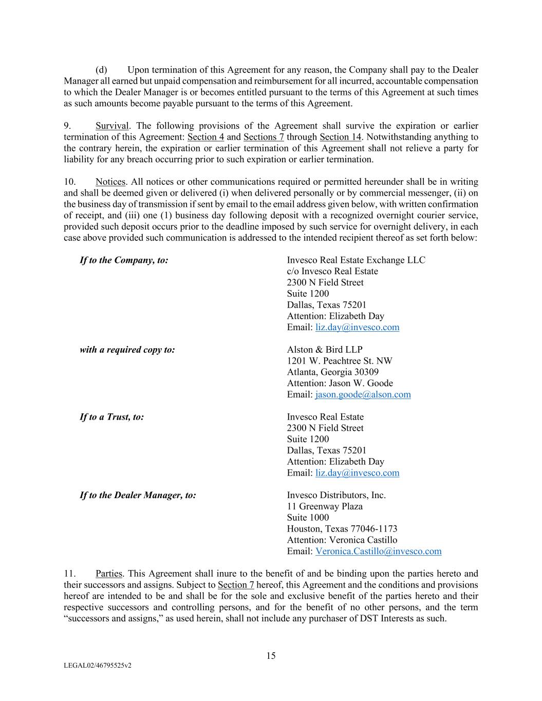 15 LEGAL02/46795525v2 (d) Upon termination of this Agreement for any reason, the Company shall pay to the Dealer Manager all earned but unpaid compensation and reimbursement for all incurred, accountable compensation to which the Dealer Manager is or becomes entitled pursuant to the terms of this Agreement at such times as such amounts become payable pursuant to the terms of this Agreement. 9. Survival. The following provisions of the Agreement shall survive the expiration or earlier termination of this Agreement: Section 4 and Sections 7 through Section 14. Notwithstanding anything to the contrary herein, the expiration or earlier termination of this Agreement shall not relieve a party for liability for any breach occurring prior to such expiration or earlier termination. 10. Notices. All notices or other communications required or permitted hereunder shall be in writing and shall be deemed given or delivered (i) when delivered personally or by commercial messenger, (ii) on the business day of transmission if sent by email to the email address given below, with written confirmation of receipt, and (iii) one (1) business day following deposit with a recognized overnight courier service, provided such deposit occurs prior to the deadline imposed by such service for overnight delivery, in each case above provided such communication is addressed to the intended recipient thereof as set forth below: If to the Company, to: Invesco Real Estate Exchange LLC c/o Invesco Real Estate 2300 N Field Street Suite 1200 Dallas, Texas 75201 Attention: Elizabeth Day Email: liz.day@invesco.com with a required copy to: Alston & Bird LLP 1201 W. Peachtree St. NW Atlanta, Georgia 30309 Attention: Jason W. Goode Email: jason.goode@alson.com If to a Trust, to: Invesco Real Estate 2300 N Field Street Suite 1200 Dallas, Texas 75201 Attention: Elizabeth Day Email: liz.day@invesco.com If to the Dealer Manager, to: Invesco Distributors, Inc. 11 Greenway Plaza Suite 1000 Houston, Texas 77046-1173 Attention: Veronica Castillo Email: Veronica.Castillo@invesco.com 11. Parties. This Agreement shall inure to the benefit of and be binding upon the parties hereto and their successors and assigns. Subject to Section 7 hereof, this Agreement and the conditions and provisions hereof are intended to be and shall be for the sole and exclusive benefit of the parties hereto and their respective successors and controlling persons, and for the benefit of no other persons, and the term “successors and assigns,” as used herein, shall not include any purchaser of DST Interests as such.