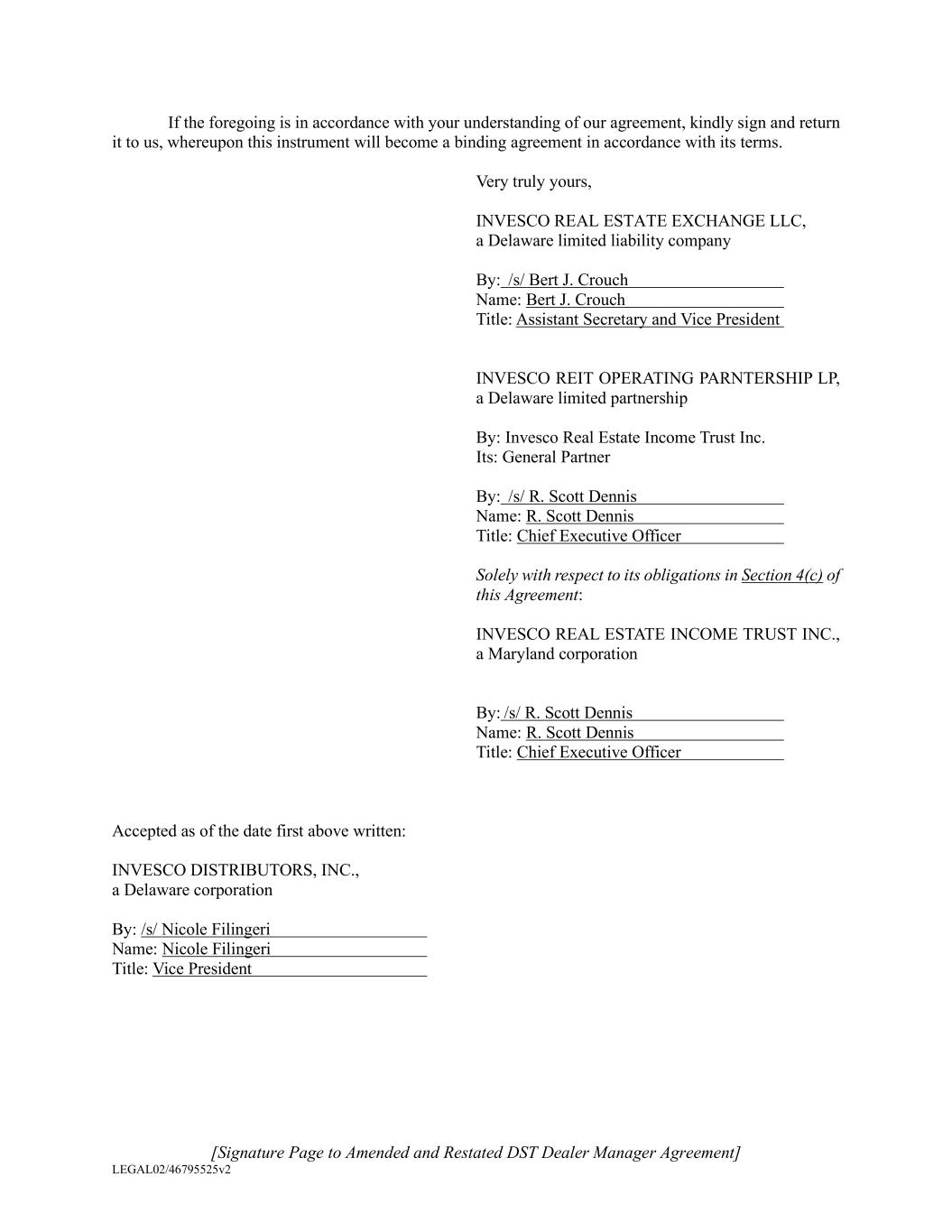 [Signature Page to Amended and Restated DST Dealer Manager Agreement] LEGAL02/46795525v2 If the foregoing is in accordance with your understanding of our agreement, kindly sign and return it to us, whereupon this instrument will become a binding agreement in accordance with its terms. Very truly yours, INVESCO REAL ESTATE EXCHANGE LLC, a Delaware limited liability company By: /s/ Bert J. Crouch Name: Bert J. Crouch Title: Assistant Secretary and Vice President INVESCO REIT OPERATING PARNTERSHIP LP, a Delaware limited partnership By: Invesco Real Estate Income Trust Inc. Its: General Partner By: /s/ R. Scott Dennis Name: R. Scott Dennis Title: Chief Executive Officer Solely with respect to its obligations in Section 4(c) of this Agreement: INVESCO REAL ESTATE INCOME TRUST INC., a Maryland corporation By: /s/ R. Scott Dennis Name: R. Scott Dennis Title: Chief Executive Officer Accepted as of the date first above written: INVESCO DISTRIBUTORS, INC., a Delaware corporation By: /s/ Nicole Filingeri Name: Nicole Filingeri Title: Vice President