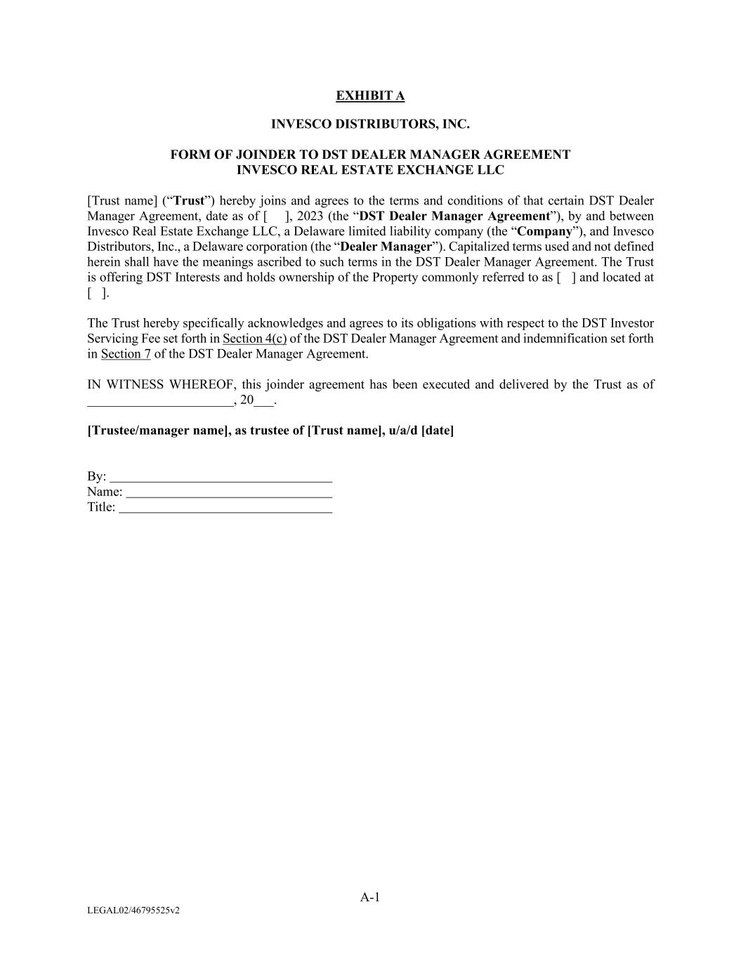 A-1 LEGAL02/46795525v2 EXHIBIT A INVESCO DISTRIBUTORS, INC. FORM OF JOINDER TO DST DEALER MANAGER AGREEMENT INVESCO REAL ESTATE EXCHANGE LLC [Trust name] (“Trust”) hereby joins and agrees to the terms and conditions of that certain DST Dealer Manager Agreement, date as of [ ], 2023 (the “DST Dealer Manager Agreement”), by and between Invesco Real Estate Exchange LLC, a Delaware limited liability company (the “Company”), and Invesco Distributors, Inc., a Delaware corporation (the “Dealer Manager”). Capitalized terms used and not defined herein shall have the meanings ascribed to such terms in the DST Dealer Manager Agreement. The Trust is offering DST Interests and holds ownership of the Property commonly referred to as [ ] and located at [ ]. The Trust hereby specifically acknowledges and agrees to its obligations with respect to the DST Investor Servicing Fee set forth in Section 4(c) of the DST Dealer Manager Agreement and indemnification set forth in Section 7 of the DST Dealer Manager Agreement. IN WITNESS WHEREOF, this joinder agreement has been executed and delivered by the Trust as of ______________________, 20___. [Trustee/manager name], as trustee of [Trust name], u/a/d [date] By: Name: Title: