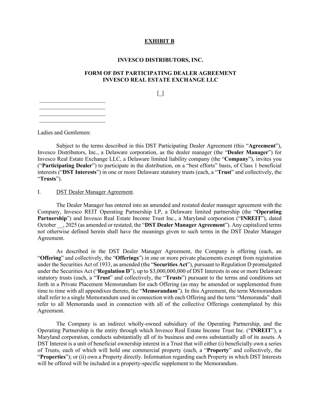 EXHIBIT B INVESCO DISTRIBUTORS, INC. FORM OF DST PARTICIPATING DEALER AGREEMENT INVESCO REAL ESTATE EXCHANGE LLC [_] _______________________ _______________________ _______________________ _______________________ Ladies and Gentlemen: Subject to the terms described in this DST Participating Dealer Agreement (this “Agreement”), Invesco Distributors, Inc., a Delaware corporation, as the dealer manager (the “Dealer Manager”) for Invesco Real Estate Exchange LLC, a Delaware limited liability company (the “Company”), invites you (“Participating Dealer”) to participate in the distribution, on a “best efforts” basis, of Class 1 beneficial interests (“DST Interests”) in one or more Delaware statutory trusts (each, a “Trust” and collectively, the “Trusts”). I. DST Dealer Manager Agreement. The Dealer Manager has entered into an amended and restated dealer manager agreement with the Company, Invesco REIT Operating Partnership LP, a Delaware limited partnership (the “Operating Partnership”) and Invesco Real Estate Income Trust Inc., a Maryland corporation (“INREIT”), dated October __, 2025 (as amended or restated, the “DST Dealer Manager Agreement”). Any capitalized terms not otherwise defined herein shall have the meanings given to such terms in the DST Dealer Manager Agreement. As described in the DST Dealer Manager Agreement, the Company is offering (each, an “Offering” and collectively, the “Offerings”) in one or more private placements exempt from registration under the Securities Act of 1933, as amended (the “Securities Act”), pursuant to Regulation D promulgated under the Securities Act (“Regulation D”), up to $3,000,000,000 of DST Interests in one or more Delaware statutory trusts (each, a “Trust” and collectively, the “Trusts”) pursuant to the terms and conditions set forth in a Private Placement Memorandum for each Offering (as may be amended or supplemented from time to time with all appendixes thereto, the “Memorandum”). In this Agreement, the term Memorandum shall refer to a single Memorandum used in connection with each Offering and the term “Memoranda” shall refer to all Memoranda used in connection with all of the collective Offerings contemplated by this Agreement. The Company is an indirect wholly-owned subsidiary of the Operating Partnership, and the Operating Partnership is the entity through which Invesco Real Estate Income Trust Inc. (“INREIT”), a Maryland corporation, conducts substantially all of its business and owns substantially all of its assets. A DST Interest is a unit of beneficial ownership interest in a Trust that will either (i) beneficially own a series of Trusts, each of which will hold one commercial property (each, a “Property” and collectively, the “Properties”); or (ii) own a Property directly. Information regarding each Property in which DST Interests will be offered will be included in a property-specific supplement to the Memorandum.