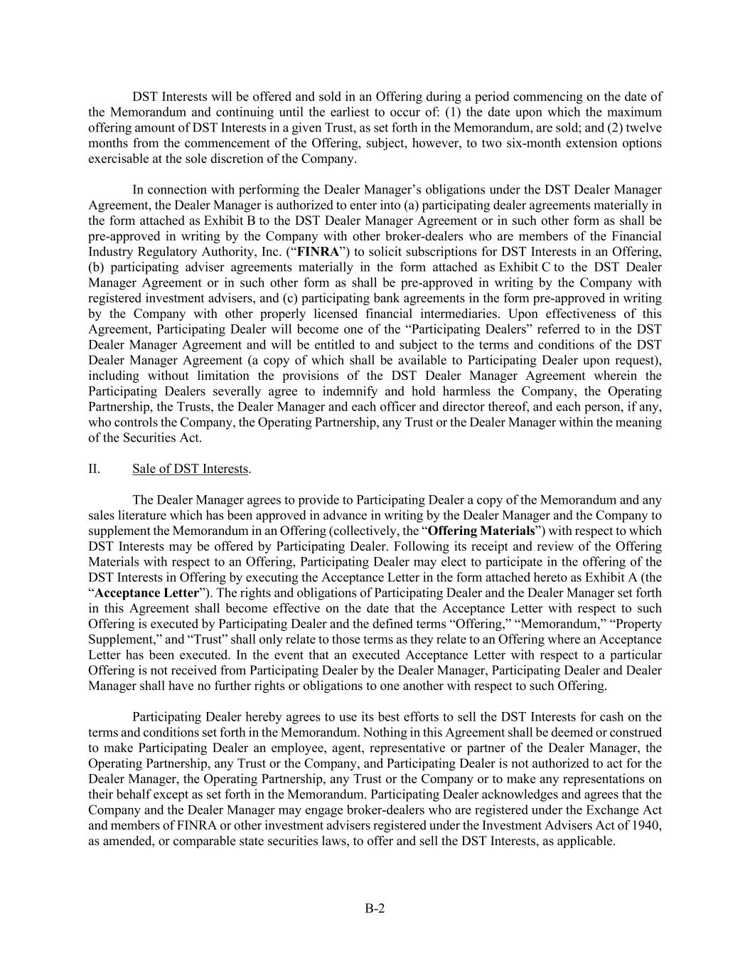 B-2 DST Interests will be offered and sold in an Offering during a period commencing on the date of the Memorandum and continuing until the earliest to occur of: (1) the date upon which the maximum offering amount of DST Interests in a given Trust, as set forth in the Memorandum, are sold; and (2) twelve months from the commencement of the Offering, subject, however, to two six-month extension options exercisable at the sole discretion of the Company. In connection with performing the Dealer Manager’s obligations under the DST Dealer Manager Agreement, the Dealer Manager is authorized to enter into (a) participating dealer agreements materially in the form attached as Exhibit B to the DST Dealer Manager Agreement or in such other form as shall be pre-approved in writing by the Company with other broker-dealers who are members of the Financial Industry Regulatory Authority, Inc. (“FINRA”) to solicit subscriptions for DST Interests in an Offering, (b) participating adviser agreements materially in the form attached as Exhibit C to the DST Dealer Manager Agreement or in such other form as shall be pre-approved in writing by the Company with registered investment advisers, and (c) participating bank agreements in the form pre-approved in writing by the Company with other properly licensed financial intermediaries. Upon effectiveness of this Agreement, Participating Dealer will become one of the “Participating Dealers” referred to in the DST Dealer Manager Agreement and will be entitled to and subject to the terms and conditions of the DST Dealer Manager Agreement (a copy of which shall be available to Participating Dealer upon request), including without limitation the provisions of the DST Dealer Manager Agreement wherein the Participating Dealers severally agree to indemnify and hold harmless the Company, the Operating Partnership, the Trusts, the Dealer Manager and each officer and director thereof, and each person, if any, who controls the Company, the Operating Partnership, any Trust or the Dealer Manager within the meaning of the Securities Act. II. Sale of DST Interests. The Dealer Manager agrees to provide to Participating Dealer a copy of the Memorandum and any sales literature which has been approved in advance in writing by the Dealer Manager and the Company to supplement the Memorandum in an Offering (collectively, the “Offering Materials”) with respect to which DST Interests may be offered by Participating Dealer. Following its receipt and review of the Offering Materials with respect to an Offering, Participating Dealer may elect to participate in the offering of the DST Interests in Offering by executing the Acceptance Letter in the form attached hereto as Exhibit A (the “Acceptance Letter”). The rights and obligations of Participating Dealer and the Dealer Manager set forth in this Agreement shall become effective on the date that the Acceptance Letter with respect to such Offering is executed by Participating Dealer and the defined terms “Offering,” “Memorandum,” “Property Supplement,” and “Trust” shall only relate to those terms as they relate to an Offering where an Acceptance Letter has been executed. In the event that an executed Acceptance Letter with respect to a particular Offering is not received from Participating Dealer by the Dealer Manager, Participating Dealer and Dealer Manager shall have no further rights or obligations to one another with respect to such Offering. Participating Dealer hereby agrees to use its best efforts to sell the DST Interests for cash on the terms and conditions set forth in the Memorandum. Nothing in this Agreement shall be deemed or construed to make Participating Dealer an employee, agent, representative or partner of the Dealer Manager, the Operating Partnership, any Trust or the Company, and Participating Dealer is not authorized to act for the Dealer Manager, the Operating Partnership, any Trust or the Company or to make any representations on their behalf except as set forth in the Memorandum. Participating Dealer acknowledges and agrees that the Company and the Dealer Manager may engage broker-dealers who are registered under the Exchange Act and members of FINRA or other investment advisers registered under the Investment Advisers Act of 1940, as amended, or comparable state securities laws, to offer and sell the DST Interests, as applicable.