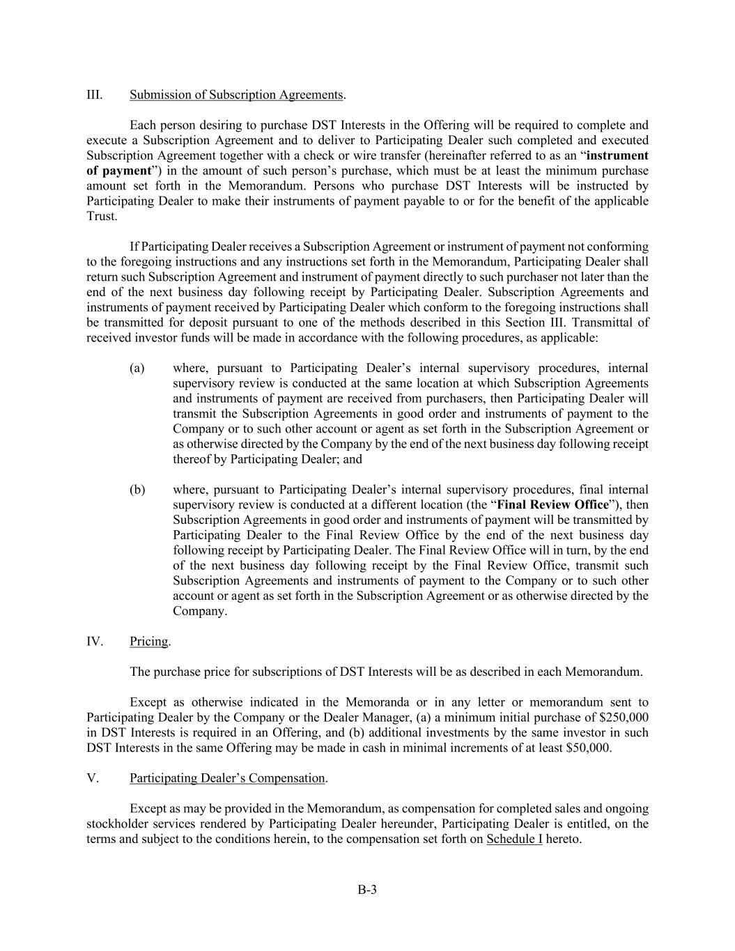 B-3 III. Submission of Subscription Agreements. Each person desiring to purchase DST Interests in the Offering will be required to complete and execute a Subscription Agreement and to deliver to Participating Dealer such completed and executed Subscription Agreement together with a check or wire transfer (hereinafter referred to as an “instrument of payment”) in the amount of such person’s purchase, which must be at least the minimum purchase amount set forth in the Memorandum. Persons who purchase DST Interests will be instructed by Participating Dealer to make their instruments of payment payable to or for the benefit of the applicable Trust. If Participating Dealer receives a Subscription Agreement or instrument of payment not conforming to the foregoing instructions and any instructions set forth in the Memorandum, Participating Dealer shall return such Subscription Agreement and instrument of payment directly to such purchaser not later than the end of the next business day following receipt by Participating Dealer. Subscription Agreements and instruments of payment received by Participating Dealer which conform to the foregoing instructions shall be transmitted for deposit pursuant to one of the methods described in this Section III. Transmittal of received investor funds will be made in accordance with the following procedures, as applicable: (a) where, pursuant to Participating Dealer’s internal supervisory procedures, internal supervisory review is conducted at the same location at which Subscription Agreements and instruments of payment are received from purchasers, then Participating Dealer will transmit the Subscription Agreements in good order and instruments of payment to the Company or to such other account or agent as set forth in the Subscription Agreement or as otherwise directed by the Company by the end of the next business day following receipt thereof by Participating Dealer; and (b) where, pursuant to Participating Dealer’s internal supervisory procedures, final internal supervisory review is conducted at a different location (the “Final Review Office”), then Subscription Agreements in good order and instruments of payment will be transmitted by Participating Dealer to the Final Review Office by the end of the next business day following receipt by Participating Dealer. The Final Review Office will in turn, by the end of the next business day following receipt by the Final Review Office, transmit such Subscription Agreements and instruments of payment to the Company or to such other account or agent as set forth in the Subscription Agreement or as otherwise directed by the Company. IV. Pricing. The purchase price for subscriptions of DST Interests will be as described in each Memorandum. Except as otherwise indicated in the Memoranda or in any letter or memorandum sent to Participating Dealer by the Company or the Dealer Manager, (a) a minimum initial purchase of $250,000 in DST Interests is required in an Offering, and (b) additional investments by the same investor in such DST Interests in the same Offering may be made in cash in minimal increments of at least $50,000. V. Participating Dealer’s Compensation. Except as may be provided in the Memorandum, as compensation for completed sales and ongoing stockholder services rendered by Participating Dealer hereunder, Participating Dealer is entitled, on the terms and subject to the conditions herein, to the compensation set forth on Schedule I hereto.