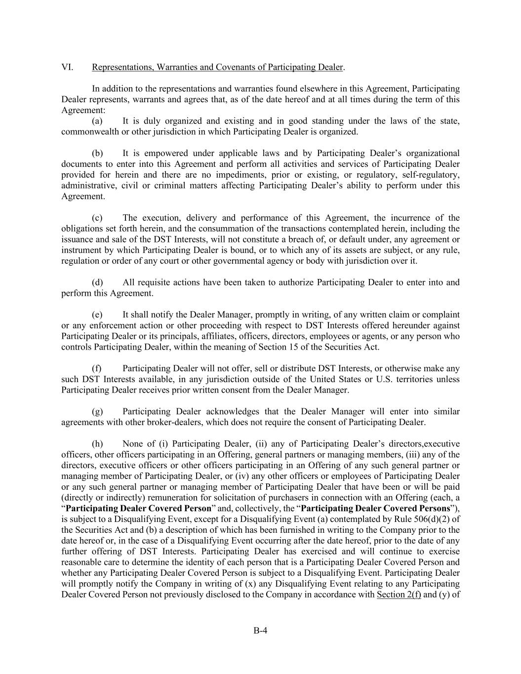 B-4 VI. Representations, Warranties and Covenants of Participating Dealer. In addition to the representations and warranties found elsewhere in this Agreement, Participating Dealer represents, warrants and agrees that, as of the date hereof and at all times during the term of this Agreement: (a) It is duly organized and existing and in good standing under the laws of the state, commonwealth or other jurisdiction in which Participating Dealer is organized. (b) It is empowered under applicable laws and by Participating Dealer’s organizational documents to enter into this Agreement and perform all activities and services of Participating Dealer provided for herein and there are no impediments, prior or existing, or regulatory, self-regulatory, administrative, civil or criminal matters affecting Participating Dealer’s ability to perform under this Agreement. (c) The execution, delivery and performance of this Agreement, the incurrence of the obligations set forth herein, and the consummation of the transactions contemplated herein, including the issuance and sale of the DST Interests, will not constitute a breach of, or default under, any agreement or instrument by which Participating Dealer is bound, or to which any of its assets are subject, or any rule, regulation or order of any court or other governmental agency or body with jurisdiction over it. (d) All requisite actions have been taken to authorize Participating Dealer to enter into and perform this Agreement. (e) It shall notify the Dealer Manager, promptly in writing, of any written claim or complaint or any enforcement action or other proceeding with respect to DST Interests offered hereunder against Participating Dealer or its principals, affiliates, officers, directors, employees or agents, or any person who controls Participating Dealer, within the meaning of Section 15 of the Securities Act. (f) Participating Dealer will not offer, sell or distribute DST Interests, or otherwise make any such DST Interests available, in any jurisdiction outside of the United States or U.S. territories unless Participating Dealer receives prior written consent from the Dealer Manager. (g) Participating Dealer acknowledges that the Dealer Manager will enter into similar agreements with other broker-dealers, which does not require the consent of Participating Dealer. (h) None of (i) Participating Dealer, (ii) any of Participating Dealer’s directors,executive officers, other officers participating in an Offering, general partners or managing members, (iii) any of the directors, executive officers or other officers participating in an Offering of any such general partner or managing member of Participating Dealer, or (iv) any other officers or employees of Participating Dealer or any such general partner or managing member of Participating Dealer that have been or will be paid (directly or indirectly) remuneration for solicitation of purchasers in connection with an Offering (each, a “Participating Dealer Covered Person” and, collectively, the “Participating Dealer Covered Persons”), is subject to a Disqualifying Event, except for a Disqualifying Event (a) contemplated by Rule 506(d)(2) of the Securities Act and (b) a description of which has been furnished in writing to the Company prior to the date hereof or, in the case of a Disqualifying Event occurring after the date hereof, prior to the date of any further offering of DST Interests. Participating Dealer has exercised and will continue to exercise reasonable care to determine the identity of each person that is a Participating Dealer Covered Person and whether any Participating Dealer Covered Person is subject to a Disqualifying Event. Participating Dealer will promptly notify the Company in writing of (x) any Disqualifying Event relating to any Participating Dealer Covered Person not previously disclosed to the Company in accordance with Section 2(f) and (y) of