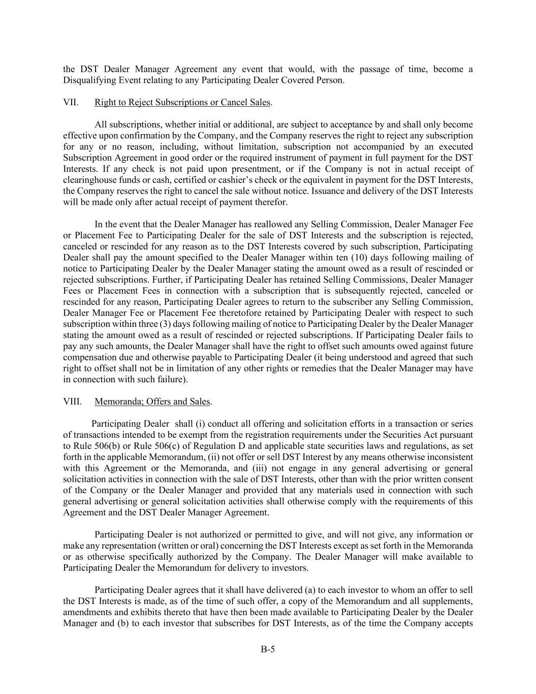 B-5 the DST Dealer Manager Agreement any event that would, with the passage of time, become a Disqualifying Event relating to any Participating Dealer Covered Person. VII. Right to Reject Subscriptions or Cancel Sales. All subscriptions, whether initial or additional, are subject to acceptance by and shall only become effective upon confirmation by the Company, and the Company reserves the right to reject any subscription for any or no reason, including, without limitation, subscription not accompanied by an executed Subscription Agreement in good order or the required instrument of payment in full payment for the DST Interests. If any check is not paid upon presentment, or if the Company is not in actual receipt of clearinghouse funds or cash, certified or cashier’s check or the equivalent in payment for the DST Interests, the Company reserves the right to cancel the sale without notice. Issuance and delivery of the DST Interests will be made only after actual receipt of payment therefor. In the event that the Dealer Manager has reallowed any Selling Commission, Dealer Manager Fee or Placement Fee to Participating Dealer for the sale of DST Interests and the subscription is rejected, canceled or rescinded for any reason as to the DST Interests covered by such subscription, Participating Dealer shall pay the amount specified to the Dealer Manager within ten (10) days following mailing of notice to Participating Dealer by the Dealer Manager stating the amount owed as a result of rescinded or rejected subscriptions. Further, if Participating Dealer has retained Selling Commissions, Dealer Manager Fees or Placement Fees in connection with a subscription that is subsequently rejected, canceled or rescinded for any reason, Participating Dealer agrees to return to the subscriber any Selling Commission, Dealer Manager Fee or Placement Fee theretofore retained by Participating Dealer with respect to such subscription within three (3) days following mailing of notice to Participating Dealer by the Dealer Manager stating the amount owed as a result of rescinded or rejected subscriptions. If Participating Dealer fails to pay any such amounts, the Dealer Manager shall have the right to offset such amounts owed against future compensation due and otherwise payable to Participating Dealer (it being understood and agreed that such right to offset shall not be in limitation of any other rights or remedies that the Dealer Manager may have in connection with such failure). VIII. Memoranda; Offers and Sales. Participating Dealer shall (i) conduct all offering and solicitation efforts in a transaction or series of transactions intended to be exempt from the registration requirements under the Securities Act pursuant to Rule 506(b) or Rule 506(c) of Regulation D and applicable state securities laws and regulations, as set forth in the applicable Memorandum, (ii) not offer or sell DST Interest by any means otherwise inconsistent with this Agreement or the Memoranda, and (iii) not engage in any general advertising or general solicitation activities in connection with the sale of DST Interests, other than with the prior written consent of the Company or the Dealer Manager and provided that any materials used in connection with such general advertising or general solicitation activities shall otherwise comply with the requirements of this Agreement and the DST Dealer Manager Agreement. Participating Dealer is not authorized or permitted to give, and will not give, any information or make any representation (written or oral) concerning the DST Interests except as set forth in the Memoranda or as otherwise specifically authorized by the Company. The Dealer Manager will make available to Participating Dealer the Memorandum for delivery to investors. Participating Dealer agrees that it shall have delivered (a) to each investor to whom an offer to sell the DST Interests is made, as of the time of such offer, a copy of the Memorandum and all supplements, amendments and exhibits thereto that have then been made available to Participating Dealer by the Dealer Manager and (b) to each investor that subscribes for DST Interests, as of the time the Company accepts