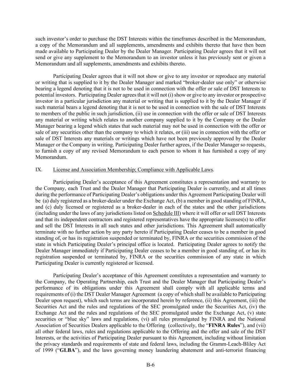 B-6 such investor’s order to purchase the DST Interests within the timeframes described in the Memorandum, a copy of the Memorandum and all supplements, amendments and exhibits thereto that have then been made available to Participating Dealer by the Dealer Manager. Participating Dealer agrees that it will not send or give any supplement to the Memorandum to an investor unless it has previously sent or given a Memorandum and all supplements, amendments and exhibits thereto. Participating Dealer agrees that it will not show or give to any investor or reproduce any material or writing that is supplied to it by the Dealer Manager and marked “broker-dealer use only” or otherwise bearing a legend denoting that it is not to be used in connection with the offer or sale of DST Interests to potential investors. Participating Dealer agrees that it will not (i) show or give to any investor or prospective investor in a particular jurisdiction any material or writing that is supplied to it by the Dealer Manager if such material bears a legend denoting that it is not to be used in connection with the sale of DST Interests to members of the public in such jurisdiction, (ii) use in connection with the offer or sale of DST Interests any material or writing which relates to another company supplied to it by the Company or the Dealer Manager bearing a legend which states that such material may not be used in connection with the offer or sale of any securities other than the company to which it relates, or (iii) use in connection with the offer or sale of DST Interests any materials or writings which have not been previously approved by the Dealer Manager or the Company in writing. Participating Dealer further agrees, if the Dealer Manager so requests, to furnish a copy of any revised Memorandum to each person to whom it has furnished a copy of any Memorandum. IX. License and Association Membership; Compliance with Applicable Laws. Participating Dealer’s acceptance of this Agreement constitutes a representation and warranty to the Company, each Trust and the Dealer Manager that Participating Dealer is currently, and at all times during the performance of Participating Dealer’s obligations under this Agreement Participating Dealer will be (a) duly registered as a broker-dealer under the Exchange Act, (b) a member in good standing of FINRA, and (c) duly licensed or registered as a broker-dealer in each of the states and the other jurisdictions (including under the laws of any jurisdictions listed on Schedule III) where it will offer or sell DST Interests and that its independent contractors and registered representatives have the appropriate licenses(s) to offer and sell the DST Interests in all such states and other jurisdictions. This Agreement shall automatically terminate with no further action by any party hereto if Participating Dealer ceases to be a member in good standing of, or has its registration suspended or terminated by, FINRA or the securities commission of the state in which Participating Dealer’s principal office is located. Participating Dealer agrees to notify the Dealer Manager immediately if Participating Dealer ceases to be a member in good standing of, or has its registration suspended or terminated by, FINRA or the securities commission of any state in which Participating Dealer is currently registered or licensed. Participating Dealer’s acceptance of this Agreement constitutes a representation and warranty to the Company, the Operating Partnership, each Trust and the Dealer Manager that Participating Dealer’s performance of its obligations under this Agreement shall comply with all applicable terms and requirements of (i) the DST Dealer Manager Agreement (a copy of which shall be available to Participating Dealer upon request), which such terms are incorporated herein by reference, (ii) this Agreement, (iii) the Securities Act and the rules and regulations of the SEC promulgated under the Securities Act, (iv) the Exchange Act and the rules and regulations of the SEC promulgated under the Exchange Act, (v) state securities or “blue sky” laws and regulations, (vi) all rules promulgated by FINRA and the National Association of Securities Dealers applicable to the Offering (collectively, the “FINRA Rules”), and (vii) all other federal laws, rules and regulations applicable to the Offering and the offer and sale of the DST Interests, or the activities of Participating Dealer pursuant to this Agreement, including without limitation the privacy standards and requirements of state and federal laws, including the Gramm-Leach-Bliley Act of 1999 (“GLBA”), and the laws governing money laundering abatement and anti-terrorist financing
