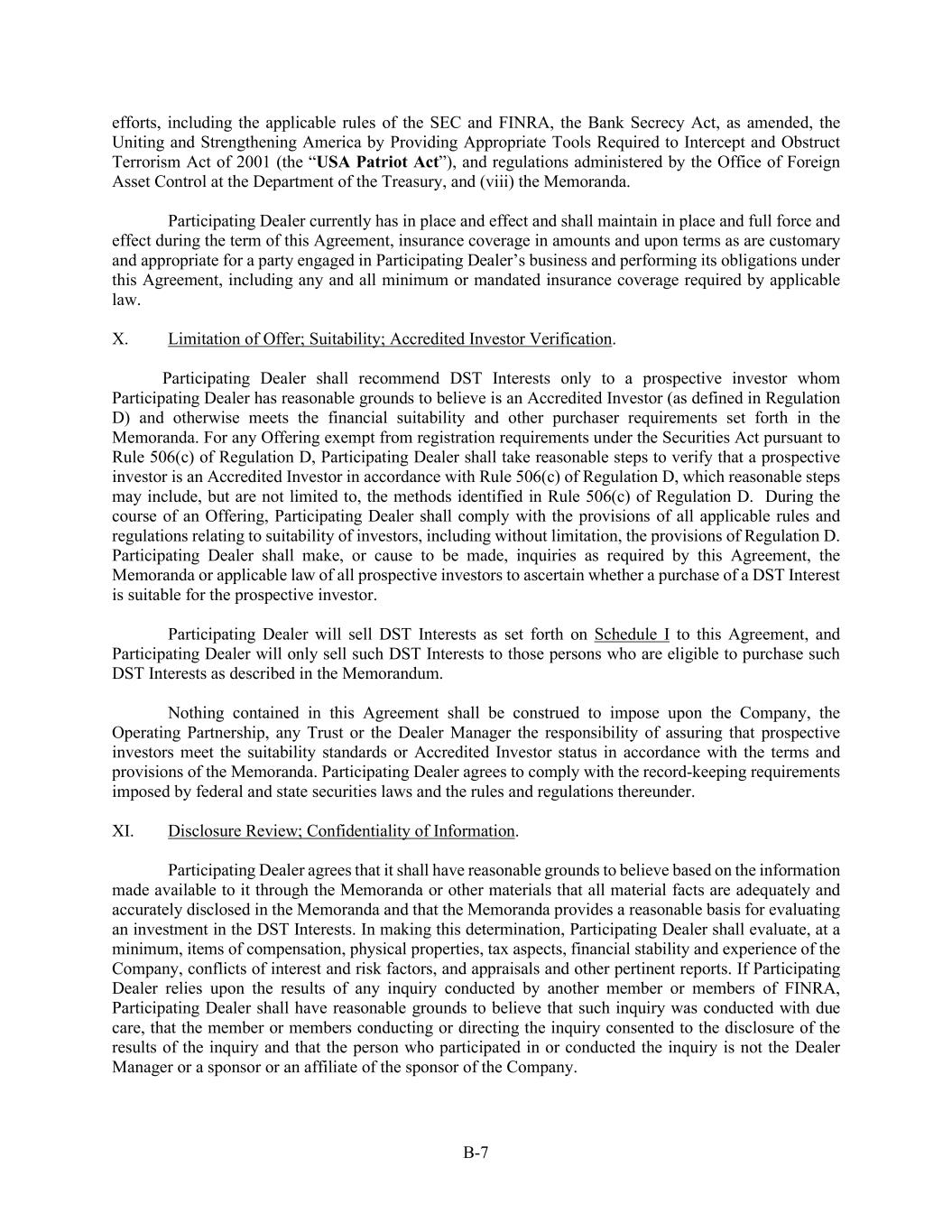 B-7 efforts, including the applicable rules of the SEC and FINRA, the Bank Secrecy Act, as amended, the Uniting and Strengthening America by Providing Appropriate Tools Required to Intercept and Obstruct Terrorism Act of 2001 (the “USA Patriot Act”), and regulations administered by the Office of Foreign Asset Control at the Department of the Treasury, and (viii) the Memoranda. Participating Dealer currently has in place and effect and shall maintain in place and full force and effect during the term of this Agreement, insurance coverage in amounts and upon terms as are customary and appropriate for a party engaged in Participating Dealer’s business and performing its obligations under this Agreement, including any and all minimum or mandated insurance coverage required by applicable law. X. Limitation of Offer; Suitability; Accredited Investor Verification. Participating Dealer shall recommend DST Interests only to a prospective investor whom Participating Dealer has reasonable grounds to believe is an Accredited Investor (as defined in Regulation D) and otherwise meets the financial suitability and other purchaser requirements set forth in the Memoranda. For any Offering exempt from registration requirements under the Securities Act pursuant to Rule 506(c) of Regulation D, Participating Dealer shall take reasonable steps to verify that a prospective investor is an Accredited Investor in accordance with Rule 506(c) of Regulation D, which reasonable steps may include, but are not limited to, the methods identified in Rule 506(c) of Regulation D. During the course of an Offering, Participating Dealer shall comply with the provisions of all applicable rules and regulations relating to suitability of investors, including without limitation, the provisions of Regulation D. Participating Dealer shall make, or cause to be made, inquiries as required by this Agreement, the Memoranda or applicable law of all prospective investors to ascertain whether a purchase of a DST Interest is suitable for the prospective investor. Participating Dealer will sell DST Interests as set forth on Schedule I to this Agreement, and Participating Dealer will only sell such DST Interests to those persons who are eligible to purchase such DST Interests as described in the Memorandum. Nothing contained in this Agreement shall be construed to impose upon the Company, the Operating Partnership, any Trust or the Dealer Manager the responsibility of assuring that prospective investors meet the suitability standards or Accredited Investor status in accordance with the terms and provisions of the Memoranda. Participating Dealer agrees to comply with the record-keeping requirements imposed by federal and state securities laws and the rules and regulations thereunder. XI. Disclosure Review; Confidentiality of Information. Participating Dealer agrees that it shall have reasonable grounds to believe based on the information made available to it through the Memoranda or other materials that all material facts are adequately and accurately disclosed in the Memoranda and that the Memoranda provides a reasonable basis for evaluating an investment in the DST Interests. In making this determination, Participating Dealer shall evaluate, at a minimum, items of compensation, physical properties, tax aspects, financial stability and experience of the Company, conflicts of interest and risk factors, and appraisals and other pertinent reports. If Participating Dealer relies upon the results of any inquiry conducted by another member or members of FINRA, Participating Dealer shall have reasonable grounds to believe that such inquiry was conducted with due care, that the member or members conducting or directing the inquiry consented to the disclosure of the results of the inquiry and that the person who participated in or conducted the inquiry is not the Dealer Manager or a sponsor or an affiliate of the sponsor of the Company.