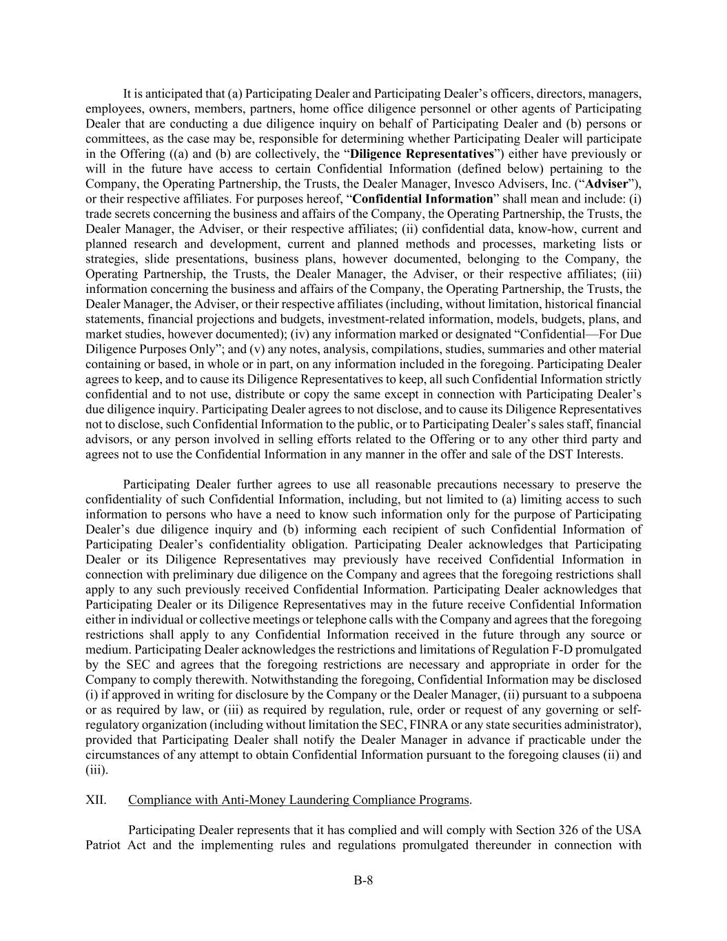 B-8 It is anticipated that (a) Participating Dealer and Participating Dealer’s officers, directors, managers, employees, owners, members, partners, home office diligence personnel or other agents of Participating Dealer that are conducting a due diligence inquiry on behalf of Participating Dealer and (b) persons or committees, as the case may be, responsible for determining whether Participating Dealer will participate in the Offering ((a) and (b) are collectively, the “Diligence Representatives”) either have previously or will in the future have access to certain Confidential Information (defined below) pertaining to the Company, the Operating Partnership, the Trusts, the Dealer Manager, Invesco Advisers, Inc. (“Adviser”), or their respective affiliates. For purposes hereof, “Confidential Information” shall mean and include: (i) trade secrets concerning the business and affairs of the Company, the Operating Partnership, the Trusts, the Dealer Manager, the Adviser, or their respective affiliates; (ii) confidential data, know-how, current and planned research and development, current and planned methods and processes, marketing lists or strategies, slide presentations, business plans, however documented, belonging to the Company, the Operating Partnership, the Trusts, the Dealer Manager, the Adviser, or their respective affiliates; (iii) information concerning the business and affairs of the Company, the Operating Partnership, the Trusts, the Dealer Manager, the Adviser, or their respective affiliates (including, without limitation, historical financial statements, financial projections and budgets, investment-related information, models, budgets, plans, and market studies, however documented); (iv) any information marked or designated “Confidential—For Due Diligence Purposes Only”; and (v) any notes, analysis, compilations, studies, summaries and other material containing or based, in whole or in part, on any information included in the foregoing. Participating Dealer agrees to keep, and to cause its Diligence Representatives to keep, all such Confidential Information strictly confidential and to not use, distribute or copy the same except in connection with Participating Dealer’s due diligence inquiry. Participating Dealer agrees to not disclose, and to cause its Diligence Representatives not to disclose, such Confidential Information to the public, or to Participating Dealer’s sales staff, financial advisors, or any person involved in selling efforts related to the Offering or to any other third party and agrees not to use the Confidential Information in any manner in the offer and sale of the DST Interests. Participating Dealer further agrees to use all reasonable precautions necessary to preserve the confidentiality of such Confidential Information, including, but not limited to (a) limiting access to such information to persons who have a need to know such information only for the purpose of Participating Dealer’s due diligence inquiry and (b) informing each recipient of such Confidential Information of Participating Dealer’s confidentiality obligation. Participating Dealer acknowledges that Participating Dealer or its Diligence Representatives may previously have received Confidential Information in connection with preliminary due diligence on the Company and agrees that the foregoing restrictions shall apply to any such previously received Confidential Information. Participating Dealer acknowledges that Participating Dealer or its Diligence Representatives may in the future receive Confidential Information either in individual or collective meetings or telephone calls with the Company and agrees that the foregoing restrictions shall apply to any Confidential Information received in the future through any source or medium. Participating Dealer acknowledges the restrictions and limitations of Regulation F-D promulgated by the SEC and agrees that the foregoing restrictions are necessary and appropriate in order for the Company to comply therewith. Notwithstanding the foregoing, Confidential Information may be disclosed (i) if approved in writing for disclosure by the Company or the Dealer Manager, (ii) pursuant to a subpoena or as required by law, or (iii) as required by regulation, rule, order or request of any governing or self- regulatory organization (including without limitation the SEC, FINRA or any state securities administrator), provided that Participating Dealer shall notify the Dealer Manager in advance if practicable under the circumstances of any attempt to obtain Confidential Information pursuant to the foregoing clauses (ii) and (iii). XII. Compliance with Anti-Money Laundering Compliance Programs. Participating Dealer represents that it has complied and will comply with Section 326 of the USA Patriot Act and the implementing rules and regulations promulgated thereunder in connection with