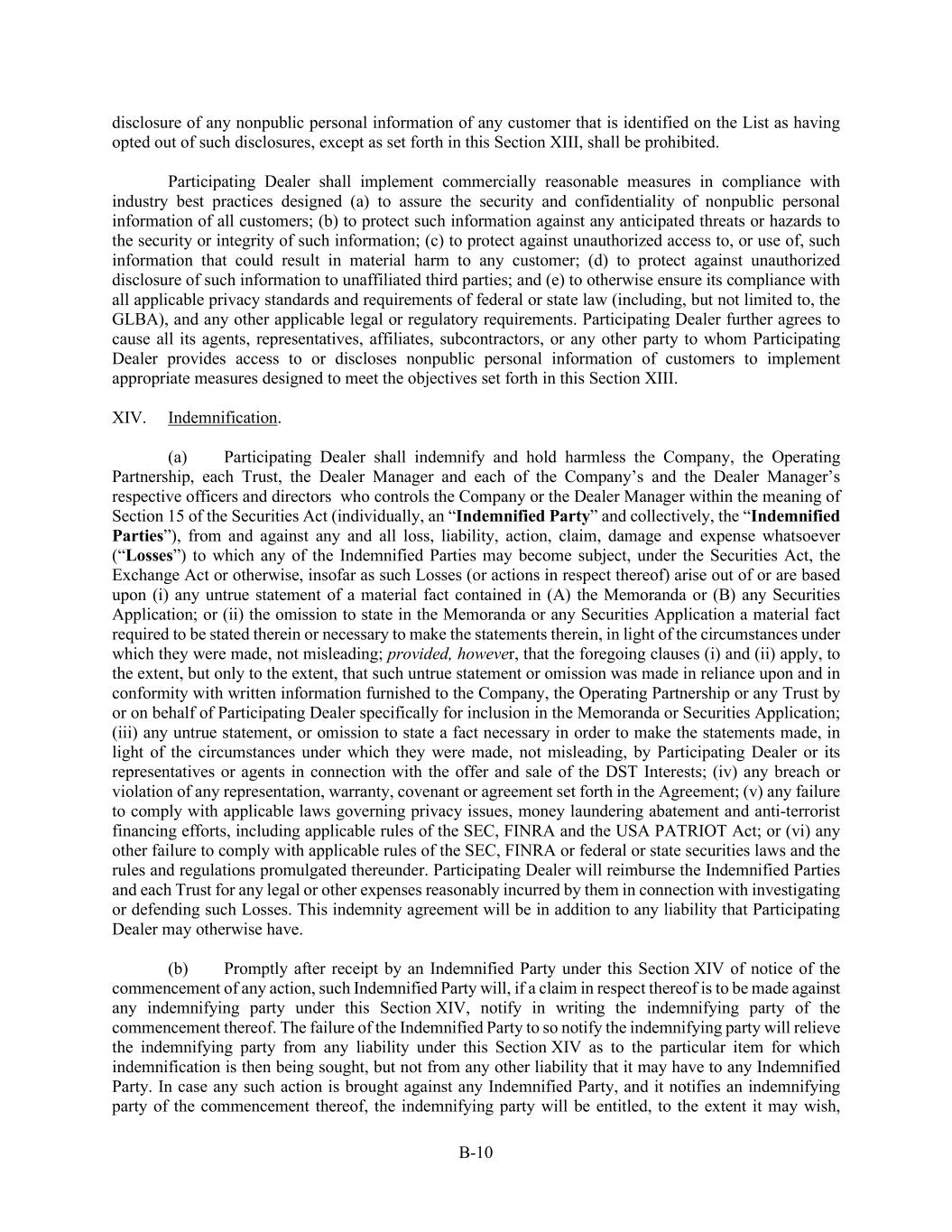 B-10 disclosure of any nonpublic personal information of any customer that is identified on the List as having opted out of such disclosures, except as set forth in this Section XIII, shall be prohibited. Participating Dealer shall implement commercially reasonable measures in compliance with industry best practices designed (a) to assure the security and confidentiality of nonpublic personal information of all customers; (b) to protect such information against any anticipated threats or hazards to the security or integrity of such information; (c) to protect against unauthorized access to, or use of, such information that could result in material harm to any customer; (d) to protect against unauthorized disclosure of such information to unaffiliated third parties; and (e) to otherwise ensure its compliance with all applicable privacy standards and requirements of federal or state law (including, but not limited to, the GLBA), and any other applicable legal or regulatory requirements. Participating Dealer further agrees to cause all its agents, representatives, affiliates, subcontractors, or any other party to whom Participating Dealer provides access to or discloses nonpublic personal information of customers to implement appropriate measures designed to meet the objectives set forth in this Section XIII. XIV. Indemnification. (a) Participating Dealer shall indemnify and hold harmless the Company, the Operating Partnership, each Trust, the Dealer Manager and each of the Company’s and the Dealer Manager’s respective officers and directors who controls the Company or the Dealer Manager within the meaning of Section 15 of the Securities Act (individually, an “Indemnified Party” and collectively, the “Indemnified Parties”), from and against any and all loss, liability, action, claim, damage and expense whatsoever (“Losses”) to which any of the Indemnified Parties may become subject, under the Securities Act, the Exchange Act or otherwise, insofar as such Losses (or actions in respect thereof) arise out of or are based upon (i) any untrue statement of a material fact contained in (A) the Memoranda or (B) any Securities Application; or (ii) the omission to state in the Memoranda or any Securities Application a material fact required to be stated therein or necessary to make the statements therein, in light of the circumstances under which they were made, not misleading; provided, however, that the foregoing clauses (i) and (ii) apply, to the extent, but only to the extent, that such untrue statement or omission was made in reliance upon and in conformity with written information furnished to the Company, the Operating Partnership or any Trust by or on behalf of Participating Dealer specifically for inclusion in the Memoranda or Securities Application; (iii) any untrue statement, or omission to state a fact necessary in order to make the statements made, in light of the circumstances under which they were made, not misleading, by Participating Dealer or its representatives or agents in connection with the offer and sale of the DST Interests; (iv) any breach or violation of any representation, warranty, covenant or agreement set forth in the Agreement; (v) any failure to comply with applicable laws governing privacy issues, money laundering abatement and anti-terrorist financing efforts, including applicable rules of the SEC, FINRA and the USA PATRIOT Act; or (vi) any other failure to comply with applicable rules of the SEC, FINRA or federal or state securities laws and the rules and regulations promulgated thereunder. Participating Dealer will reimburse the Indemnified Parties and each Trust for any legal or other expenses reasonably incurred by them in connection with investigating or defending such Losses. This indemnity agreement will be in addition to any liability that Participating Dealer may otherwise have. (b) Promptly after receipt by an Indemnified Party under this Section XIV of notice of the commencement of any action, such Indemnified Party will, if a claim in respect thereof is to be made against any indemnifying party under this Section XIV, notify in writing the indemnifying party of the commencement thereof. The failure of the Indemnified Party to so notify the indemnifying party will relieve the indemnifying party from any liability under this Section XIV as to the particular item for which indemnification is then being sought, but not from any other liability that it may have to any Indemnified Party. In case any such action is brought against any Indemnified Party, and it notifies an indemnifying party of the commencement thereof, the indemnifying party will be entitled, to the extent it may wish,