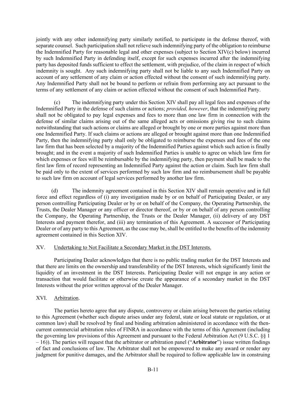 B-11 jointly with any other indemnifying party similarly notified, to participate in the defense thereof, with separate counsel. Such participation shall not relieve such indemnifying party of the obligation to reimburse the Indemnified Party for reasonable legal and other expenses (subject to Section XIV(c) below) incurred by such Indemnified Party in defending itself, except for such expenses incurred after the indemnifying party has deposited funds sufficient to effect the settlement, with prejudice, of the claim in respect of which indemnity is sought. Any such indemnifying party shall not be liable to any such Indemnified Party on account of any settlement of any claim or action effected without the consent of such indemnifying party. Any Indemnified Party shall not be bound to perform or refrain from performing any act pursuant to the terms of any settlement of any claim or action effected without the consent of such Indemnified Party. (c) The indemnifying party under this Section XIV shall pay all legal fees and expenses of the Indemnified Party in the defense of such claims or actions; provided, however, that the indemnifying party shall not be obligated to pay legal expenses and fees to more than one law firm in connection with the defense of similar claims arising out of the same alleged acts or omissions giving rise to such claims notwithstanding that such actions or claims are alleged or brought by one or more parties against more than one Indemnified Party. If such claims or actions are alleged or brought against more than one Indemnified Party, then the indemnifying party shall only be obligated to reimburse the expenses and fees of the one law firm that has been selected by a majority of the Indemnified Parties against which such action is finally brought; and in the event a majority of such Indemnified Parties is unable to agree on which law firm for which expenses or fees will be reimbursable by the indemnifying party, then payment shall be made to the first law firm of record representing an Indemnified Party against the action or claim. Such law firm shall be paid only to the extent of services performed by such law firm and no reimbursement shall be payable to such law firm on account of legal services performed by another law firm. (d) The indemnity agreement contained in this Section XIV shall remain operative and in full force and effect regardless of (i) any investigation made by or on behalf of Participating Dealer, or any person controlling Participating Dealer or by or on behalf of the Company, the Operating Partnership, the Trusts, the Dealer Manager or any officer or director thereof, or by or on behalf of any person controlling the Company, the Operating Partnership, the Trusts or the Dealer Manager, (ii) delivery of any DST Interests and payment therefor, and (iii) any termination of this Agreement. A successor of Participating Dealer or of any party to this Agreement, as the case may be, shall be entitled to the benefits of the indemnity agreement contained in this Section XIV. XV. Undertaking to Not Facilitate a Secondary Market in the DST Interests. Participating Dealer acknowledges that there is no public trading market for the DST Interests and that there are limits on the ownership and transferability of the DST Interests, which significantly limit the liquidity of an investment in the DST Interests. Participating Dealer will not engage in any action or transaction that would facilitate or otherwise create the appearance of a secondary market in the DST Interests without the prior written approval of the Dealer Manager. XVI. Arbitration. The parties hereto agree that any dispute, controversy or claim arising between the parties relating to this Agreement (whether such dispute arises under any federal, state or local statute or regulation, or at common law) shall be resolved by final and binding arbitration administered in accordance with the then- current commercial arbitration rules of FINRA in accordance with the terms of this Agreement (including the governing law provisions of this Agreement and pursuant to the Federal Arbitration Act (9 U.S.C. §§ 1 – 16)). The parties will request that the arbitrator or arbitration panel (“Arbitrator”) issue written findings of fact and conclusions of law. The Arbitrator shall not be empowered to make any award or render any judgment for punitive damages, and the Arbitrator shall be required to follow applicable law in construing