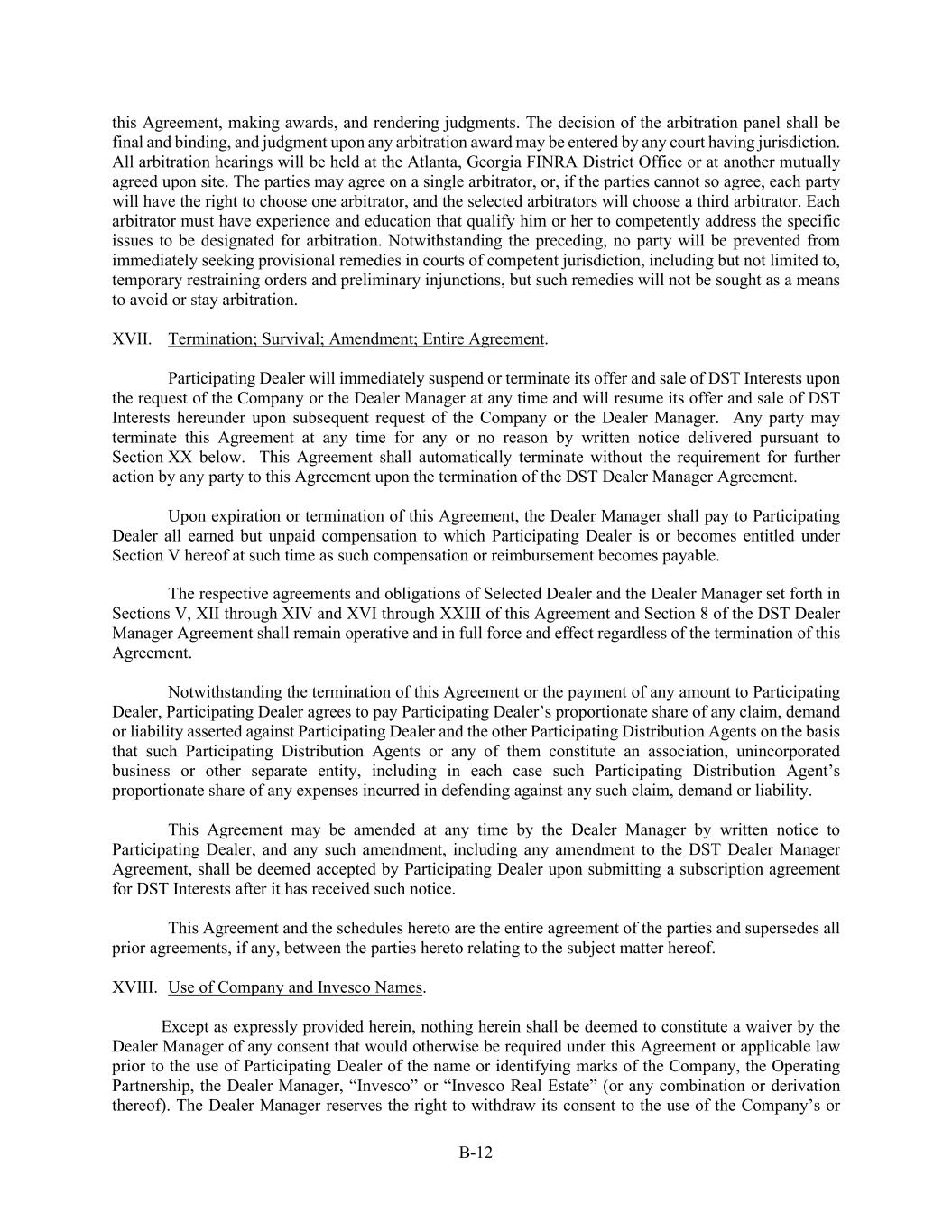 B-12 this Agreement, making awards, and rendering judgments. The decision of the arbitration panel shall be final and binding, and judgment upon any arbitration award may be entered by any court having jurisdiction. All arbitration hearings will be held at the Atlanta, Georgia FINRA District Office or at another mutually agreed upon site. The parties may agree on a single arbitrator, or, if the parties cannot so agree, each party will have the right to choose one arbitrator, and the selected arbitrators will choose a third arbitrator. Each arbitrator must have experience and education that qualify him or her to competently address the specific issues to be designated for arbitration. Notwithstanding the preceding, no party will be prevented from immediately seeking provisional remedies in courts of competent jurisdiction, including but not limited to, temporary restraining orders and preliminary injunctions, but such remedies will not be sought as a means to avoid or stay arbitration. XVII. Termination; Survival; Amendment; Entire Agreement. Participating Dealer will immediately suspend or terminate its offer and sale of DST Interests upon the request of the Company or the Dealer Manager at any time and will resume its offer and sale of DST Interests hereunder upon subsequent request of the Company or the Dealer Manager. Any party may terminate this Agreement at any time for any or no reason by written notice delivered pursuant to Section XX below. This Agreement shall automatically terminate without the requirement for further action by any party to this Agreement upon the termination of the DST Dealer Manager Agreement. Upon expiration or termination of this Agreement, the Dealer Manager shall pay to Participating Dealer all earned but unpaid compensation to which Participating Dealer is or becomes entitled under Section V hereof at such time as such compensation or reimbursement becomes payable. The respective agreements and obligations of Selected Dealer and the Dealer Manager set forth in Sections V, XII through XIV and XVI through XXIII of this Agreement and Section 8 of the DST Dealer Manager Agreement shall remain operative and in full force and effect regardless of the termination of this Agreement. Notwithstanding the termination of this Agreement or the payment of any amount to Participating Dealer, Participating Dealer agrees to pay Participating Dealer’s proportionate share of any claim, demand or liability asserted against Participating Dealer and the other Participating Distribution Agents on the basis that such Participating Distribution Agents or any of them constitute an association, unincorporated business or other separate entity, including in each case such Participating Distribution Agent’s proportionate share of any expenses incurred in defending against any such claim, demand or liability. This Agreement may be amended at any time by the Dealer Manager by written notice to Participating Dealer, and any such amendment, including any amendment to the DST Dealer Manager Agreement, shall be deemed accepted by Participating Dealer upon submitting a subscription agreement for DST Interests after it has received such notice. This Agreement and the schedules hereto are the entire agreement of the parties and supersedes all prior agreements, if any, between the parties hereto relating to the subject matter hereof. XVIII. Use of Company and Invesco Names. Except as expressly provided herein, nothing herein shall be deemed to constitute a waiver by the Dealer Manager of any consent that would otherwise be required under this Agreement or applicable law prior to the use of Participating Dealer of the name or identifying marks of the Company, the Operating Partnership, the Dealer Manager, “Invesco” or “Invesco Real Estate” (or any combination or derivation thereof). The Dealer Manager reserves the right to withdraw its consent to the use of the Company’s or