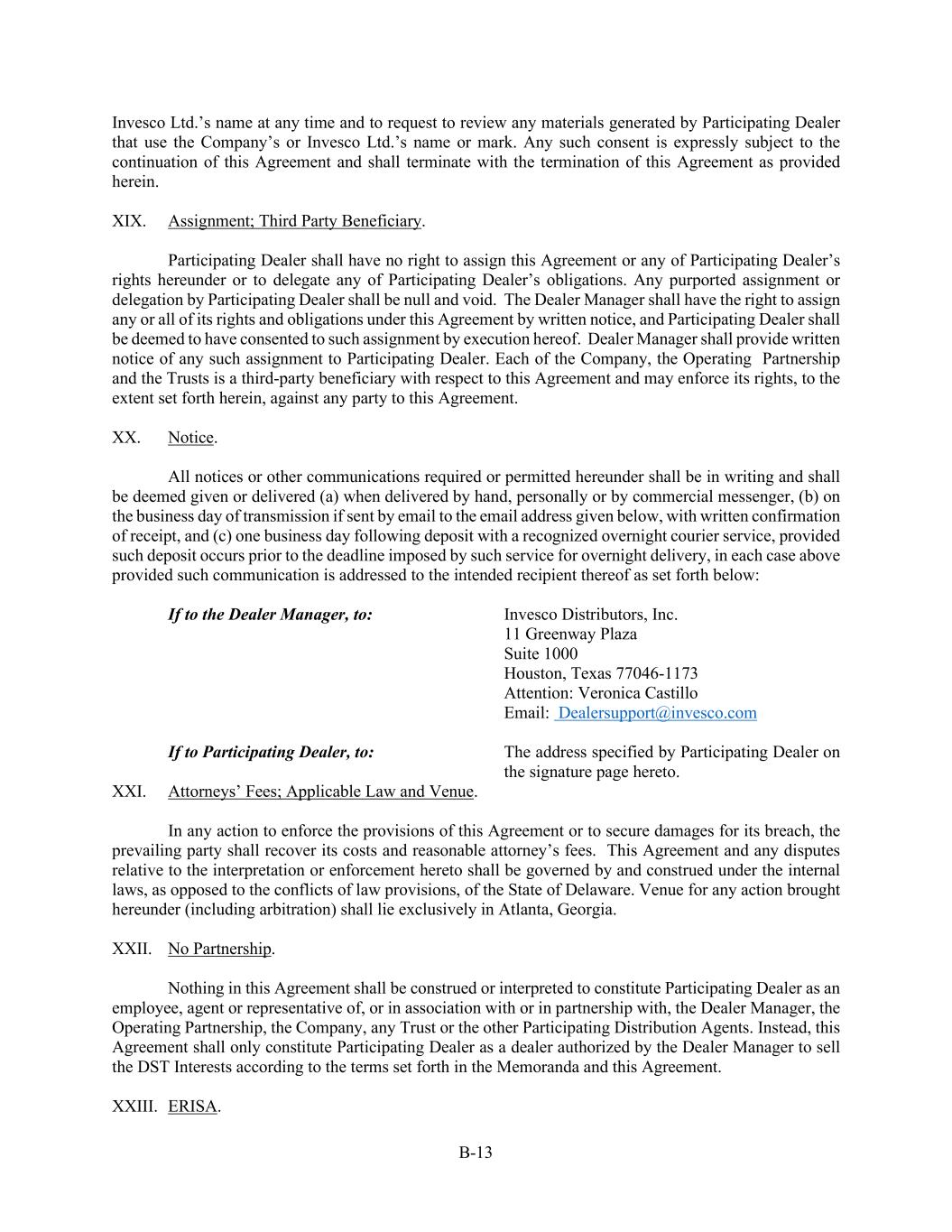 B-13 Invesco Ltd.’s name at any time and to request to review any materials generated by Participating Dealer that use the Company’s or Invesco Ltd.’s name or mark. Any such consent is expressly subject to the continuation of this Agreement and shall terminate with the termination of this Agreement as provided herein. XIX. Assignment; Third Party Beneficiary. Participating Dealer shall have no right to assign this Agreement or any of Participating Dealer’s rights hereunder or to delegate any of Participating Dealer’s obligations. Any purported assignment or delegation by Participating Dealer shall be null and void. The Dealer Manager shall have the right to assign any or all of its rights and obligations under this Agreement by written notice, and Participating Dealer shall be deemed to have consented to such assignment by execution hereof. Dealer Manager shall provide written notice of any such assignment to Participating Dealer. Each of the Company, the Operating Partnership and the Trusts is a third-party beneficiary with respect to this Agreement and may enforce its rights, to the extent set forth herein, against any party to this Agreement. XX. Notice. All notices or other communications required or permitted hereunder shall be in writing and shall be deemed given or delivered (a) when delivered by hand, personally or by commercial messenger, (b) on the business day of transmission if sent by email to the email address given below, with written confirmation of receipt, and (c) one business day following deposit with a recognized overnight courier service, provided such deposit occurs prior to the deadline imposed by such service for overnight delivery, in each case above provided such communication is addressed to the intended recipient thereof as set forth below: If to the Dealer Manager, to: Invesco Distributors, Inc. 11 Greenway Plaza Suite 1000 Houston, Texas 77046-1173 Attention: Veronica Castillo Email: Dealersupport@invesco.com If to Participating Dealer, to: The address specified by Participating Dealer on the signature page hereto. XXI. Attorneys’ Fees; Applicable Law and Venue. In any action to enforce the provisions of this Agreement or to secure damages for its breach, the prevailing party shall recover its costs and reasonable attorney’s fees. This Agreement and any disputes relative to the interpretation or enforcement hereto shall be governed by and construed under the internal laws, as opposed to the conflicts of law provisions, of the State of Delaware. Venue for any action brought hereunder (including arbitration) shall lie exclusively in Atlanta, Georgia. XXII. No Partnership. Nothing in this Agreement shall be construed or interpreted to constitute Participating Dealer as an employee, agent or representative of, or in association with or in partnership with, the Dealer Manager, the Operating Partnership, the Company, any Trust or the other Participating Distribution Agents. Instead, this Agreement shall only constitute Participating Dealer as a dealer authorized by the Dealer Manager to sell the DST Interests according to the terms set forth in the Memoranda and this Agreement. XXIII. ERISA.
