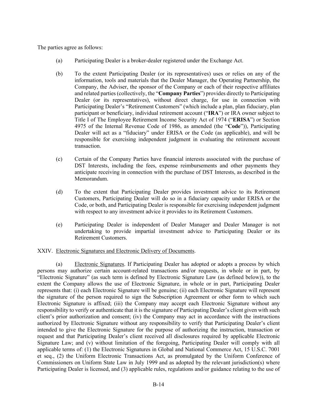 B-14 The parties agree as follows: (a) Participating Dealer is a broker-dealer registered under the Exchange Act. (b) To the extent Participating Dealer (or its representatives) uses or relies on any of the information, tools and materials that the Dealer Manager, the Operating Partnership, the Company, the Adviser, the sponsor of the Company or each of their respective affiliates and related parties (collectively, the “Company Parties”) provides directly to Participating Dealer (or its representatives), without direct charge, for use in connection with Participating Dealer’s “Retirement Customers” (which include a plan, plan fiduciary, plan participant or beneficiary, individual retirement account (“IRA”) or IRA owner subject to Title I of The Employee Retirement Income Security Act of 1974 (“ERISA”) or Section 4975 of the Internal Revenue Code of 1986, as amended (the “Code”)), Participating Dealer will act as a “fiduciary” under ERISA or the Code (as applicable), and will be responsible for exercising independent judgment in evaluating the retirement account transaction. (c) Certain of the Company Parties have financial interests associated with the purchase of DST Interests, including the fees, expense reimbursements and other payments they anticipate receiving in connection with the purchase of DST Interests, as described in the Memorandum. (d) To the extent that Participating Dealer provides investment advice to its Retirement Customers, Participating Dealer will do so in a fiduciary capacity under ERISA or the Code, or both, and Participating Dealer is responsible for exercising independent judgment with respect to any investment advice it provides to its Retirement Customers. (e) Participating Dealer is independent of Dealer Manager and Dealer Manager is not undertaking to provide impartial investment advice to Participating Dealer or its Retirement Customers. XXIV. Electronic Signatures and Electronic Delivery of Documents. (a) Electronic Signatures. If Participating Dealer has adopted or adopts a process by which persons may authorize certain account-related transactions and/or requests, in whole or in part, by “Electronic Signature” (as such term is defined by Electronic Signature Law (as defined below)), to the extent the Company allows the use of Electronic Signature, in whole or in part, Participating Dealer represents that: (i) each Electronic Signature will be genuine; (ii) each Electronic Signature will represent the signature of the person required to sign the Subscription Agreement or other form to which such Electronic Signature is affixed; (iii) the Company may accept each Electronic Signature without any responsibility to verify or authenticate that it is the signature of Participating Dealer’s client given with such client’s prior authorization and consent; (iv) the Company may act in accordance with the instructions authorized by Electronic Signature without any responsibility to verify that Participating Dealer’s client intended to give the Electronic Signature for the purpose of authorizing the instruction, transaction or request and that Participating Dealer’s client received all disclosures required by applicable Electronic Signature Law; and (v) without limitation of the foregoing, Participating Dealer will comply with all applicable terms of: (1) the Electronic Signatures in Global and National Commerce Act, 15 U.S.C. 7001 et seq., (2) the Uniform Electronic Transactions Act, as promulgated by the Uniform Conference of Commissioners on Uniform State Law in July 1999 and as adopted by the relevant jurisdiction(s) where Participating Dealer is licensed, and (3) applicable rules, regulations and/or guidance relating to the use of