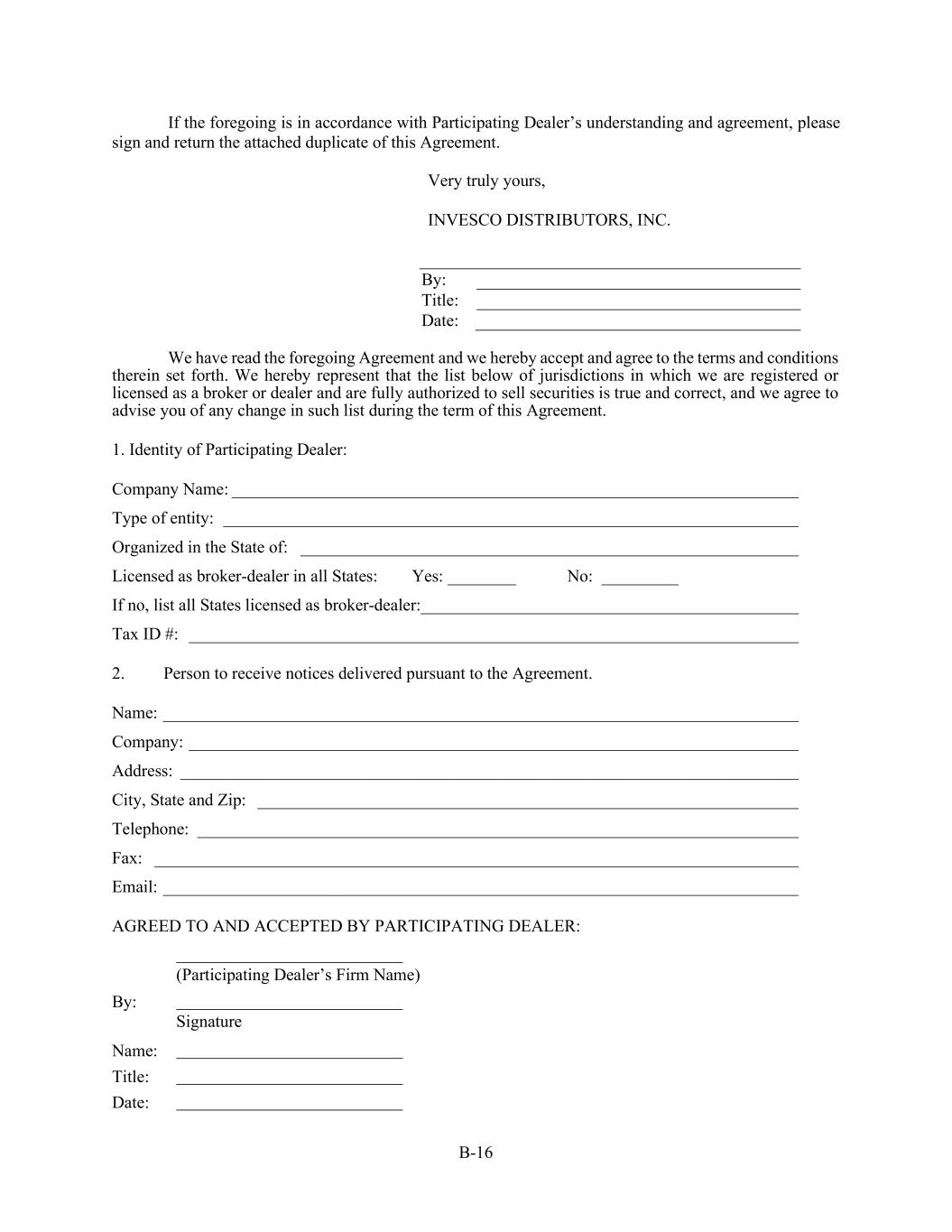 B-16 If the foregoing is in accordance with Participating Dealer’s understanding and agreement, please sign and return the attached duplicate of this Agreement. Very truly yours, INVESCO DISTRIBUTORS, INC. By: Title: Date: We have read the foregoing Agreement and we hereby accept and agree to the terms and conditions therein set forth. We hereby represent that the list below of jurisdictions in which we are registered or licensed as a broker or dealer and are fully authorized to sell securities is true and correct, and we agree to advise you of any change in such list during the term of this Agreement. 1. Identity of Participating Dealer: Company Name: __________________________________________________________________ Type of entity: ___________________________________________________________________ Organized in the State of: __________________________________________________________ Licensed as broker-dealer in all States: Yes: ________ No: _________ If no, list all States licensed as broker-dealer:____________________________________________ Tax ID #: _______________________________________________________________________ 2. Person to receive notices delivered pursuant to the Agreement. Name: __________________________________________________________________________ Company: _______________________________________________________________________ Address: ________________________________________________________________________ City, State and Zip: _______________________________________________________________ Telephone: ______________________________________________________________________ Fax: ___________________________________________________________________________ Email: __________________________________________________________________________ AGREED TO AND ACCEPTED BY PARTICIPATING DEALER: (Participating Dealer’s Firm Name) By: Signature Name: Title: Date: