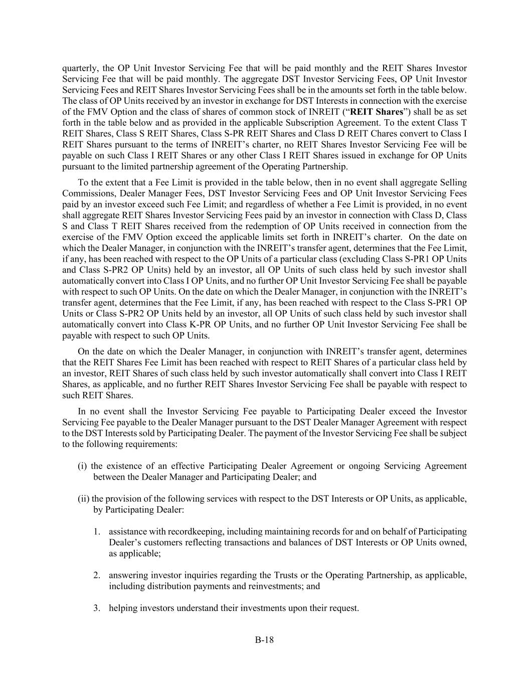 B-18 quarterly, the OP Unit Investor Servicing Fee that will be paid monthly and the REIT Shares Investor Servicing Fee that will be paid monthly. The aggregate DST Investor Servicing Fees, OP Unit Investor Servicing Fees and REIT Shares Investor Servicing Fees shall be in the amounts set forth in the table below. The class of OP Units received by an investor in exchange for DST Interests in connection with the exercise of the FMV Option and the class of shares of common stock of INREIT (“REIT Shares”) shall be as set forth in the table below and as provided in the applicable Subscription Agreement. To the extent Class T REIT Shares, Class S REIT Shares, Class S-PR REIT Shares and Class D REIT Chares convert to Class I REIT Shares pursuant to the terms of INREIT’s charter, no REIT Shares Investor Servicing Fee will be payable on such Class I REIT Shares or any other Class I REIT Shares issued in exchange for OP Units pursuant to the limited partnership agreement of the Operating Partnership. To the extent that a Fee Limit is provided in the table below, then in no event shall aggregate Selling Commissions, Dealer Manager Fees, DST Investor Servicing Fees and OP Unit Investor Servicing Fees paid by an investor exceed such Fee Limit; and regardless of whether a Fee Limit is provided, in no event shall aggregate REIT Shares Investor Servicing Fees paid by an investor in connection with Class D, Class S and Class T REIT Shares received from the redemption of OP Units received in connection from the exercise of the FMV Option exceed the applicable limits set forth in INREIT’s charter. On the date on which the Dealer Manager, in conjunction with the INREIT’s transfer agent, determines that the Fee Limit, if any, has been reached with respect to the OP Units of a particular class (excluding Class S-PR1 OP Units and Class S-PR2 OP Units) held by an investor, all OP Units of such class held by such investor shall automatically convert into Class I OP Units, and no further OP Unit Investor Servicing Fee shall be payable with respect to such OP Units. On the date on which the Dealer Manager, in conjunction with the INREIT’s transfer agent, determines that the Fee Limit, if any, has been reached with respect to the Class S-PR1 OP Units or Class S-PR2 OP Units held by an investor, all OP Units of such class held by such investor shall automatically convert into Class K-PR OP Units, and no further OP Unit Investor Servicing Fee shall be payable with respect to such OP Units. On the date on which the Dealer Manager, in conjunction with INREIT’s transfer agent, determines that the REIT Shares Fee Limit has been reached with respect to REIT Shares of a particular class held by an investor, REIT Shares of such class held by such investor automatically shall convert into Class I REIT Shares, as applicable, and no further REIT Shares Investor Servicing Fee shall be payable with respect to such REIT Shares. In no event shall the Investor Servicing Fee payable to Participating Dealer exceed the Investor Servicing Fee payable to the Dealer Manager pursuant to the DST Dealer Manager Agreement with respect to the DST Interests sold by Participating Dealer. The payment of the Investor Servicing Fee shall be subject to the following requirements: (i) the existence of an effective Participating Dealer Agreement or ongoing Servicing Agreement between the Dealer Manager and Participating Dealer; and (ii) the provision of the following services with respect to the DST Interests or OP Units, as applicable, by Participating Dealer: 1. assistance with recordkeeping, including maintaining records for and on behalf of Participating Dealer’s customers reflecting transactions and balances of DST Interests or OP Units owned, as applicable; 2. answering investor inquiries regarding the Trusts or the Operating Partnership, as applicable, including distribution payments and reinvestments; and 3. helping investors understand their investments upon their request.