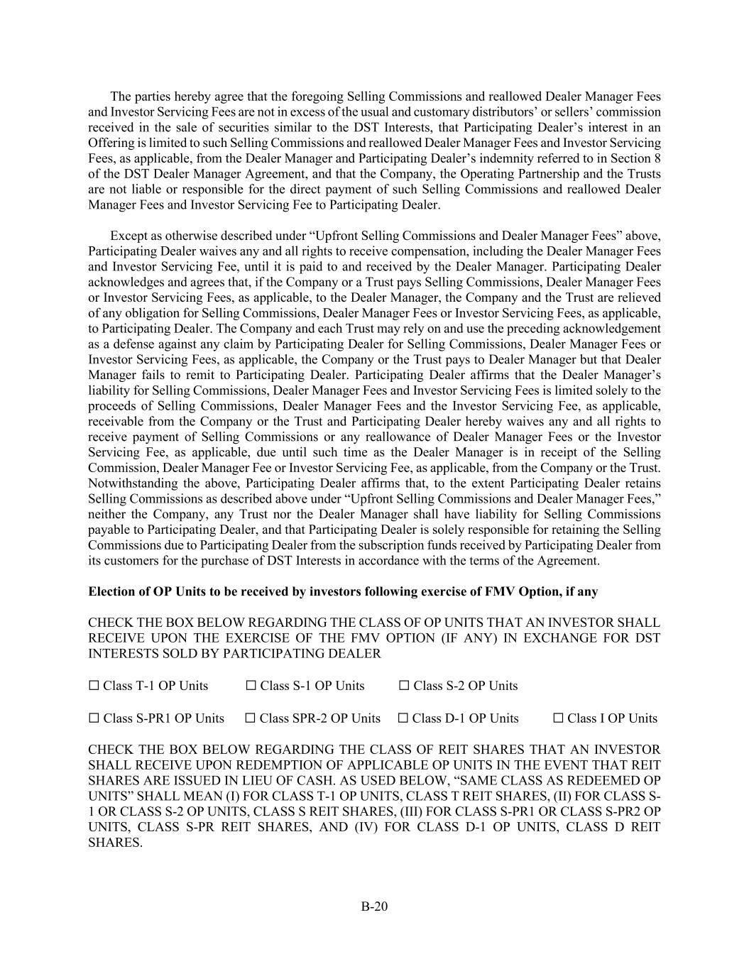 B-20 The parties hereby agree that the foregoing Selling Commissions and reallowed Dealer Manager Fees and Investor Servicing Fees are not in excess of the usual and customary distributors’ or sellers’ commission received in the sale of securities similar to the DST Interests, that Participating Dealer’s interest in an Offering is limited to such Selling Commissions and reallowed Dealer Manager Fees and Investor Servicing Fees, as applicable, from the Dealer Manager and Participating Dealer’s indemnity referred to in Section 8 of the DST Dealer Manager Agreement, and that the Company, the Operating Partnership and the Trusts are not liable or responsible for the direct payment of such Selling Commissions and reallowed Dealer Manager Fees and Investor Servicing Fee to Participating Dealer. Except as otherwise described under “Upfront Selling Commissions and Dealer Manager Fees” above, Participating Dealer waives any and all rights to receive compensation, including the Dealer Manager Fees and Investor Servicing Fee, until it is paid to and received by the Dealer Manager. Participating Dealer acknowledges and agrees that, if the Company or a Trust pays Selling Commissions, Dealer Manager Fees or Investor Servicing Fees, as applicable, to the Dealer Manager, the Company and the Trust are relieved of any obligation for Selling Commissions, Dealer Manager Fees or Investor Servicing Fees, as applicable, to Participating Dealer. The Company and each Trust may rely on and use the preceding acknowledgement as a defense against any claim by Participating Dealer for Selling Commissions, Dealer Manager Fees or Investor Servicing Fees, as applicable, the Company or the Trust pays to Dealer Manager but that Dealer Manager fails to remit to Participating Dealer. Participating Dealer affirms that the Dealer Manager’s liability for Selling Commissions, Dealer Manager Fees and Investor Servicing Fees is limited solely to the proceeds of Selling Commissions, Dealer Manager Fees and the Investor Servicing Fee, as applicable, receivable from the Company or the Trust and Participating Dealer hereby waives any and all rights to receive payment of Selling Commissions or any reallowance of Dealer Manager Fees or the Investor Servicing Fee, as applicable, due until such time as the Dealer Manager is in receipt of the Selling Commission, Dealer Manager Fee or Investor Servicing Fee, as applicable, from the Company or the Trust. Notwithstanding the above, Participating Dealer affirms that, to the extent Participating Dealer retains Selling Commissions as described above under “Upfront Selling Commissions and Dealer Manager Fees,” neither the Company, any Trust nor the Dealer Manager shall have liability for Selling Commissions payable to Participating Dealer, and that Participating Dealer is solely responsible for retaining the Selling Commissions due to Participating Dealer from the subscription funds received by Participating Dealer from its customers for the purchase of DST Interests in accordance with the terms of the Agreement. Election of OP Units to be received by investors following exercise of FMV Option, if any CHECK THE BOX BELOW REGARDING THE CLASS OF OP UNITS THAT AN INVESTOR SHALL RECEIVE UPON THE EXERCISE OF THE FMV OPTION (IF ANY) IN EXCHANGE FOR DST INTERESTS SOLD BY PARTICIPATING DEALER ☐ Class T-1 OP Units ☐ Class S-1 OP Units ☐ Class S-2 OP Units ☐ Class S-PR1 OP Units ☐ Class SPR-2 OP Units ☐ Class D-1 OP Units ☐ Class I OP Units CHECK THE BOX BELOW REGARDING THE CLASS OF REIT SHARES THAT AN INVESTOR SHALL RECEIVE UPON REDEMPTION OF APPLICABLE OP UNITS IN THE EVENT THAT REIT SHARES ARE ISSUED IN LIEU OF CASH. AS USED BELOW, “SAME CLASS AS REDEEMED OP UNITS” SHALL MEAN (I) FOR CLASS T-1 OP UNITS, CLASS T REIT SHARES, (II) FOR CLASS S- 1 OR CLASS S-2 OP UNITS, CLASS S REIT SHARES, (III) FOR CLASS S-PR1 OR CLASS S-PR2 OP UNITS, CLASS S-PR REIT SHARES, AND (IV) FOR CLASS D-1 OP UNITS, CLASS D REIT SHARES.