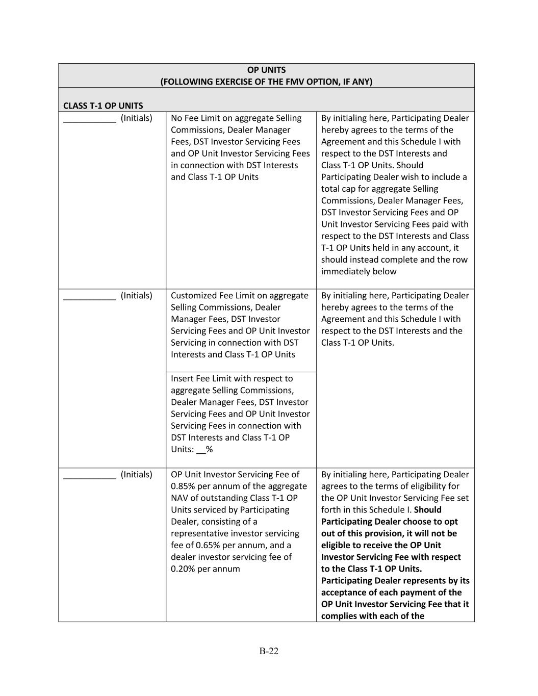 B-22 OP UNITS (FOLLOWING EXERCISE OF THE FMV OPTION, IF ANY) CLASS T-1 OP UNITS ___________ (Initials) No Fee Limit on aggregate Selling Commissions, Dealer Manager Fees, DST Investor Servicing Fees and OP Unit Investor Servicing Fees in connection with DST Interests and Class T-1 OP Units By initialing here, Participating Dealer hereby agrees to the terms of the Agreement and this Schedule I with respect to the DST Interests and Class T-1 OP Units. Should Participating Dealer wish to include a total cap for aggregate Selling Commissions, Dealer Manager Fees, DST Investor Servicing Fees and OP Unit Investor Servicing Fees paid with respect to the DST Interests and Class T-1 OP Units held in any account, it should instead complete and the row immediately below ___________ (Initials) Customized Fee Limit on aggregate Selling Commissions, Dealer Manager Fees, DST Investor Servicing Fees and OP Unit Investor Servicing in connection with DST Interests and Class T-1 OP Units By initialing here, Participating Dealer hereby agrees to the terms of the Agreement and this Schedule I with respect to the DST Interests and the Class T-1 OP Units. Insert Fee Limit with respect to aggregate Selling Commissions, Dealer Manager Fees, DST Investor Servicing Fees and OP Unit Investor Servicing Fees in connection with DST Interests and Class T-1 OP Units: __% ___________ (Initials) OP Unit Investor Servicing Fee of 0.85% per annum of the aggregate NAV of outstanding Class T-1 OP Units serviced by Participating Dealer, consisting of a representative investor servicing fee of 0.65% per annum, and a dealer investor servicing fee of 0.20% per annum By initialing here, Participating Dealer agrees to the terms of eligibility for the OP Unit Investor Servicing Fee set forth in this Schedule I. Should Participating Dealer choose to opt out of this provision, it will not be eligible to receive the OP Unit Investor Servicing Fee with respect to the Class T-1 OP Units. Participating Dealer represents by its acceptance of each payment of the OP Unit Investor Servicing Fee that it complies with each of the