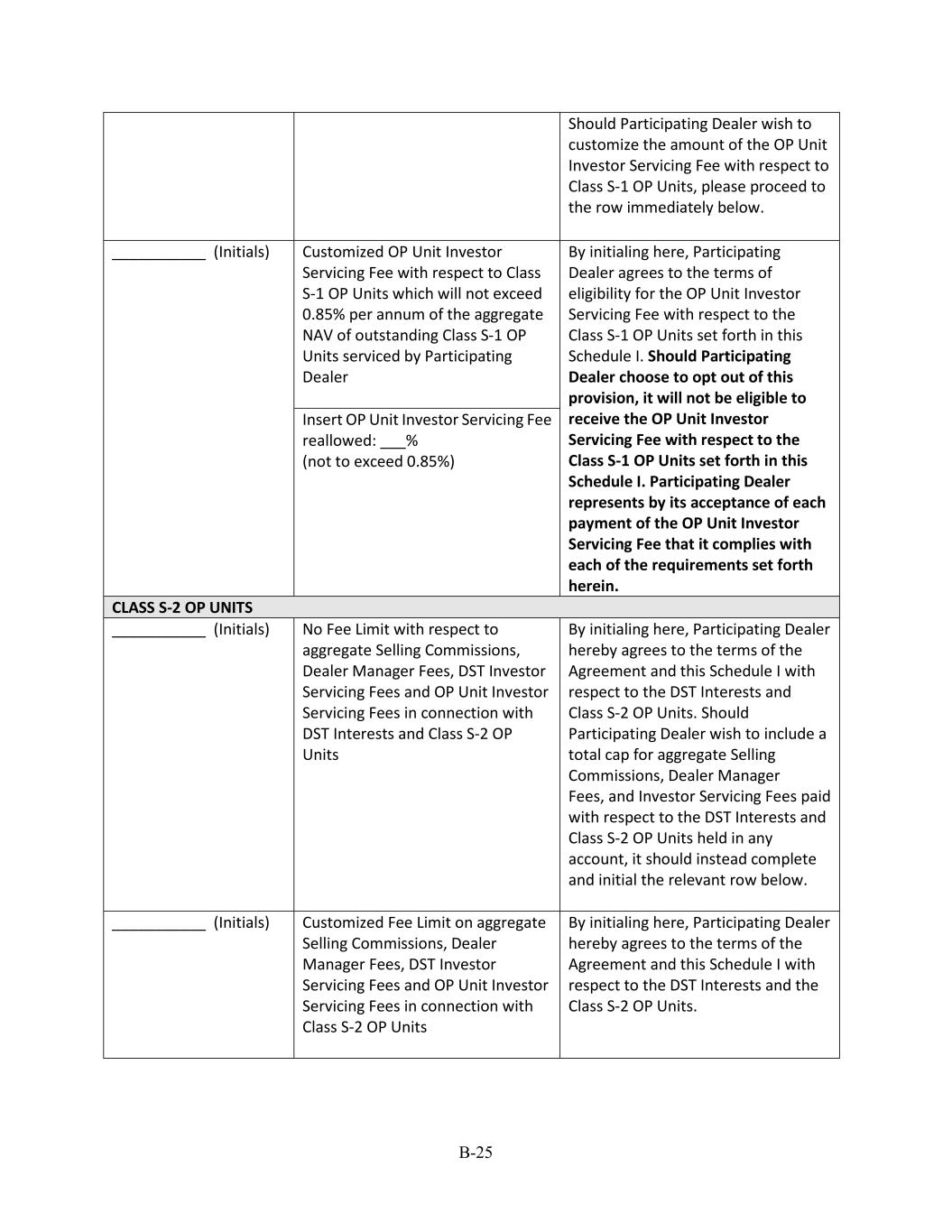 B-25 Should Participating Dealer wish to customize the amount of the OP Unit Investor Servicing Fee with respect to Class S-1 OP Units, please proceed to the row immediately below. ___________ (Initials) Customized OP Unit Investor Servicing Fee with respect to Class S-1 OP Units which will not exceed 0.85% per annum of the aggregate NAV of outstanding Class S-1 OP Units serviced by Participating Dealer By initialing here, Participating Dealer agrees to the terms of eligibility for the OP Unit Investor Servicing Fee with respect to the Class S-1 OP Units set forth in this Schedule I. Should Participating Dealer choose to opt out of this provision, it will not be eligible to receive the OP Unit Investor Servicing Fee with respect to the Class S-1 OP Units set forth in this Schedule I. Participating Dealer represents by its acceptance of each payment of the OP Unit Investor Servicing Fee that it complies with each of the requirements set forth herein. Insert OP Unit Investor Servicing Fee reallowed: ___% (not to exceed 0.85%) CLASS S-2 OP UNITS ___________ (Initials) No Fee Limit with respect to aggregate Selling Commissions, Dealer Manager Fees, DST Investor Servicing Fees and OP Unit Investor Servicing Fees in connection with DST Interests and Class S-2 OP Units By initialing here, Participating Dealer hereby agrees to the terms of the Agreement and this Schedule I with respect to the DST Interests and Class S-2 OP Units. Should Participating Dealer wish to include a total cap for aggregate Selling Commissions, Dealer Manager Fees, and Investor Servicing Fees paid with respect to the DST Interests and Class S-2 OP Units held in any account, it should instead complete and initial the relevant row below. ___________ (Initials) Customized Fee Limit on aggregate Selling Commissions, Dealer Manager Fees, DST Investor Servicing Fees and OP Unit Investor Servicing Fees in connection with Class S-2 OP Units By initialing here, Participating Dealer hereby agrees to the terms of the Agreement and this Schedule I with respect to the DST Interests and the Class S-2 OP Units.