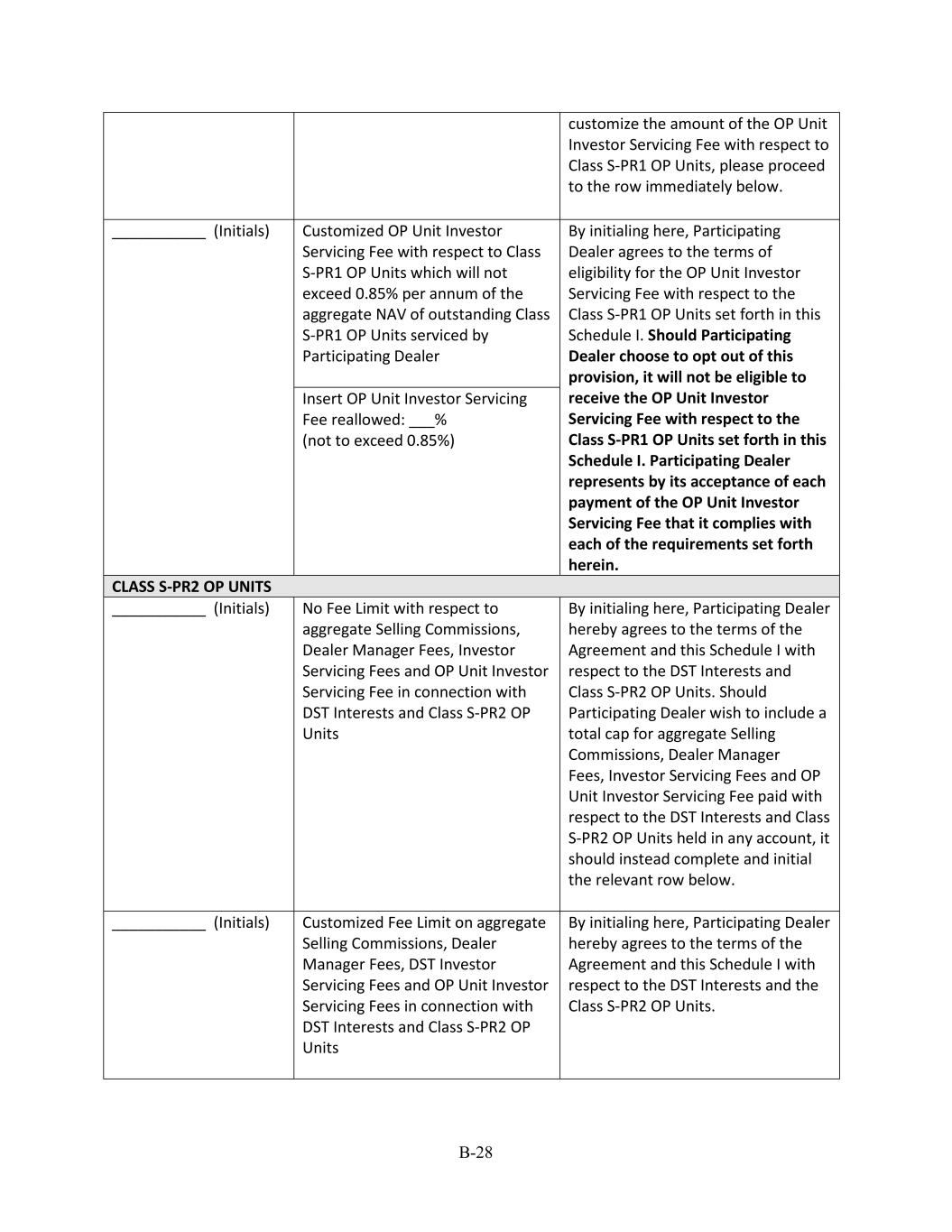 B-28 customize the amount of the OP Unit Investor Servicing Fee with respect to Class S-PR1 OP Units, please proceed to the row immediately below. ___________ (Initials) Customized OP Unit Investor Servicing Fee with respect to Class S-PR1 OP Units which will not exceed 0.85% per annum of the aggregate NAV of outstanding Class S-PR1 OP Units serviced by Participating Dealer By initialing here, Participating Dealer agrees to the terms of eligibility for the OP Unit Investor Servicing Fee with respect to the Class S-PR1 OP Units set forth in this Schedule I. Should Participating Dealer choose to opt out of this provision, it will not be eligible to receive the OP Unit Investor Servicing Fee with respect to the Class S-PR1 OP Units set forth in this Schedule I. Participating Dealer represents by its acceptance of each payment of the OP Unit Investor Servicing Fee that it complies with each of the requirements set forth herein. Insert OP Unit Investor Servicing Fee reallowed: ___% (not to exceed 0.85%) CLASS S-PR2 OP UNITS ___________ (Initials) No Fee Limit with respect to aggregate Selling Commissions, Dealer Manager Fees, Investor Servicing Fees and OP Unit Investor Servicing Fee in connection with DST Interests and Class S-PR2 OP Units By initialing here, Participating Dealer hereby agrees to the terms of the Agreement and this Schedule I with respect to the DST Interests and Class S-PR2 OP Units. Should Participating Dealer wish to include a total cap for aggregate Selling Commissions, Dealer Manager Fees, Investor Servicing Fees and OP Unit Investor Servicing Fee paid with respect to the DST Interests and Class S-PR2 OP Units held in any account, it should instead complete and initial the relevant row below. ___________ (Initials) Customized Fee Limit on aggregate Selling Commissions, Dealer Manager Fees, DST Investor Servicing Fees and OP Unit Investor Servicing Fees in connection with DST Interests and Class S-PR2 OP Units By initialing here, Participating Dealer hereby agrees to the terms of the Agreement and this Schedule I with respect to the DST Interests and the Class S-PR2 OP Units.