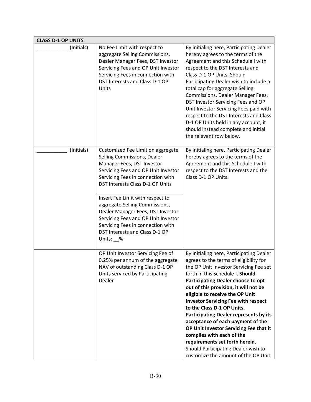 B-30 CLASS D-1 OP UNITS ___________ (Initials) No Fee Limit with respect to aggregate Selling Commissions, Dealer Manager Fees, DST Investor Servicing Fees and OP Unit Investor Servicing Fees in connection with DST Interests and Class D-1 OP Units By initialing here, Participating Dealer hereby agrees to the terms of the Agreement and this Schedule I with respect to the DST Interests and Class D-1 OP Units. Should Participating Dealer wish to include a total cap for aggregate Selling Commissions, Dealer Manager Fees, DST Investor Servicing Fees and OP Unit Investor Servicing Fees paid with respect to the DST Interests and Class D-1 OP Units held in any account, it should instead complete and initial the relevant row below. ___________ (Initials) Customized Fee Limit on aggregate Selling Commissions, Dealer Manager Fees, DST Investor Servicing Fees and OP Unit Investor Servicing Fees in connection with DST Interests Class D-1 OP Units By initialing here, Participating Dealer hereby agrees to the terms of the Agreement and this Schedule I with respect to the DST Interests and the Class D-1 OP Units. Insert Fee Limit with respect to aggregate Selling Commissions, Dealer Manager Fees, DST Investor Servicing Fees and OP Unit Investor Servicing Fees in connection with DST Interests and Class D-1 OP Units: __% OP Unit Investor Servicing Fee of 0.25% per annum of the aggregate NAV of outstanding Class D-1 OP Units serviced by Participating Dealer By initialing here, Participating Dealer agrees to the terms of eligibility for the OP Unit Investor Servicing Fee set forth in this Schedule I. Should Participating Dealer choose to opt out of this provision, it will not be eligible to receive the OP Unit Investor Servicing Fee with respect to the Class D-1 OP Units. Participating Dealer represents by its acceptance of each payment of the OP Unit Investor Servicing Fee that it complies with each of the requirements set forth herein. Should Participating Dealer wish to customize the amount of the OP Unit