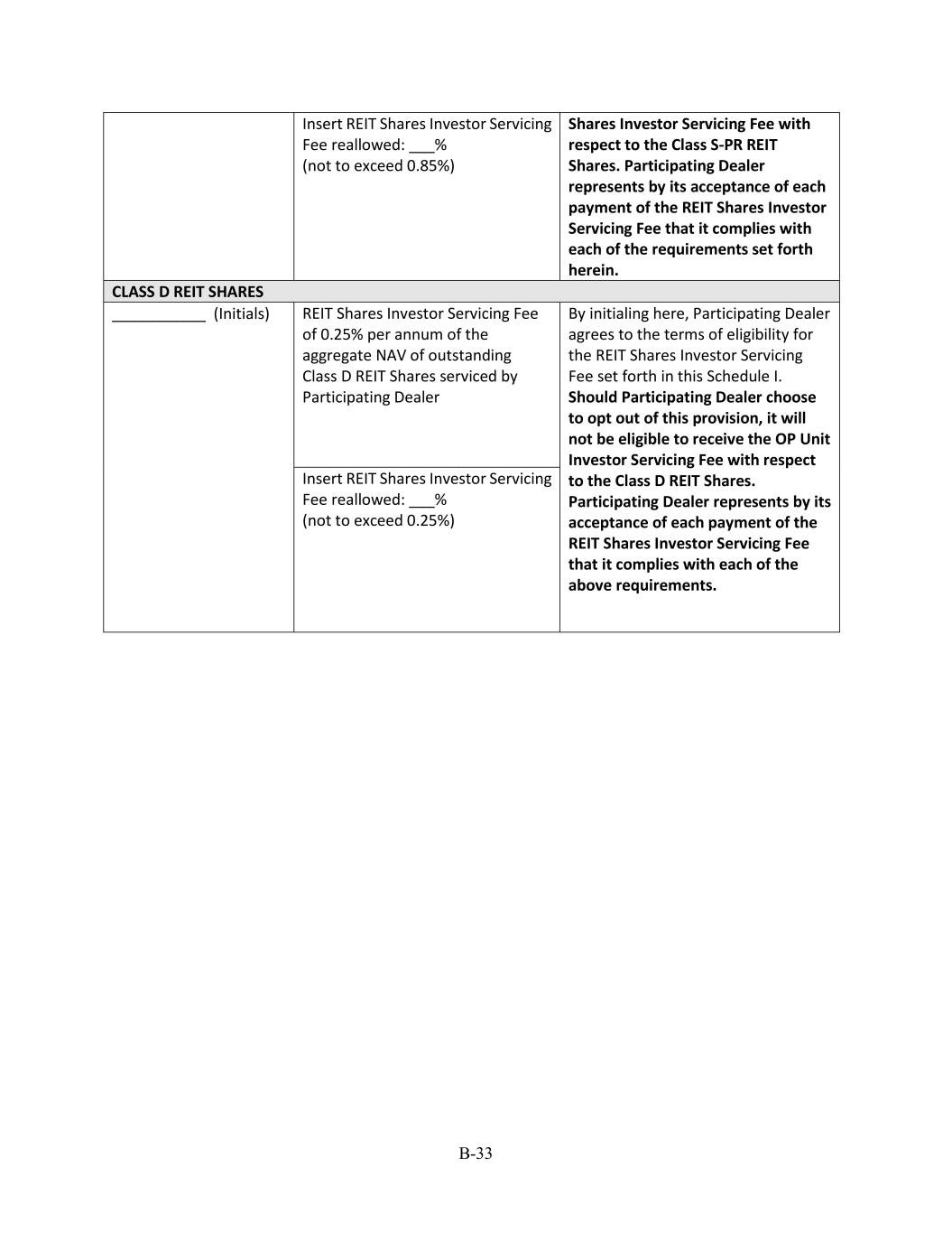 B-33 Insert REIT Shares Investor Servicing Fee reallowed: ___% (not to exceed 0.85%) Shares Investor Servicing Fee with respect to the Class S-PR REIT Shares. Participating Dealer represents by its acceptance of each payment of the REIT Shares Investor Servicing Fee that it complies with each of the requirements set forth herein. CLASS D REIT SHARES ___________ (Initials) REIT Shares Investor Servicing Fee of 0.25% per annum of the aggregate NAV of outstanding Class D REIT Shares serviced by Participating Dealer By initialing here, Participating Dealer agrees to the terms of eligibility for the REIT Shares Investor Servicing Fee set forth in this Schedule I. Should Participating Dealer choose to opt out of this provision, it will not be eligible to receive the OP Unit Investor Servicing Fee with respect to the Class D REIT Shares. Participating Dealer represents by its acceptance of each payment of the REIT Shares Investor Servicing Fee that it complies with each of the above requirements. Insert REIT Shares Investor Servicing Fee reallowed: ___% (not to exceed 0.25%)