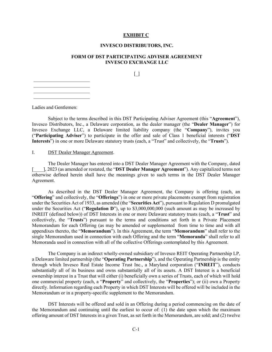 C-1 EXHIBIT C INVESCO DISTRIBUTORS, INC. FORM OF DST PARTICIPATING ADVISER AGREEMENT INVESCO EXCHANGE LLC [_] _______________________ _______________________ _______________________ _______________________ Ladies and Gentlemen: Subject to the terms described in this DST Participating Adviser Agreement (this “Agreement”), Invesco Distributors, Inc., a Delaware corporation, as the dealer manager (the “Dealer Manager”) for Invesco Exchange LLC, a Delaware limited liability company (the “Company”), invites you (“Participating Adviser”) to participate in the offer and sale of Class 1 beneficial interests (“DST Interests”) in one or more Delaware statutory trusts (each, a “Trust” and collectively, the “Trusts”). I. DST Dealer Manager Agreement. The Dealer Manager has entered into a DST Dealer Manager Agreement with the Company, dated [____], 2023 (as amended or restated, the “DST Dealer Manager Agreement”). Any capitalized terms not otherwise defined herein shall have the meanings given to such terms in the DST Dealer Manager Agreement. As described in the DST Dealer Manager Agreement, the Company is offering (each, an “Offering” and collectively, the “Offerings”) in one or more private placements exempt from registration under the Securities Act of 1933, as amended (the “Securities Act”), pursuant to Regulation D promulgated under the Securities Act (“Regulation D”), up to $3,000,000,000 (such amount as may be increased by INREIT (defined below)) of DST Interests in one or more Delaware statutory trusts (each, a “Trust” and collectively, the “Trusts”) pursuant to the terms and conditions set forth in a Private Placement Memorandum for each Offering (as may be amended or supplemented from time to time and with all appendixes thereto, the “Memorandum”). In this Agreement, the term “Memorandum” shall refer to the single Memorandum used in connection with each Offering and the term “Memoranda” shall refer to all Memoranda used in connection with all of the collective Offerings contemplated by this Agreement. The Company is an indirect wholly-owned subsidiary of Invesco REIT Operating Partnership LP, a Delaware limited partnership (the “Operating Partnership”), and the Operating Partnership is the entity through which Invesco Real Estate Income Trust Inc., a Maryland corporation (“INREIT”), conducts substantially all of its business and owns substantially all of its assets. A DST Interest is a beneficial ownership interest in a Trust that will either (i) beneficially own a series of Trusts, each of which will hold one commercial property (each, a “Property” and collectively, the “Properties”); or (ii) own a Property directly. Information regarding each Property in which DST Interests will be offered will be included in the Memorandum or in a property-specific supplement to the Memorandum. DST Interests will be offered and sold in an Offering during a period commencing on the date of the Memorandum and continuing until the earliest to occur of: (1) the date upon which the maximum offering amount of DST Interests in a given Trust, as set forth in the Memorandum, are sold; and (2) twelve