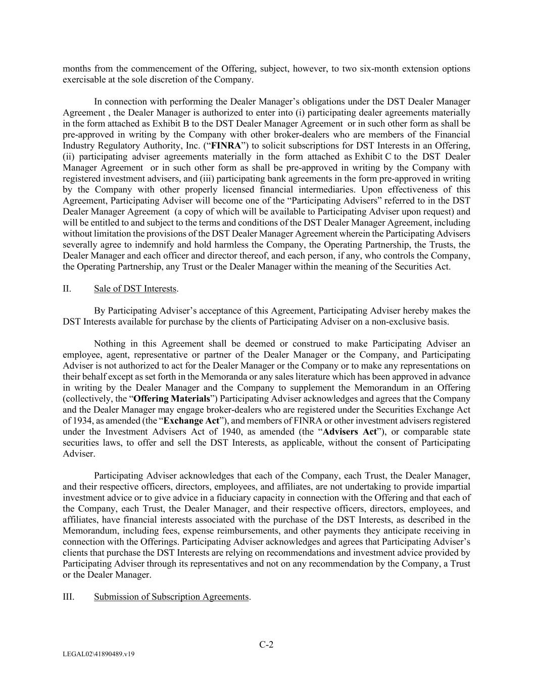 C-2 LEGAL02\41890489.v19 months from the commencement of the Offering, subject, however, to two six-month extension options exercisable at the sole discretion of the Company. In connection with performing the Dealer Manager’s obligations under the DST Dealer Manager Agreement , the Dealer Manager is authorized to enter into (i) participating dealer agreements materially in the form attached as Exhibit B to the DST Dealer Manager Agreement or in such other form as shall be pre-approved in writing by the Company with other broker-dealers who are members of the Financial Industry Regulatory Authority, Inc. (“FINRA”) to solicit subscriptions for DST Interests in an Offering, (ii) participating adviser agreements materially in the form attached as Exhibit C to the DST Dealer Manager Agreement or in such other form as shall be pre-approved in writing by the Company with registered investment advisers, and (iii) participating bank agreements in the form pre-approved in writing by the Company with other properly licensed financial intermediaries. Upon effectiveness of this Agreement, Participating Adviser will become one of the “Participating Advisers” referred to in the DST Dealer Manager Agreement (a copy of which will be available to Participating Adviser upon request) and will be entitled to and subject to the terms and conditions of the DST Dealer Manager Agreement, including without limitation the provisions of the DST Dealer Manager Agreement wherein the Participating Advisers severally agree to indemnify and hold harmless the Company, the Operating Partnership, the Trusts, the Dealer Manager and each officer and director thereof, and each person, if any, who controls the Company, the Operating Partnership, any Trust or the Dealer Manager within the meaning of the Securities Act. II. Sale of DST Interests. By Participating Adviser’s acceptance of this Agreement, Participating Adviser hereby makes the DST Interests available for purchase by the clients of Participating Adviser on a non-exclusive basis. Nothing in this Agreement shall be deemed or construed to make Participating Adviser an employee, agent, representative or partner of the Dealer Manager or the Company, and Participating Adviser is not authorized to act for the Dealer Manager or the Company or to make any representations on their behalf except as set forth in the Memoranda or any sales literature which has been approved in advance in writing by the Dealer Manager and the Company to supplement the Memorandum in an Offering (collectively, the “Offering Materials”) Participating Adviser acknowledges and agrees that the Company and the Dealer Manager may engage broker-dealers who are registered under the Securities Exchange Act of 1934, as amended (the “Exchange Act”), and members of FINRA or other investment advisers registered under the Investment Advisers Act of 1940, as amended (the “Advisers Act”), or comparable state securities laws, to offer and sell the DST Interests, as applicable, without the consent of Participating Adviser. Participating Adviser acknowledges that each of the Company, each Trust, the Dealer Manager, and their respective officers, directors, employees, and affiliates, are not undertaking to provide impartial investment advice or to give advice in a fiduciary capacity in connection with the Offering and that each of the Company, each Trust, the Dealer Manager, and their respective officers, directors, employees, and affiliates, have financial interests associated with the purchase of the DST Interests, as described in the Memorandum, including fees, expense reimbursements, and other payments they anticipate receiving in connection with the Offerings. Participating Adviser acknowledges and agrees that Participating Adviser’s clients that purchase the DST Interests are relying on recommendations and investment advice provided by Participating Adviser through its representatives and not on any recommendation by the Company, a Trust or the Dealer Manager. III. Submission of Subscription Agreements.