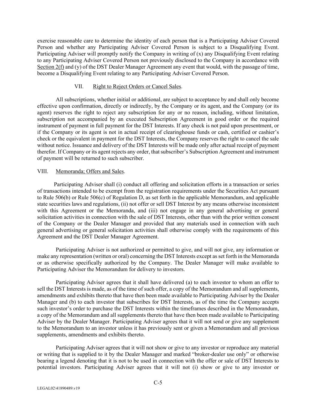 C-5 LEGAL02\41890489.v19 exercise reasonable care to determine the identity of each person that is a Participating Adviser Covered Person and whether any Participating Adviser Covered Person is subject to a Disqualifying Event. Participating Adviser will promptly notify the Company in writing of (x) any Disqualifying Event relating to any Participating Adviser Covered Person not previously disclosed to the Company in accordance with Section 2(f) and (y) of the DST Dealer Manager Agreement any event that would, with the passage of time, become a Disqualifying Event relating to any Participating Adviser Covered Person. VII. Right to Reject Orders or Cancel Sales. All subscriptions, whether initial or additional, are subject to acceptance by and shall only become effective upon confirmation, directly or indirectly, by the Company or its agent, and the Company (or its agent) reserves the right to reject any subscription for any or no reason, including, without limitation, subscription not accompanied by an executed Subscription Agreement in good order or the required instrument of payment in full payment for the DST Interests. If any check is not paid upon presentment, or if the Company or its agent is not in actual receipt of clearinghouse funds or cash, certified or cashier’s check or the equivalent in payment for the DST Interests, the Company reserves the right to cancel the sale without notice. Issuance and delivery of the DST Interests will be made only after actual receipt of payment therefor. If Company or its agent rejects any order, that subscriber’s Subscription Agreement and instrument of payment will be returned to such subscriber. VIII. Memoranda; Offers and Sales. Participating Adviser shall (i) conduct all offering and solicitation efforts in a transaction or series of transactions intended to be exempt from the registration requirements under the Securities Act pursuant to Rule 506(b) or Rule 506(c) of Regulation D, as set forth in the applicable Memorandum, and applicable state securities laws and regulations, (ii) not offer or sell DST Interest by any means otherwise inconsistent with this Agreement or the Memoranda, and (iii) not engage in any general advertising or general solicitation activities in connection with the sale of DST Interests, other than with the prior written consent of the Company or the Dealer Manager and provided that any materials used in connection with such general advertising or general solicitation activities shall otherwise comply with the requirements of this Agreement and the DST Dealer Manager Agreement. Participating Adviser is not authorized or permitted to give, and will not give, any information or make any representation (written or oral) concerning the DST Interests except as set forth in the Memoranda or as otherwise specifically authorized by the Company. The Dealer Manager will make available to Participating Adviser the Memorandum for delivery to investors. Participating Adviser agrees that it shall have delivered (a) to each investor to whom an offer to sell the DST Interests is made, as of the time of such offer, a copy of the Memorandum and all supplements, amendments and exhibits thereto that have then been made available to Participating Adviser by the Dealer Manager and (b) to each investor that subscribes for DST Interests, as of the time the Company accepts such investor’s order to purchase the DST Interests within the timeframes described in the Memorandum, a copy of the Memorandum and all supplements thereto that have then been made available to Participating Adviser by the Dealer Manager. Participating Adviser agrees that it will not send or give any supplement to the Memorandum to an investor unless it has previously sent or given a Memorandum and all previous supplements, amendments and exhibits thereto. Participating Adviser agrees that it will not show or give to any investor or reproduce any material or writing that is supplied to it by the Dealer Manager and marked “broker-dealer use only” or otherwise bearing a legend denoting that it is not to be used in connection with the offer or sale of DST Interests to potential investors. Participating Adviser agrees that it will not (i) show or give to any investor or