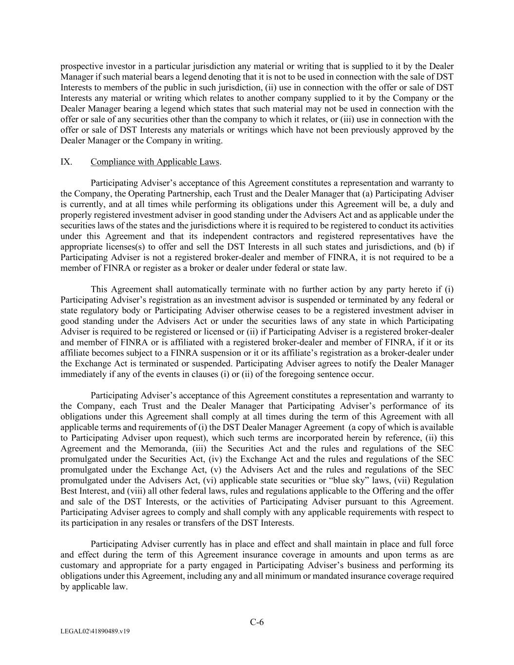 C-6 LEGAL02\41890489.v19 prospective investor in a particular jurisdiction any material or writing that is supplied to it by the Dealer Manager if such material bears a legend denoting that it is not to be used in connection with the sale of DST Interests to members of the public in such jurisdiction, (ii) use in connection with the offer or sale of DST Interests any material or writing which relates to another company supplied to it by the Company or the Dealer Manager bearing a legend which states that such material may not be used in connection with the offer or sale of any securities other than the company to which it relates, or (iii) use in connection with the offer or sale of DST Interests any materials or writings which have not been previously approved by the Dealer Manager or the Company in writing. IX. Compliance with Applicable Laws. Participating Adviser’s acceptance of this Agreement constitutes a representation and warranty to the Company, the Operating Partnership, each Trust and the Dealer Manager that (a) Participating Adviser is currently, and at all times while performing its obligations under this Agreement will be, a duly and properly registered investment adviser in good standing under the Advisers Act and as applicable under the securities laws of the states and the jurisdictions where it is required to be registered to conduct its activities under this Agreement and that its independent contractors and registered representatives have the appropriate licenses(s) to offer and sell the DST Interests in all such states and jurisdictions, and (b) if Participating Adviser is not a registered broker-dealer and member of FINRA, it is not required to be a member of FINRA or register as a broker or dealer under federal or state law. This Agreement shall automatically terminate with no further action by any party hereto if (i) Participating Adviser’s registration as an investment advisor is suspended or terminated by any federal or state regulatory body or Participating Adviser otherwise ceases to be a registered investment adviser in good standing under the Advisers Act or under the securities laws of any state in which Participating Adviser is required to be registered or licensed or (ii) if Participating Adviser is a registered broker-dealer and member of FINRA or is affiliated with a registered broker-dealer and member of FINRA, if it or its affiliate becomes subject to a FINRA suspension or it or its affiliate’s registration as a broker-dealer under the Exchange Act is terminated or suspended. Participating Adviser agrees to notify the Dealer Manager immediately if any of the events in clauses (i) or (ii) of the foregoing sentence occur. Participating Adviser’s acceptance of this Agreement constitutes a representation and warranty to the Company, each Trust and the Dealer Manager that Participating Adviser’s performance of its obligations under this Agreement shall comply at all times during the term of this Agreement with all applicable terms and requirements of (i) the DST Dealer Manager Agreement (a copy of which is available to Participating Adviser upon request), which such terms are incorporated herein by reference, (ii) this Agreement and the Memoranda, (iii) the Securities Act and the rules and regulations of the SEC promulgated under the Securities Act, (iv) the Exchange Act and the rules and regulations of the SEC promulgated under the Exchange Act, (v) the Advisers Act and the rules and regulations of the SEC promulgated under the Advisers Act, (vi) applicable state securities or “blue sky” laws, (vii) Regulation Best Interest, and (viii) all other federal laws, rules and regulations applicable to the Offering and the offer and sale of the DST Interests, or the activities of Participating Adviser pursuant to this Agreement. Participating Adviser agrees to comply and shall comply with any applicable requirements with respect to its participation in any resales or transfers of the DST Interests. Participating Adviser currently has in place and effect and shall maintain in place and full force and effect during the term of this Agreement insurance coverage in amounts and upon terms as are customary and appropriate for a party engaged in Participating Adviser’s business and performing its obligations under this Agreement, including any and all minimum or mandated insurance coverage required by applicable law.