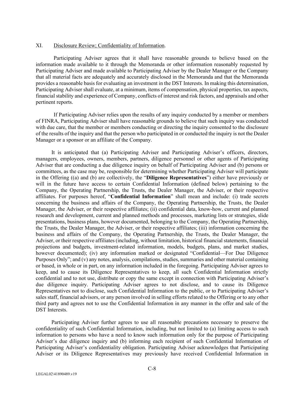 C-8 LEGAL02\41890489.v19 XI. Disclosure Review; Confidentiality of Information. Participating Adviser agrees that it shall have reasonable grounds to believe based on the information made available to it through the Memoranda or other information reasonably requested by Participating Adviser and made available to Participating Adviser by the Dealer Manager or the Company that all material facts are adequately and accurately disclosed in the Memoranda and that the Memoranda provides a reasonable basis for evaluating an investment in the DST Interests. In making this determination, Participating Adviser shall evaluate, at a minimum, items of compensation, physical properties, tax aspects, financial stability and experience of Company, conflicts of interest and risk factors, and appraisals and other pertinent reports. If Participating Adviser relies upon the results of any inquiry conducted by a member or members of FINRA, Participating Adviser shall have reasonable grounds to believe that such inquiry was conducted with due care, that the member or members conducting or directing the inquiry consented to the disclosure of the results of the inquiry and that the person who participated in or conducted the inquiry is not the Dealer Manager or a sponsor or an affiliate of the Company. It is anticipated that (a) Participating Adviser and Participating Adviser’s officers, directors, managers, employees, owners, members, partners, diligence personnel or other agents of Participating Adviser that are conducting a due diligence inquiry on behalf of Participating Adviser and (b) persons or committees, as the case may be, responsible for determining whether Participating Adviser will participate in the Offering ((a) and (b) are collectively, the “Diligence Representatives”) either have previously or will in the future have access to certain Confidential Information (defined below) pertaining to the Company, the Operating Partnership, the Trusts, the Dealer Manager, the Adviser, or their respective affiliates. For purposes hereof, “Confidential Information” shall mean and include: (i) trade secrets concerning the business and affairs of the Company, the Operating Partnership, the Trusts, the Dealer Manager, the Adviser, or their respective affiliates; (ii) confidential data, know-how, current and planned research and development, current and planned methods and processes, marketing lists or strategies, slide presentations, business plans, however documented, belonging to the Company, the Operating Partnership, the Trusts, the Dealer Manager, the Adviser, or their respective affiliates; (iii) information concerning the business and affairs of the Company, the Operating Partnership, the Trusts, the Dealer Manager, the Adviser, or their respective affiliates (including, without limitation, historical financial statements, financial projections and budgets, investment-related information, models, budgets, plans, and market studies, however documented); (iv) any information marked or designated “Confidential—For Due Diligence Purposes Only”; and (v) any notes, analysis, compilations, studies, summaries and other material containing or based, in whole or in part, on any information included in the foregoing. Participating Adviser agrees to keep, and to cause its Diligence Representatives to keep, all such Confidential Information strictly confidential and to not use, distribute or copy the same except in connection with Participating Adviser’s due diligence inquiry. Participating Adviser agrees to not disclose, and to cause its Diligence Representatives not to disclose, such Confidential Information to the public, or to Participating Adviser’s sales staff, financial advisors, or any person involved in selling efforts related to the Offering or to any other third party and agrees not to use the Confidential Information in any manner in the offer and sale of the DST Interests. Participating Adviser further agrees to use all reasonable precautions necessary to preserve the confidentiality of such Confidential Information, including, but not limited to (a) limiting access to such information to persons who have a need to know such information only for the purpose of Participating Adviser’s due diligence inquiry and (b) informing each recipient of such Confidential Information of Participating Adviser’s confidentiality obligation. Participating Adviser acknowledges that Participating Adviser or its Diligence Representatives may previously have received Confidential Information in