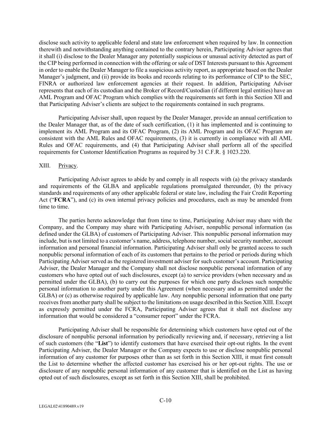 C-10 LEGAL02\41890489.v19 disclose such activity to applicable federal and state law enforcement when required by law. In connection therewith and notwithstanding anything contained to the contrary herein, Participating Adviser agrees that it shall (i) disclose to the Dealer Manager any potentially suspicious or unusual activity detected as part of the CIP being performed in connection with the offering or sale of DST Interests pursuant to this Agreement in order to enable the Dealer Manager to file a suspicious activity report, as appropriate based on the Dealer Manager’s judgment, and (ii) provide its books and records relating to its performance of CIP to the SEC, FINRA or authorized law enforcement agencies at their request. In addition, Participating Adviser represents that each of its custodian and the Broker of Record/Custodian (if different legal entities) have an AML Program and OFAC Program which complies with the requirements set forth in this Section XII and that Participating Adviser’s clients are subject to the requirements contained in such programs. Participating Adviser shall, upon request by the Dealer Manager, provide an annual certification to the Dealer Manager that, as of the date of such certification, (1) it has implemented and is continuing to implement its AML Program and its OFAC Program, (2) its AML Program and its OFAC Program are consistent with the AML Rules and OFAC requirements, (3) it is currently in compliance with all AML Rules and OFAC requirements, and (4) that Participating Adviser shall perform all of the specified requirements for Customer Identification Programs as required by 31 C.F.R. § 1023.220. XIII. Privacy. Participating Adviser agrees to abide by and comply in all respects with (a) the privacy standards and requirements of the GLBA and applicable regulations promulgated thereunder, (b) the privacy standards and requirements of any other applicable federal or state law, including the Fair Credit Reporting Act (“FCRA”), and (c) its own internal privacy policies and procedures, each as may be amended from time to time. The parties hereto acknowledge that from time to time, Participating Adviser may share with the Company, and the Company may share with Participating Adviser, nonpublic personal information (as defined under the GLBA) of customers of Participating Adviser. This nonpublic personal information may include, but is not limited to a customer’s name, address, telephone number, social security number, account information and personal financial information. Participating Adviser shall only be granted access to such nonpublic personal information of each of its customers that pertains to the period or periods during which Participating Adviser served as the registered investment adviser for such customer’s account. Participating Adviser, the Dealer Manager and the Company shall not disclose nonpublic personal information of any customers who have opted out of such disclosures, except (a) to service providers (when necessary and as permitted under the GLBA), (b) to carry out the purposes for which one party discloses such nonpublic personal information to another party under this Agreement (when necessary and as permitted under the GLBA) or (c) as otherwise required by applicable law. Any nonpublic personal information that one party receives from another party shall be subject to the limitations on usage described in this Section XIII. Except as expressly permitted under the FCRA, Participating Adviser agrees that it shall not disclose any information that would be considered a “consumer report” under the FCRA. Participating Adviser shall be responsible for determining which customers have opted out of the disclosure of nonpublic personal information by periodically reviewing and, if necessary, retrieving a list of such customers (the “List”) to identify customers that have exercised their opt-out rights. In the event Participating Adviser, the Dealer Manager or the Company expects to use or disclose nonpublic personal information of any customer for purposes other than as set forth in this Section XIII, it must first consult the List to determine whether the affected customer has exercised his or her opt-out rights. The use or disclosure of any nonpublic personal information of any customer that is identified on the List as having opted out of such disclosures, except as set forth in this Section XIII, shall be prohibited.