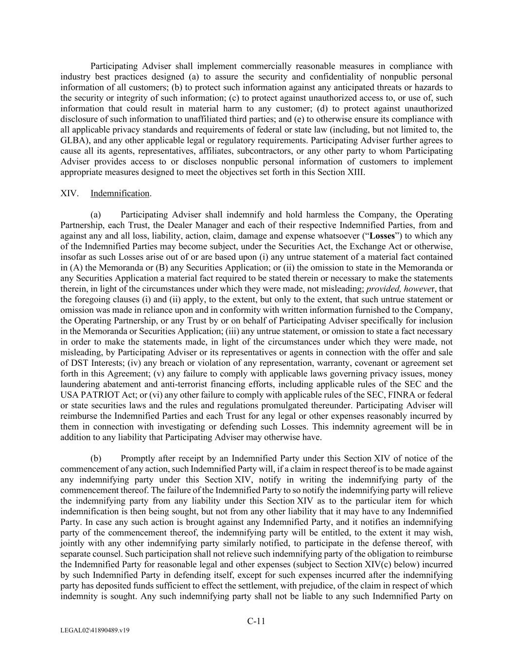C-11 LEGAL02\41890489.v19 Participating Adviser shall implement commercially reasonable measures in compliance with industry best practices designed (a) to assure the security and confidentiality of nonpublic personal information of all customers; (b) to protect such information against any anticipated threats or hazards to the security or integrity of such information; (c) to protect against unauthorized access to, or use of, such information that could result in material harm to any customer; (d) to protect against unauthorized disclosure of such information to unaffiliated third parties; and (e) to otherwise ensure its compliance with all applicable privacy standards and requirements of federal or state law (including, but not limited to, the GLBA), and any other applicable legal or regulatory requirements. Participating Adviser further agrees to cause all its agents, representatives, affiliates, subcontractors, or any other party to whom Participating Adviser provides access to or discloses nonpublic personal information of customers to implement appropriate measures designed to meet the objectives set forth in this Section XIII. XIV. Indemnification. (a) Participating Adviser shall indemnify and hold harmless the Company, the Operating Partnership, each Trust, the Dealer Manager and each of their respective Indemnified Parties, from and against any and all loss, liability, action, claim, damage and expense whatsoever (“Losses”) to which any of the Indemnified Parties may become subject, under the Securities Act, the Exchange Act or otherwise, insofar as such Losses arise out of or are based upon (i) any untrue statement of a material fact contained in (A) the Memoranda or (B) any Securities Application; or (ii) the omission to state in the Memoranda or any Securities Application a material fact required to be stated therein or necessary to make the statements therein, in light of the circumstances under which they were made, not misleading; provided, however, that the foregoing clauses (i) and (ii) apply, to the extent, but only to the extent, that such untrue statement or omission was made in reliance upon and in conformity with written information furnished to the Company, the Operating Partnership, or any Trust by or on behalf of Participating Adviser specifically for inclusion in the Memoranda or Securities Application; (iii) any untrue statement, or omission to state a fact necessary in order to make the statements made, in light of the circumstances under which they were made, not misleading, by Participating Adviser or its representatives or agents in connection with the offer and sale of DST Interests; (iv) any breach or violation of any representation, warranty, covenant or agreement set forth in this Agreement; (v) any failure to comply with applicable laws governing privacy issues, money laundering abatement and anti-terrorist financing efforts, including applicable rules of the SEC and the USA PATRIOT Act; or (vi) any other failure to comply with applicable rules of the SEC, FINRA or federal or state securities laws and the rules and regulations promulgated thereunder. Participating Adviser will reimburse the Indemnified Parties and each Trust for any legal or other expenses reasonably incurred by them in connection with investigating or defending such Losses. This indemnity agreement will be in addition to any liability that Participating Adviser may otherwise have. (b) Promptly after receipt by an Indemnified Party under this Section XIV of notice of the commencement of any action, such Indemnified Party will, if a claim in respect thereof is to be made against any indemnifying party under this Section XIV, notify in writing the indemnifying party of the commencement thereof. The failure of the Indemnified Party to so notify the indemnifying party will relieve the indemnifying party from any liability under this Section XIV as to the particular item for which indemnification is then being sought, but not from any other liability that it may have to any Indemnified Party. In case any such action is brought against any Indemnified Party, and it notifies an indemnifying party of the commencement thereof, the indemnifying party will be entitled, to the extent it may wish, jointly with any other indemnifying party similarly notified, to participate in the defense thereof, with separate counsel. Such participation shall not relieve such indemnifying party of the obligation to reimburse the Indemnified Party for reasonable legal and other expenses (subject to Section XIV(c) below) incurred by such Indemnified Party in defending itself, except for such expenses incurred after the indemnifying party has deposited funds sufficient to effect the settlement, with prejudice, of the claim in respect of which indemnity is sought. Any such indemnifying party shall not be liable to any such Indemnified Party on